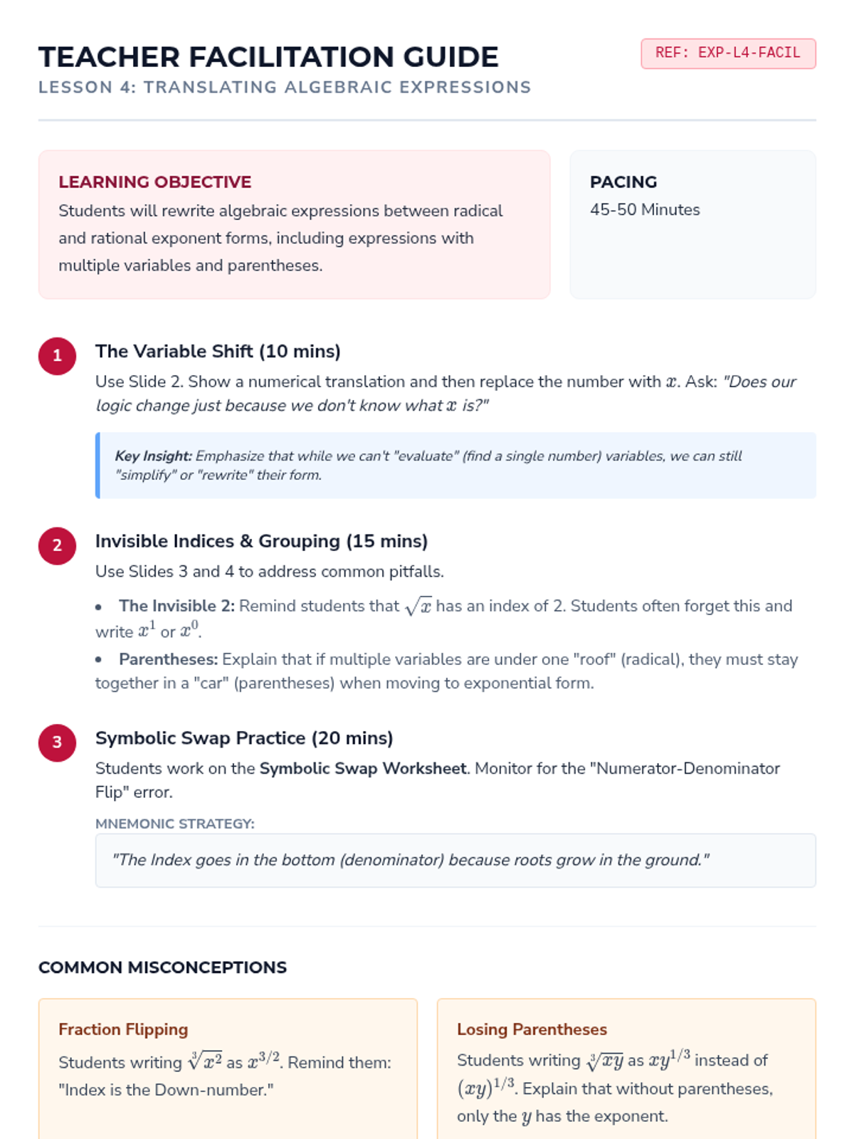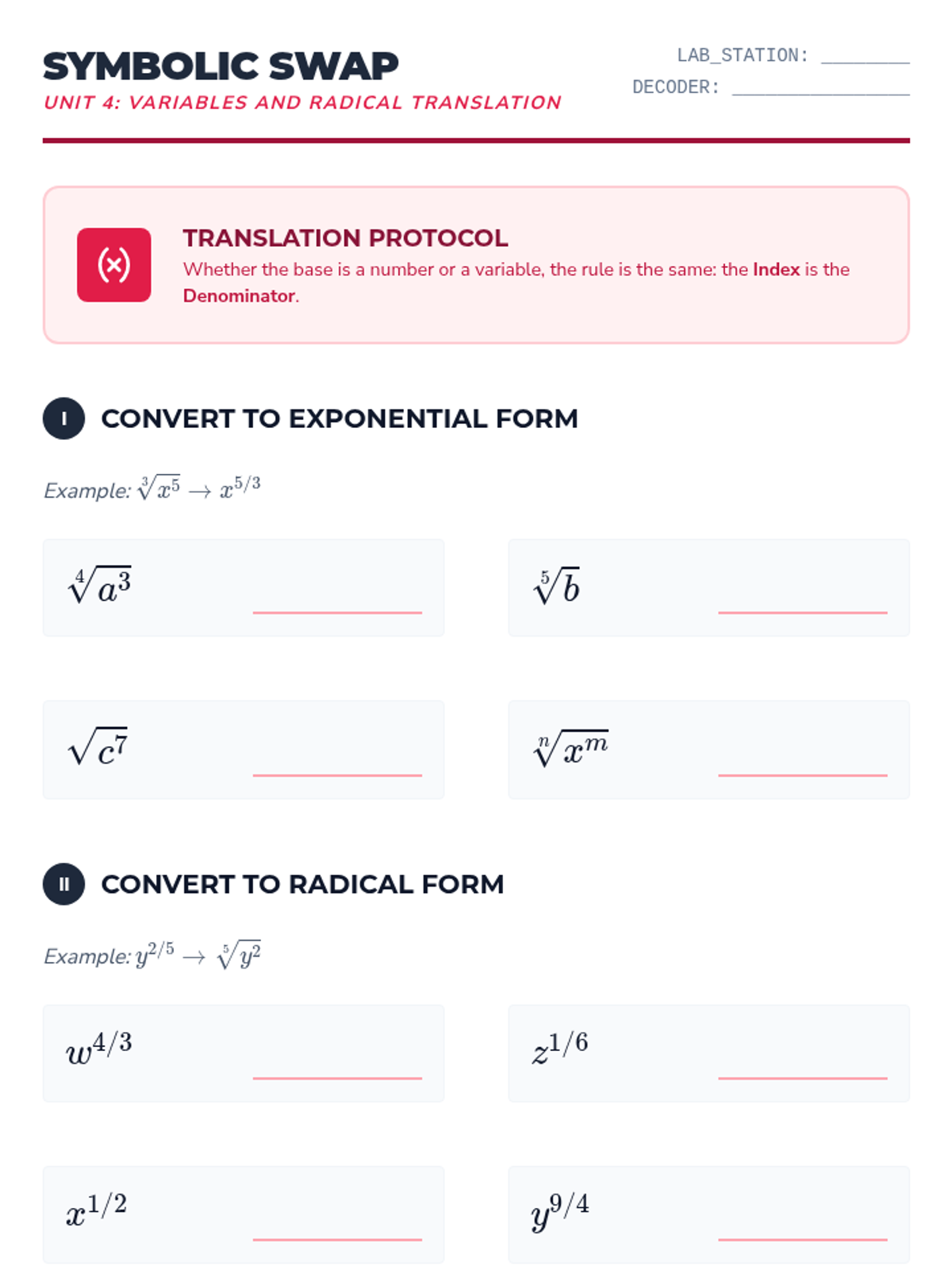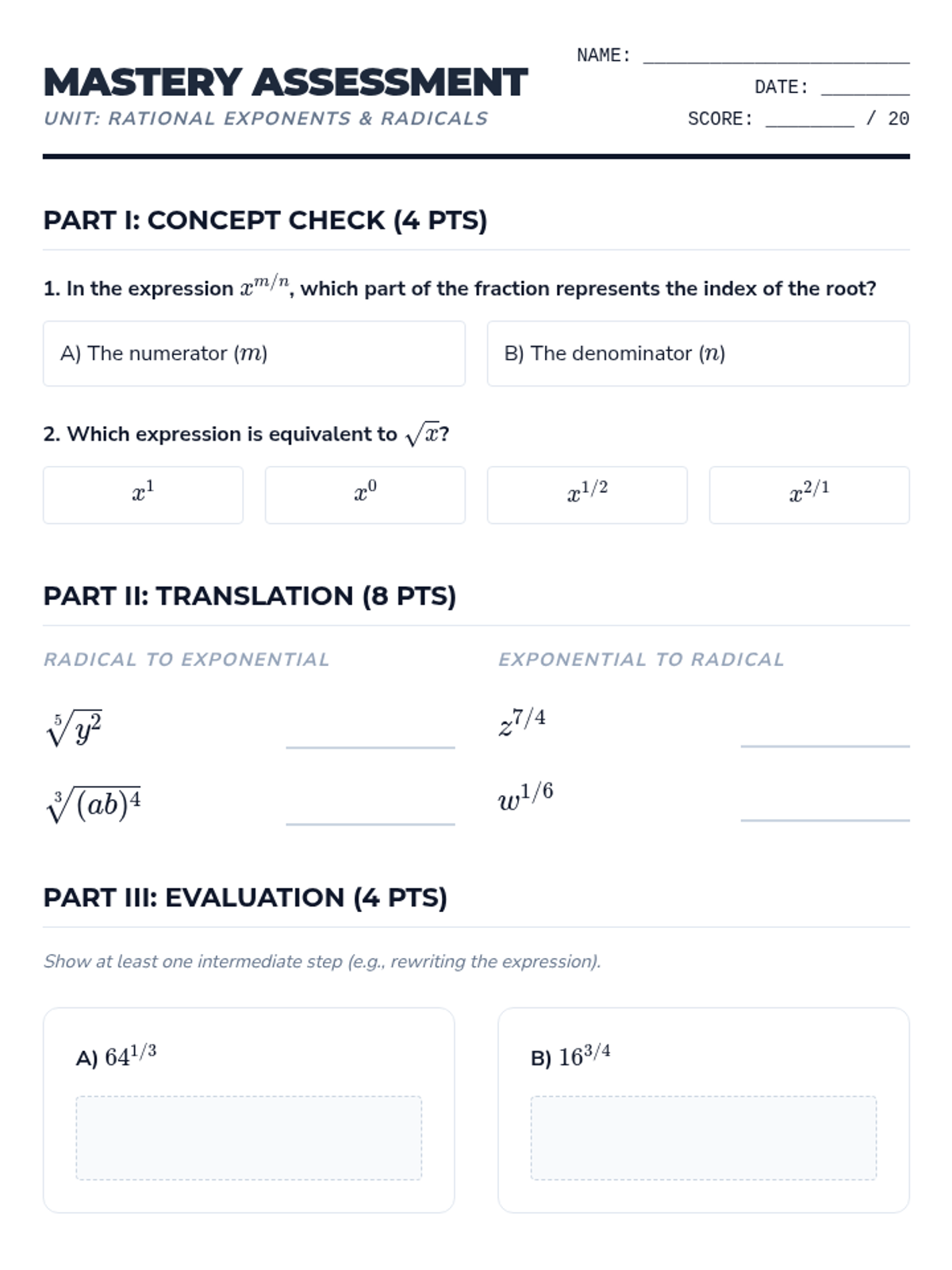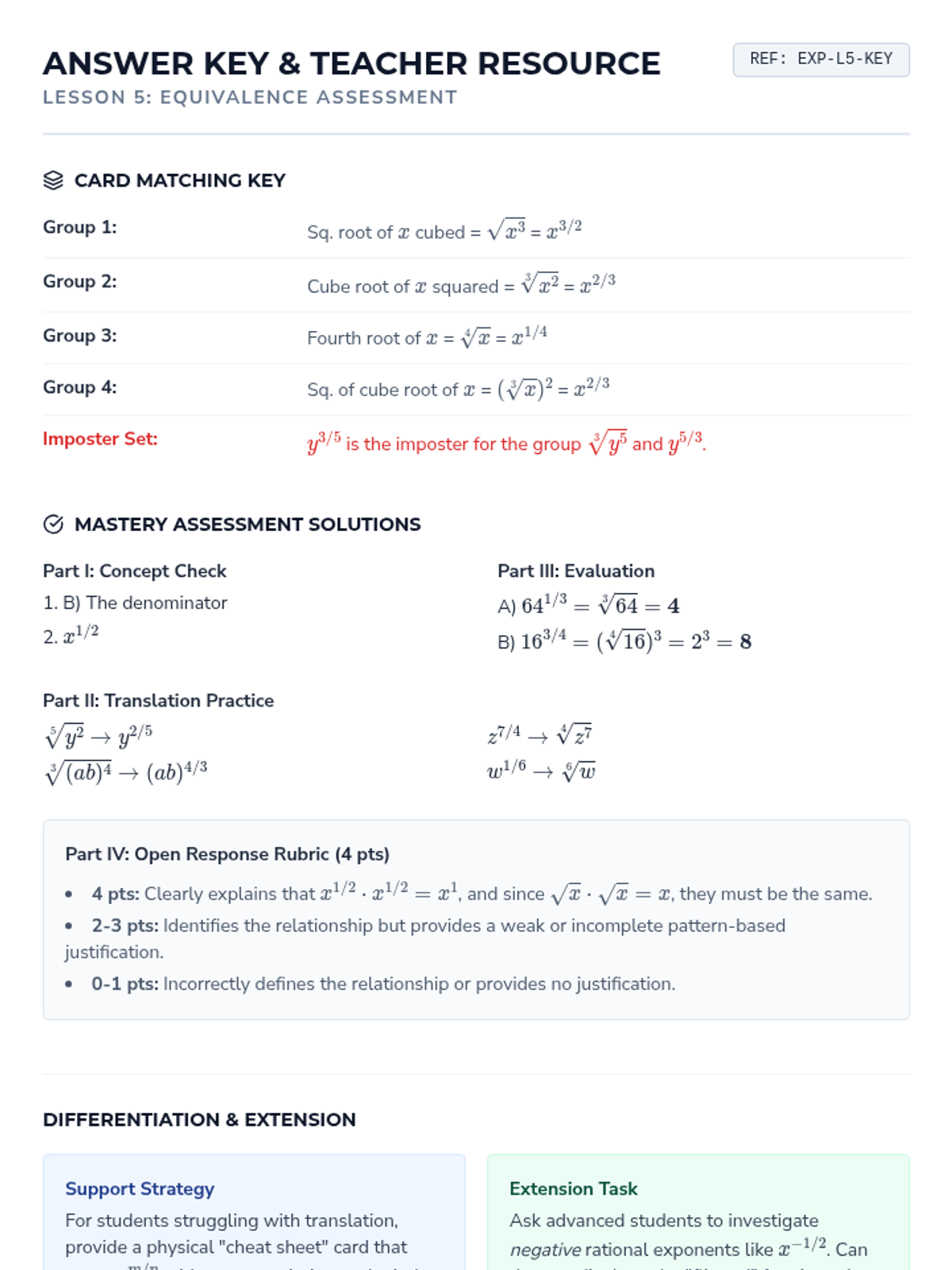A 5-lesson inquiry-based unit that guides 9th-grade algebra students from recognizing integer exponent patterns to fluently translating between radical and rational exponent notation. students will discover the conceptual meaning of fractional exponents through investigative tasks and symbolic manipulation.