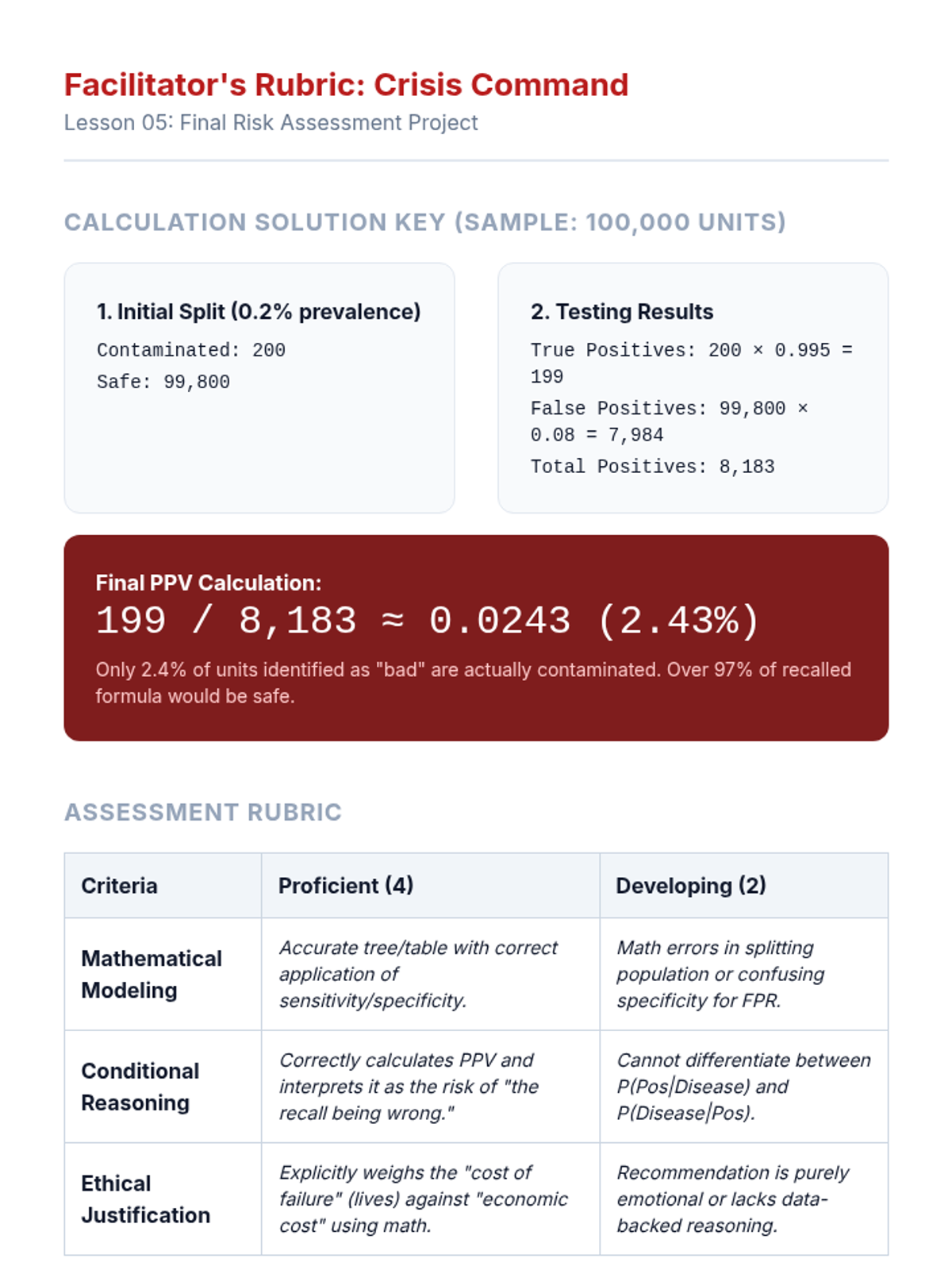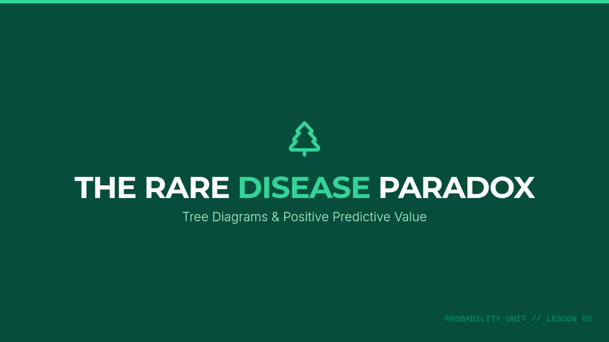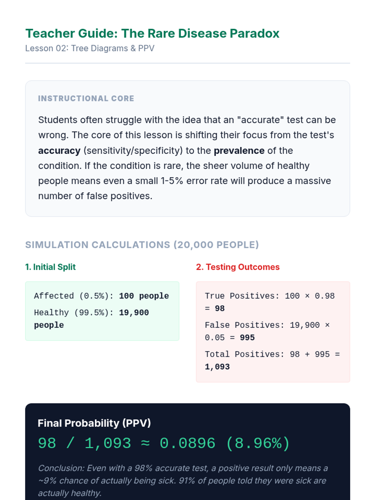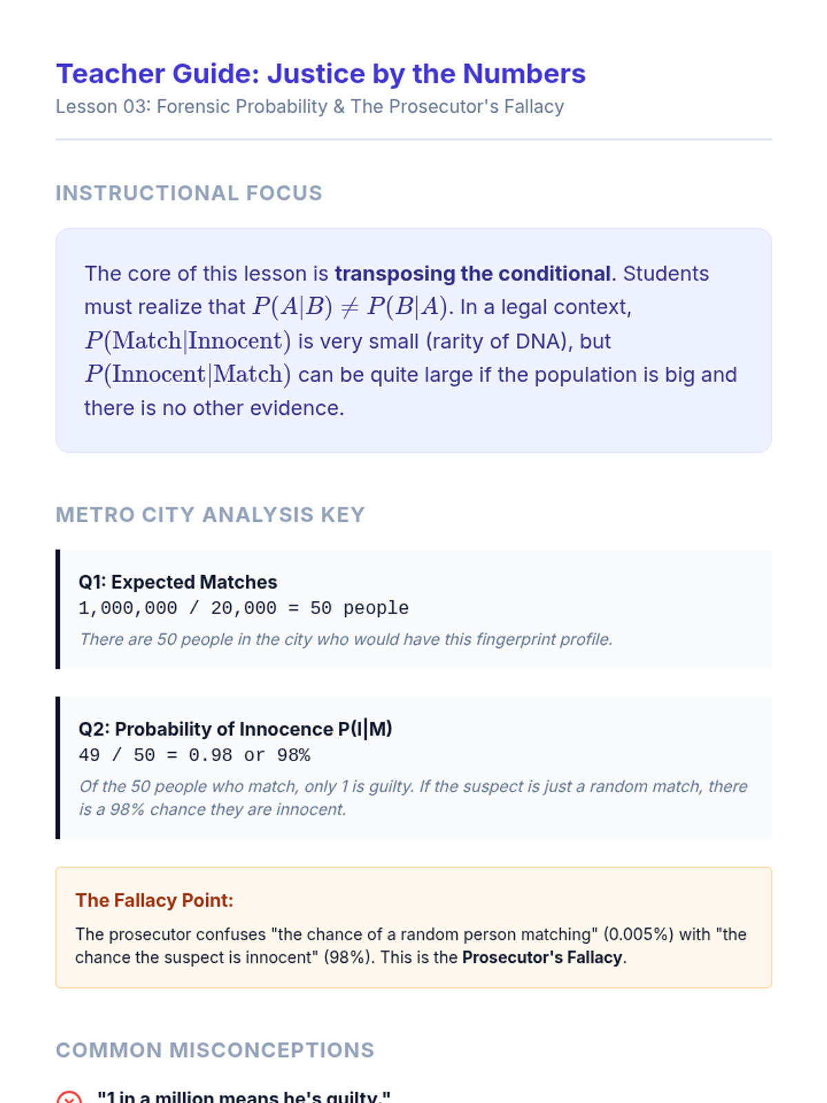A comprehensive 12th-grade sequence exploring conditional probability through high-stakes real-world applications in medicine, forensics, and public safety. Students move from tabular data analysis to Bayesian reasoning, learning to navigate the counter-intuitive nature of false positives and the logical pitfalls of legal evidence.