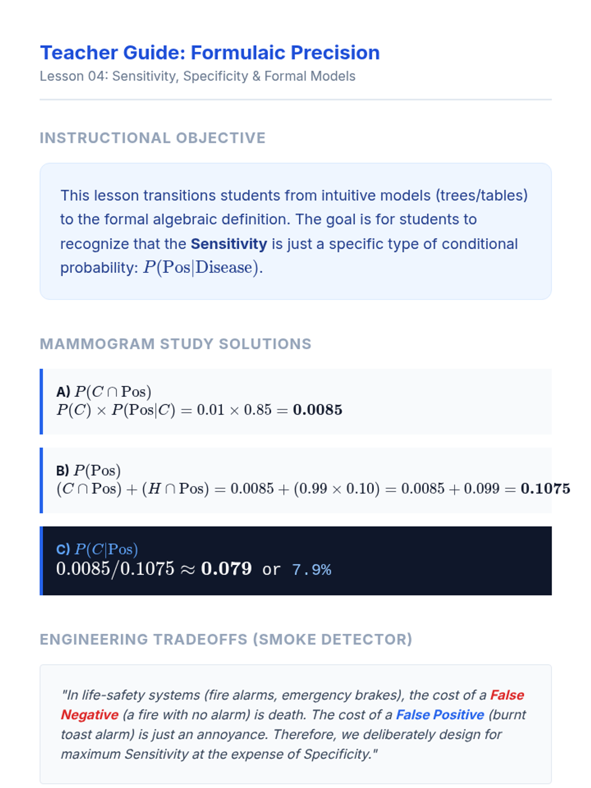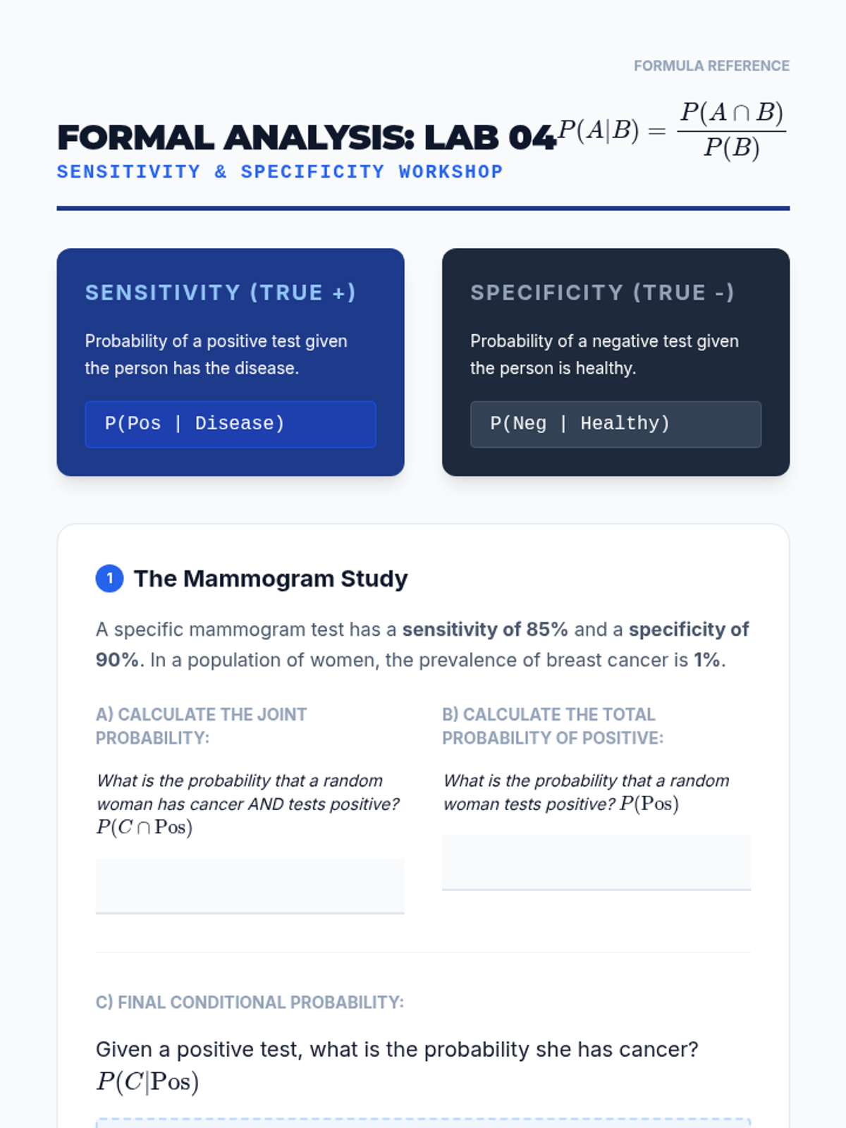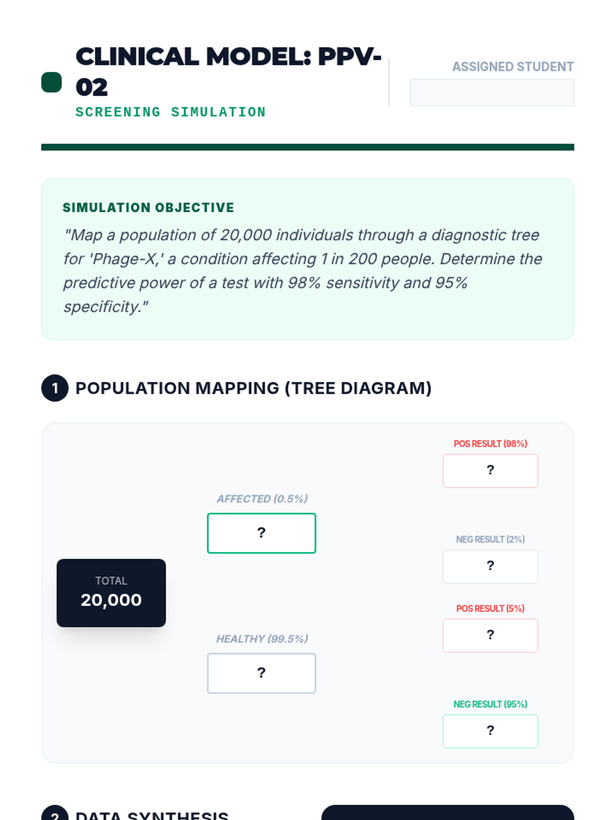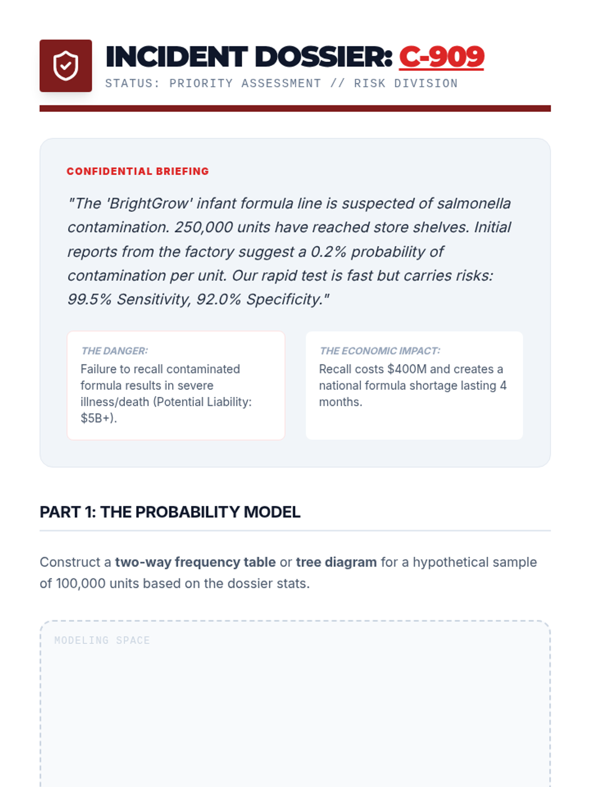A comprehensive 12th-grade sequence exploring conditional probability through high-stakes real-world applications in medicine, forensics, and public safety. Students move from tabular data analysis to Bayesian reasoning, learning to navigate the counter-intuitive nature of false positives and the logical pitfalls of legal evidence.