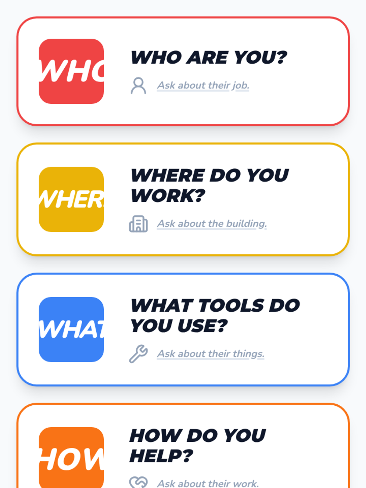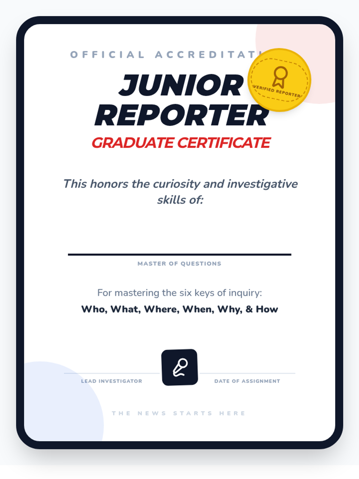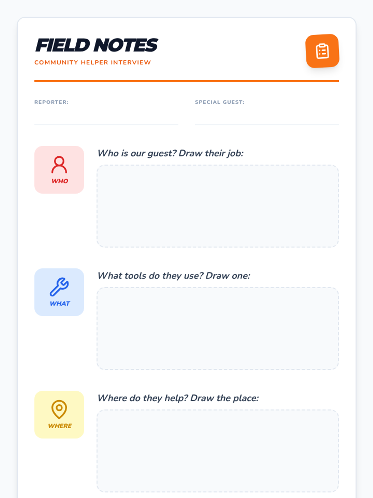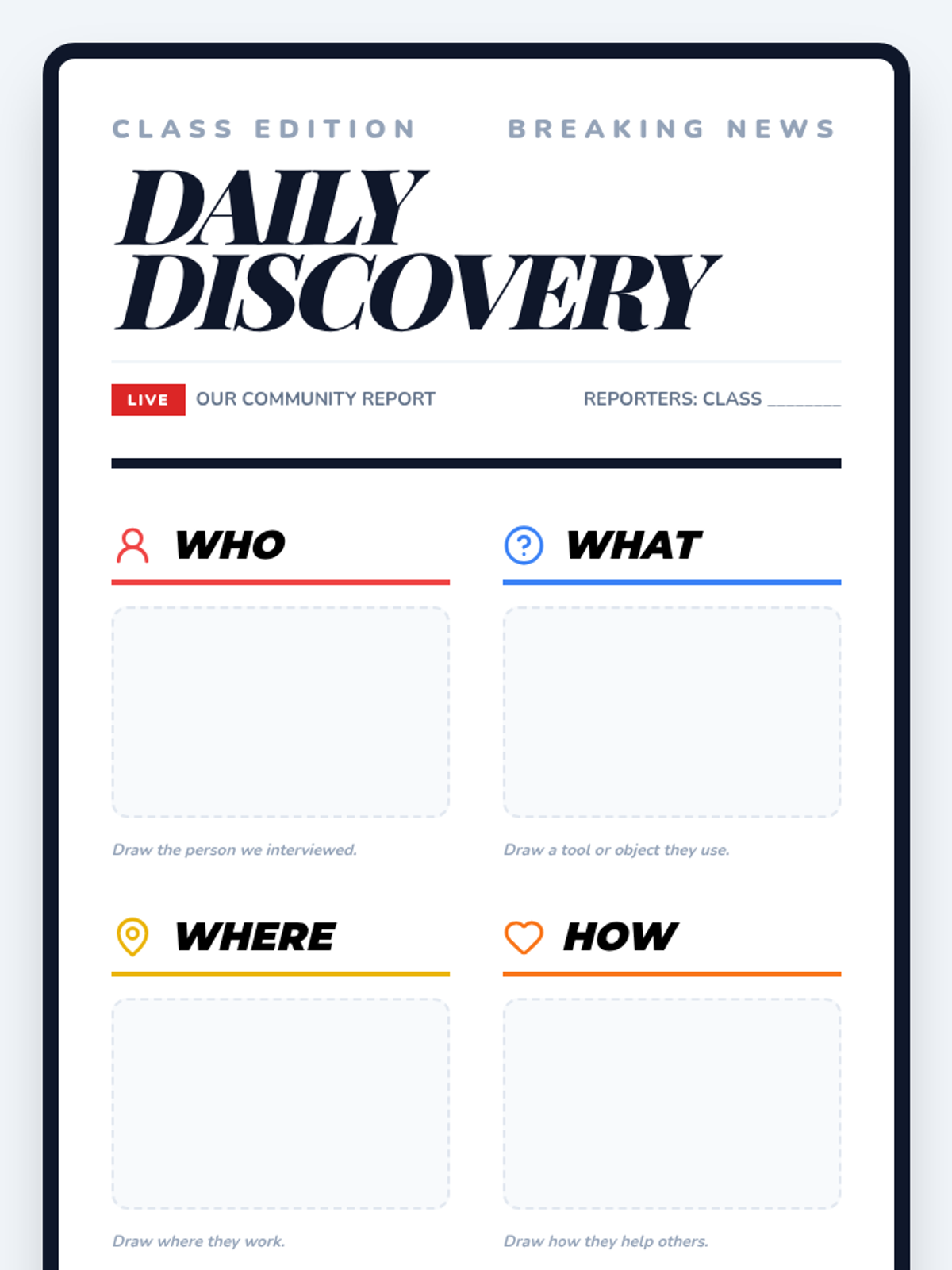 A culminating Pre-K sequence where students become 'Community Reporters,' mastering the six question words (Who, What, Where, When, Why, How) through role-play, peer interviews, and a guest inquiry project to learn about their world.