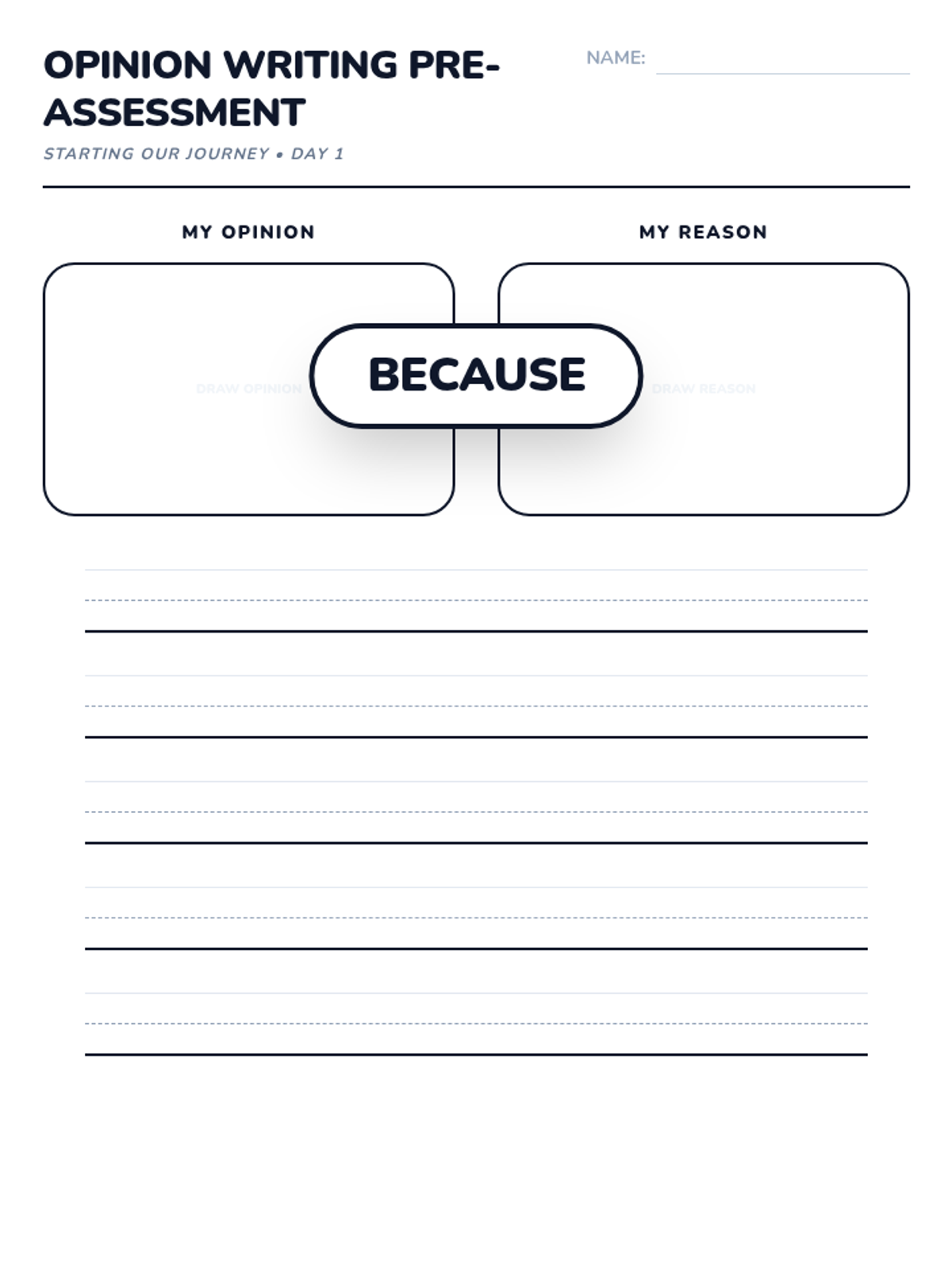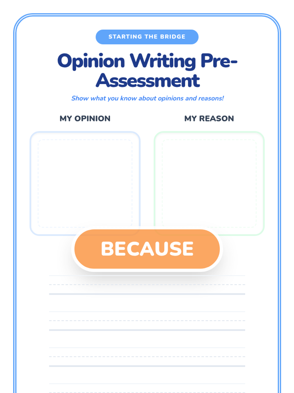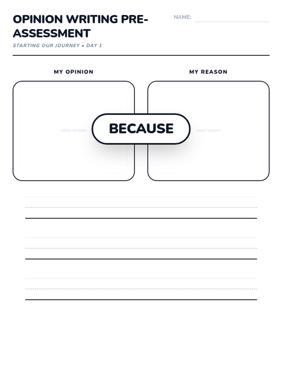 A 15-day introductory unit for Kindergarten students focused on identifying, stating, and supporting opinions using the bridge word 'because'. The sequence includes a pre-assessment, mid-point check, and post-assessment, with daily visual slides and printable practice activities.