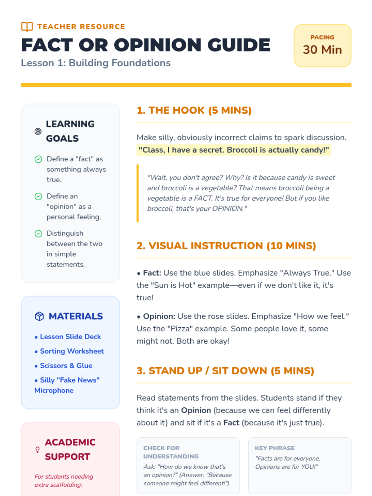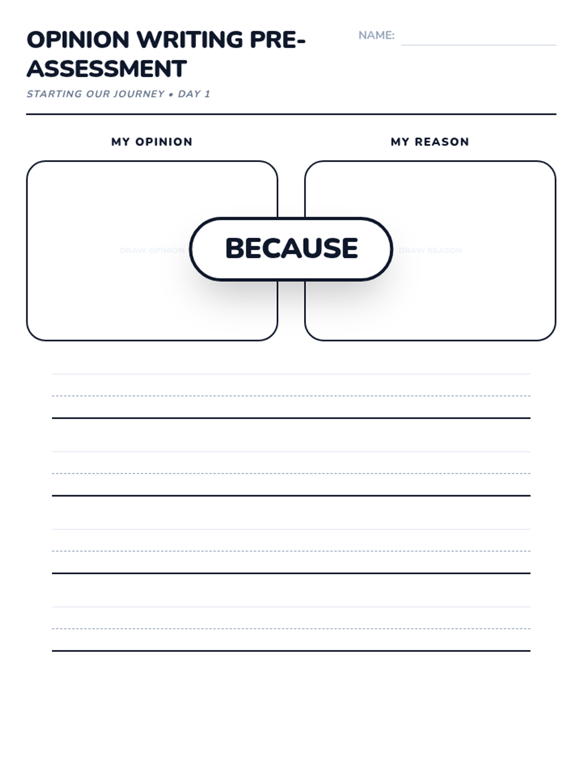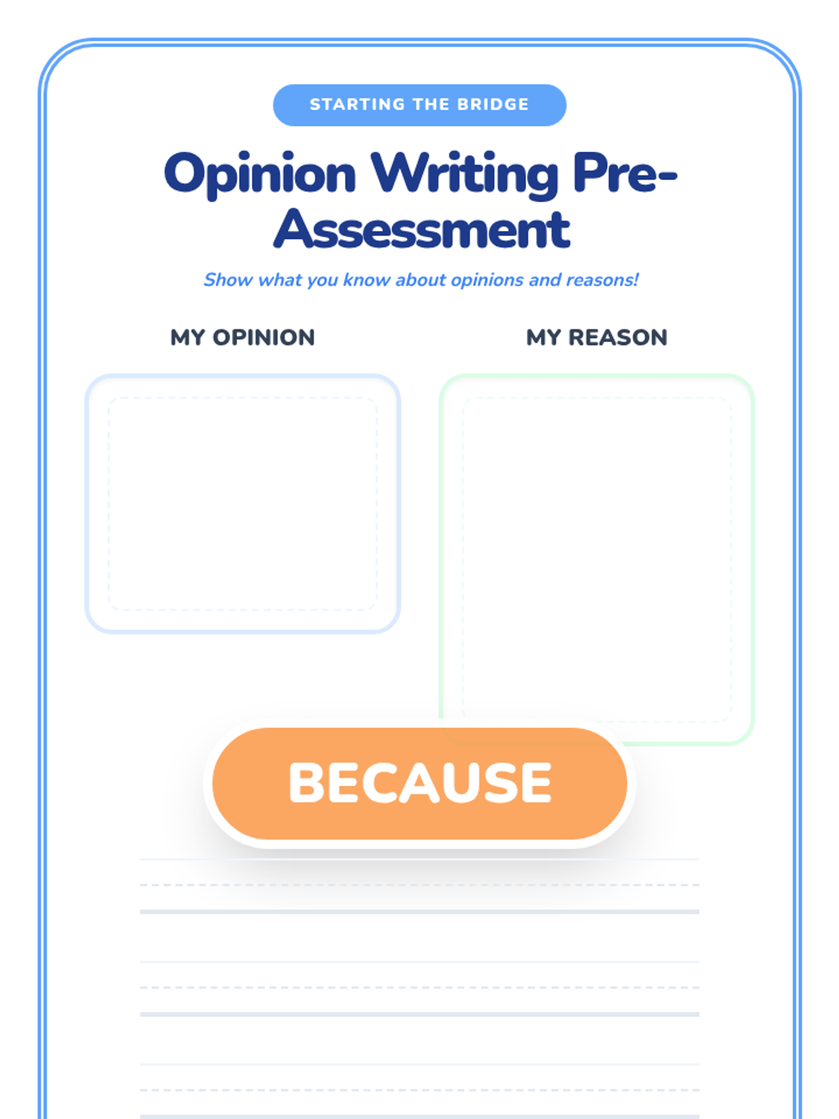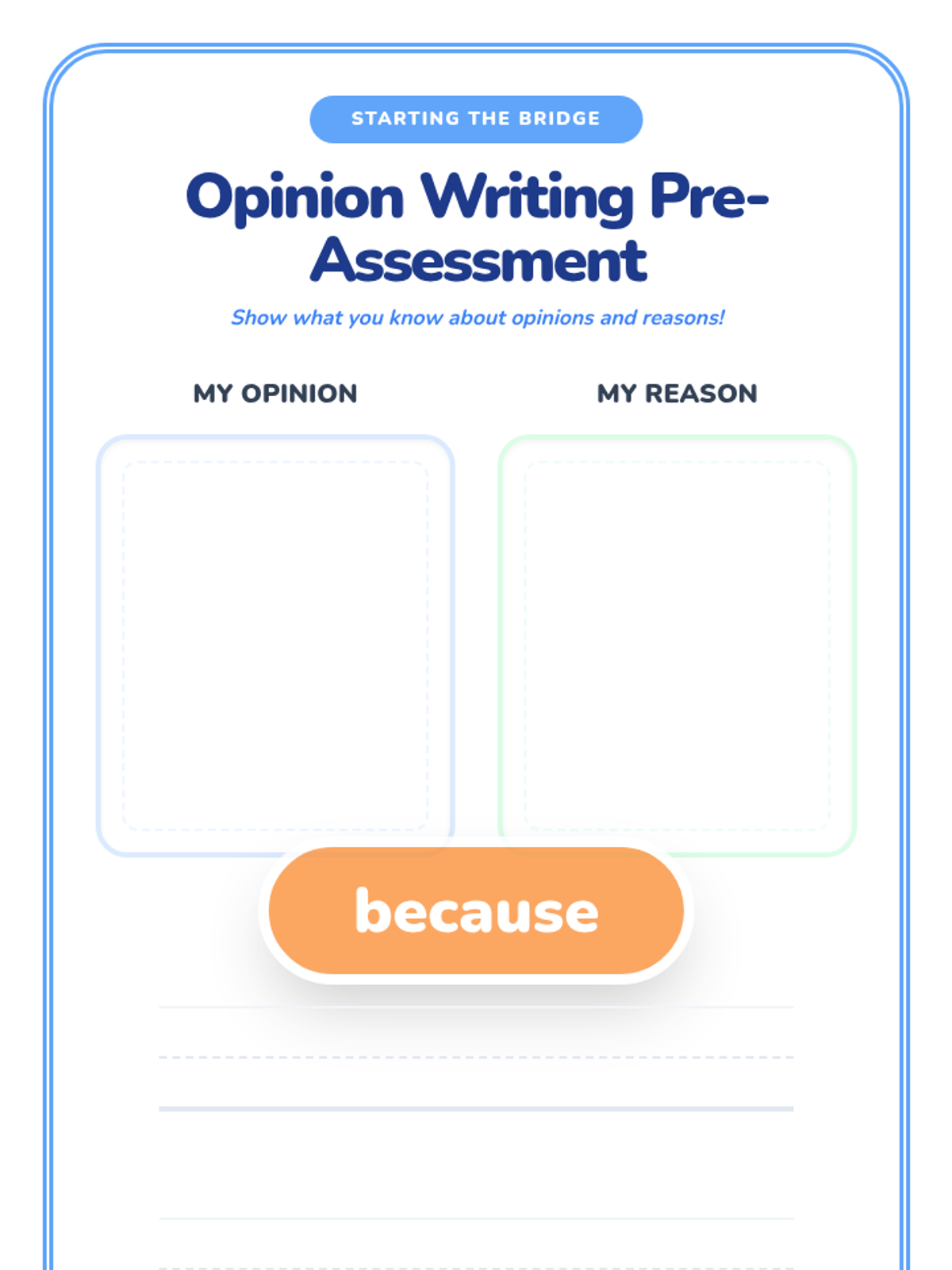 A 15-day introductory unit for Kindergarten students focused on identifying, stating, and supporting opinions using the bridge word 'because'. The sequence includes a pre-assessment, mid-point check, and post-assessment, with daily visual slides and printable practice activities.