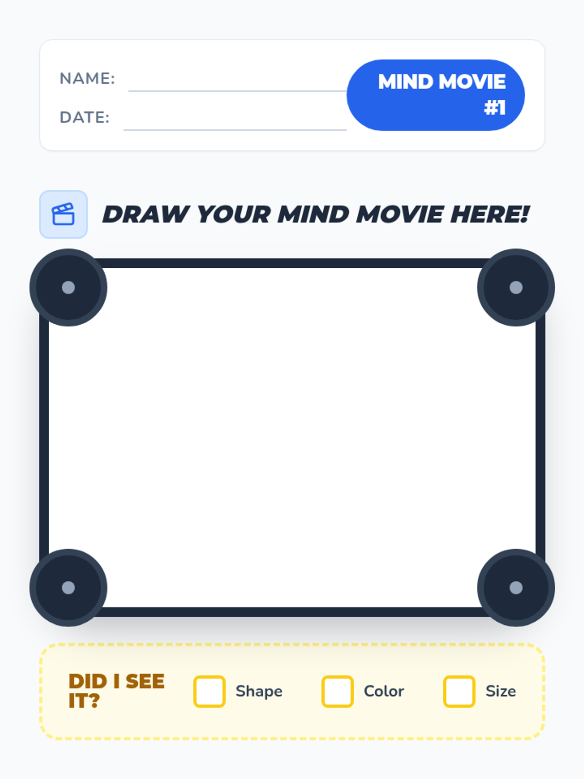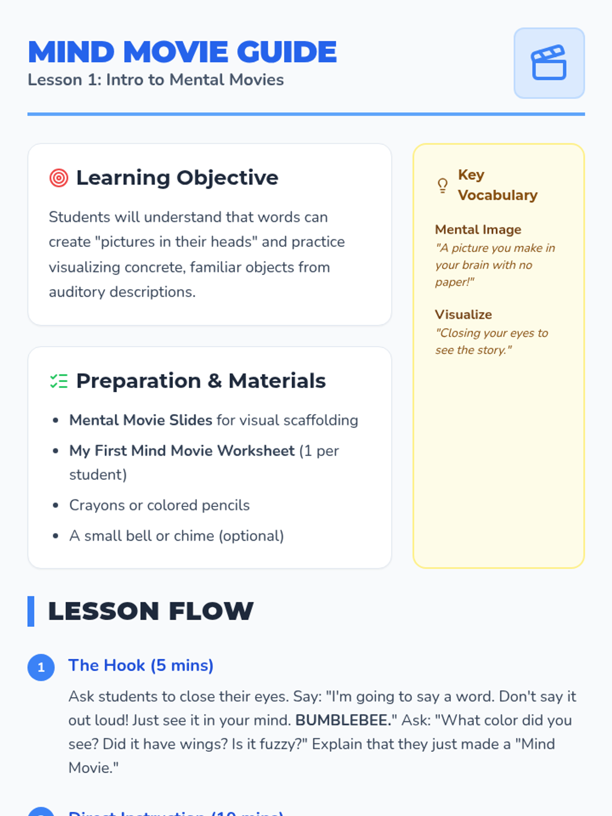 A Kindergarten sequence focused on building mental imagery skills through auditory descriptions. Students learn to 'make movies in their minds' to improve comprehension, progressing from single objects to full scenes with characters and settings.