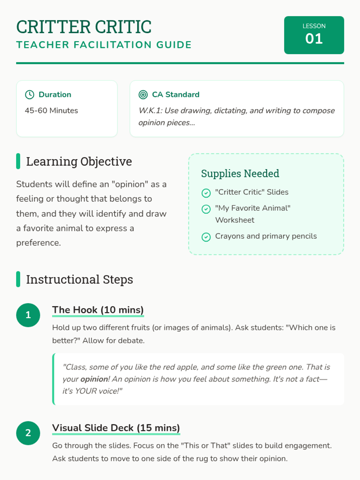 A 3-lesson sequence designed to introduce Kindergarten students to opinion writing, moving from identifying favorites to providing reasons and reviewing books. Aligning with CA State Standard W.K.1, students use drawing and writing to express their voices.