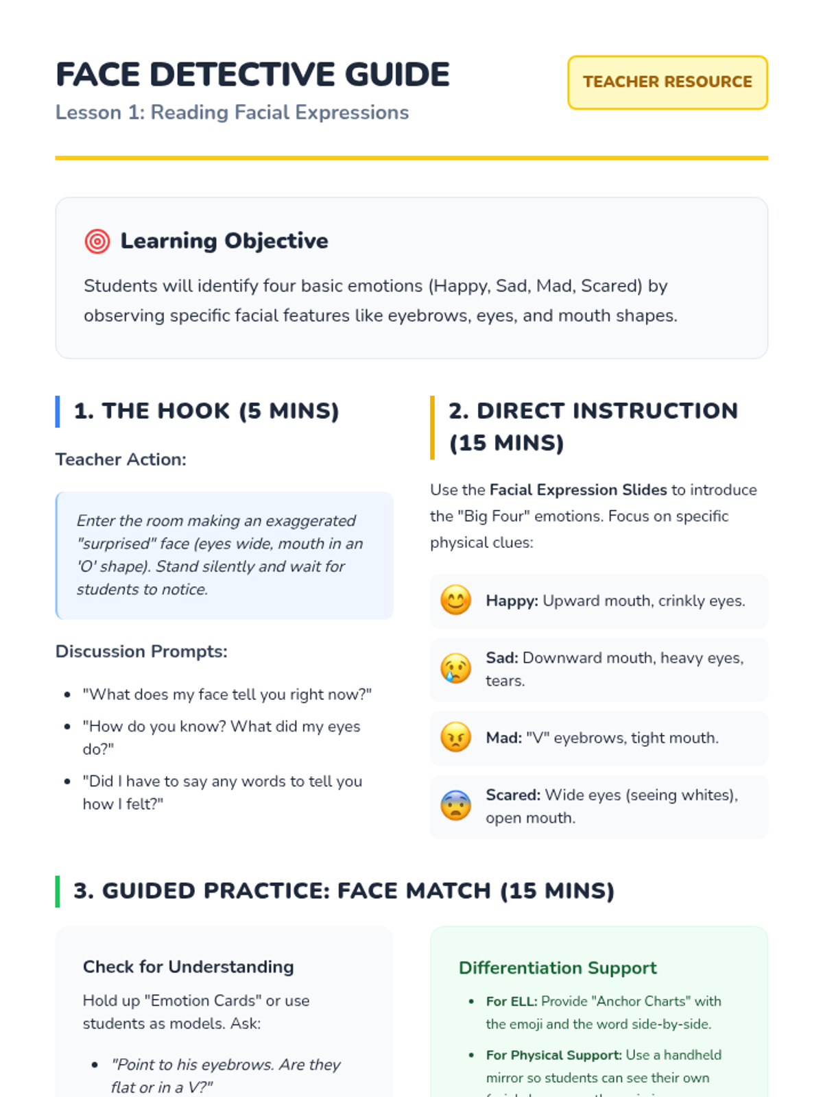 A Kindergarten sequence focused on teaching students to infer character emotions and motivations through facial expressions, body language, and situational clues. This supports early literacy and social-emotional development.