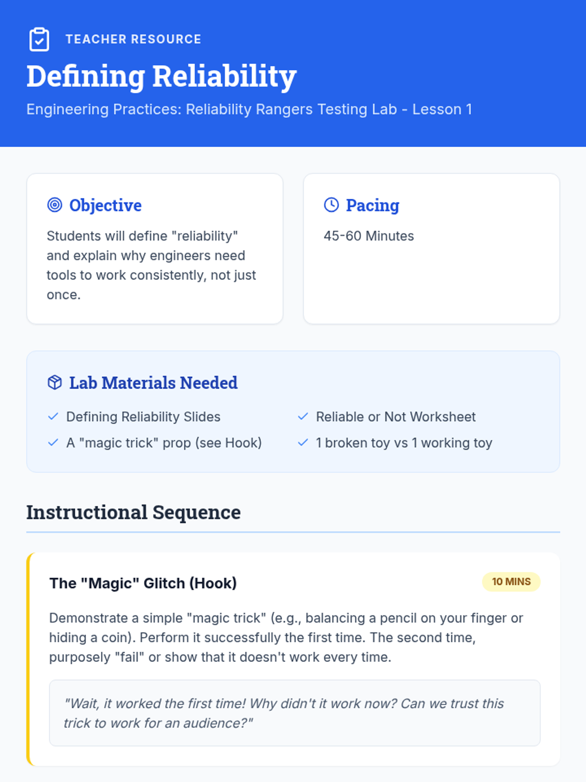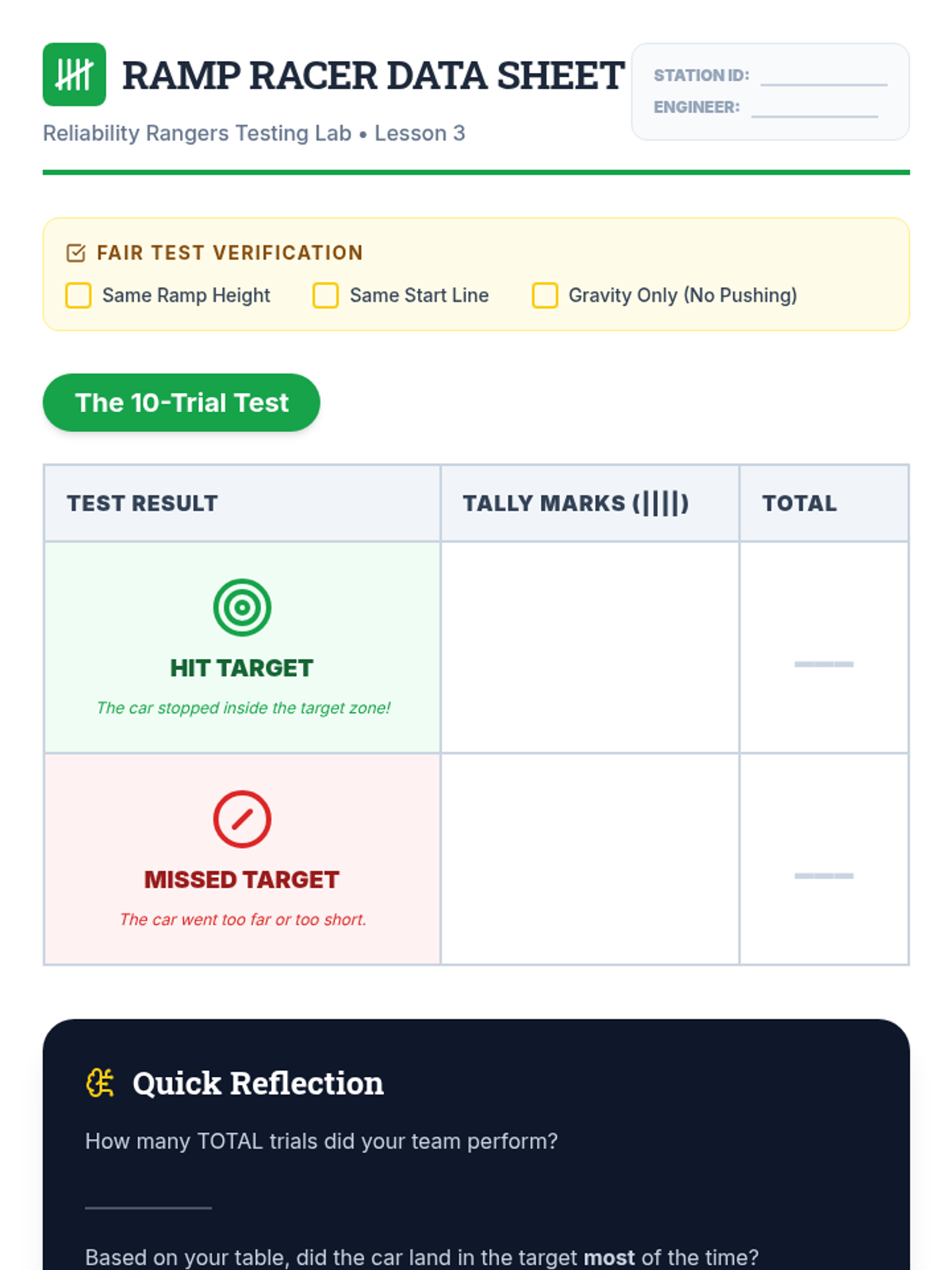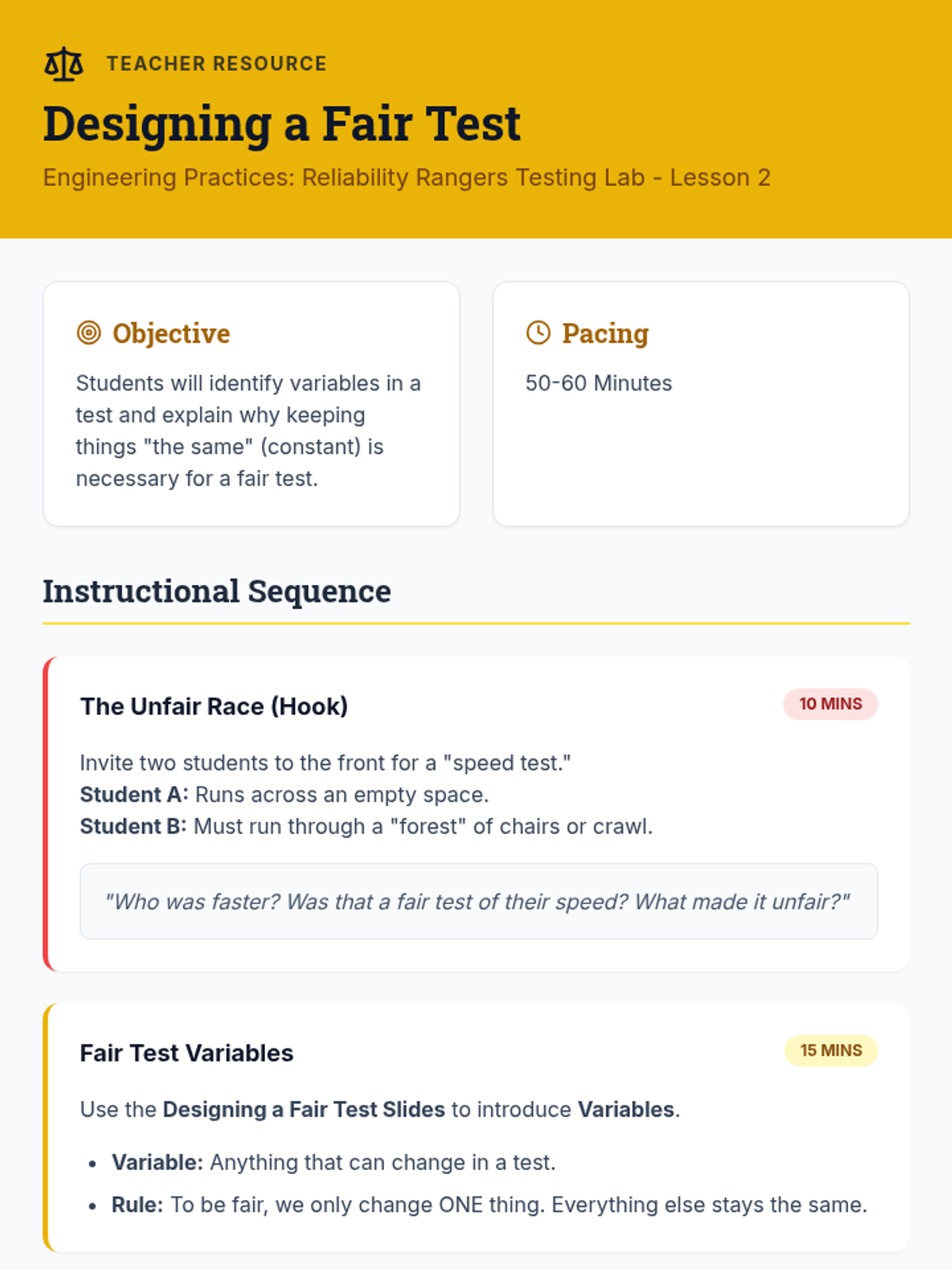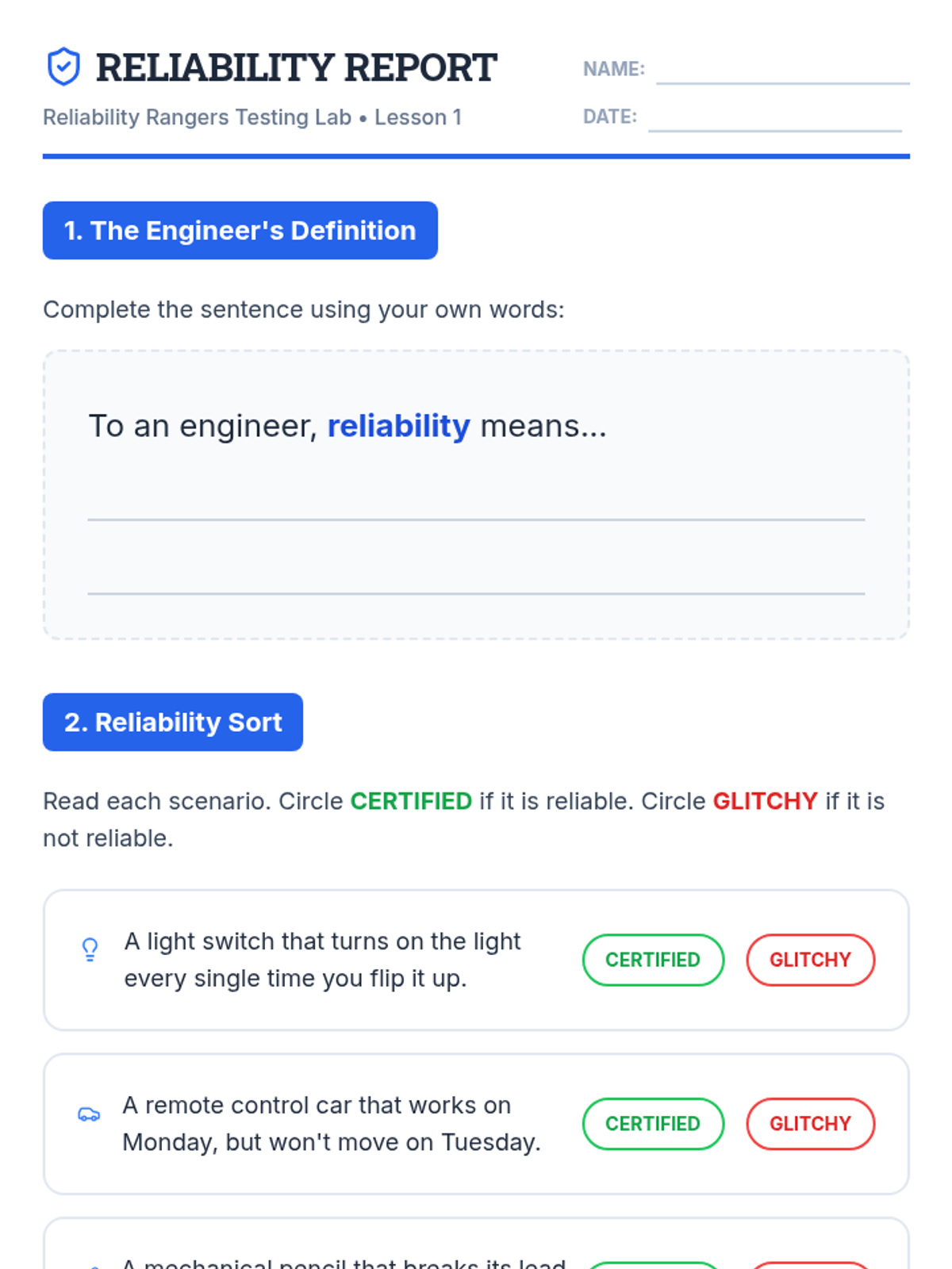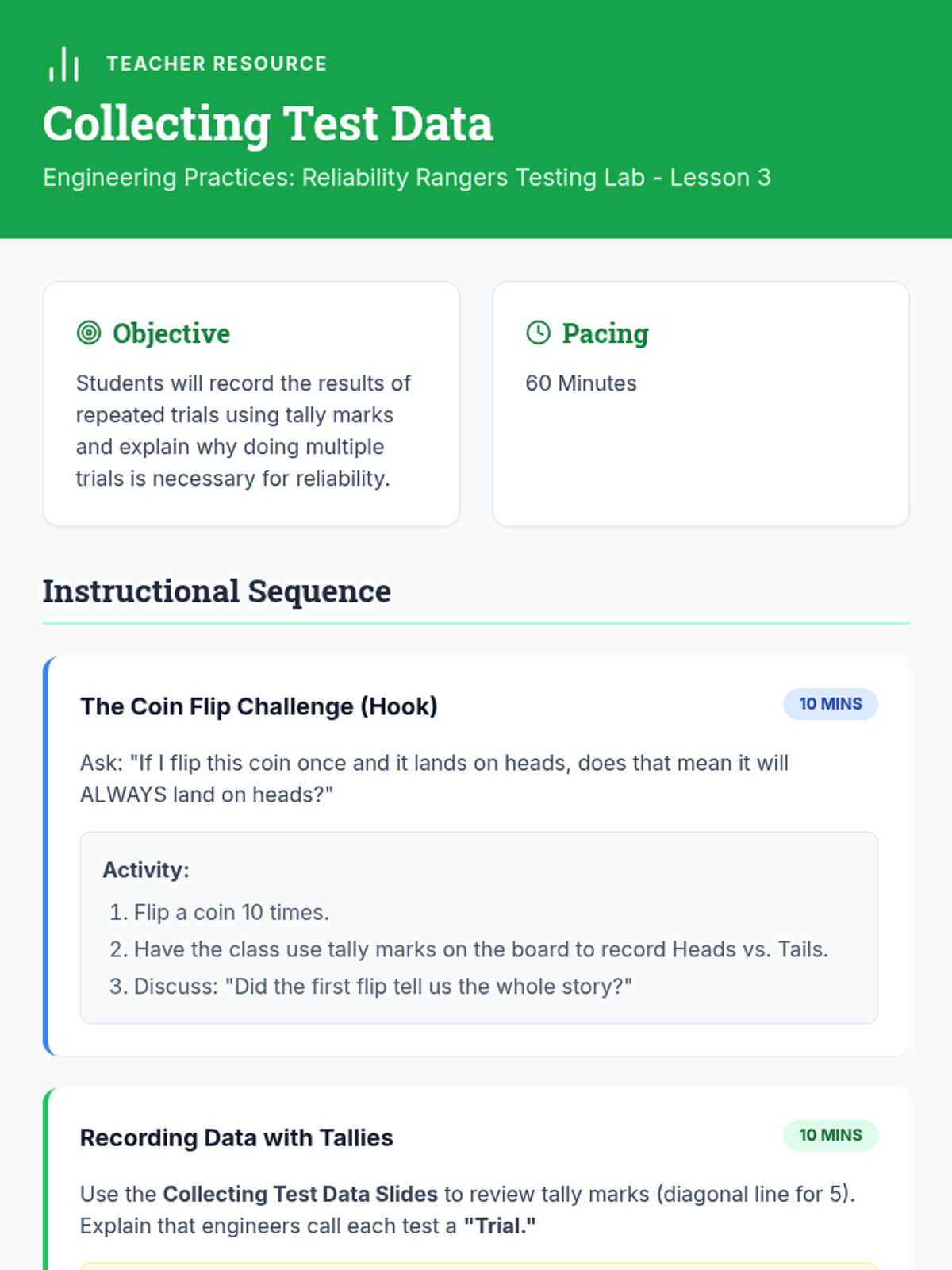 Students explore the importance of rigorous testing and reliability in engineering. They learn to conduct fair tests, record data with tally marks, identify patterns, and make evidence-based decisions about design quality.