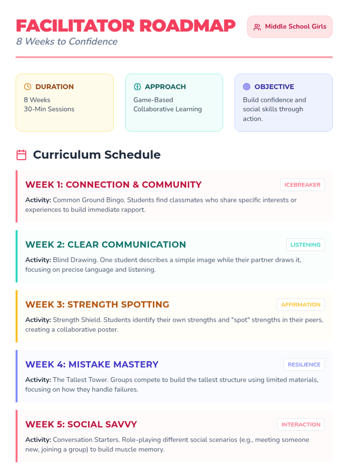 An 8-week empowerment program for middle school girls focused on building self-confidence, social skills, and teamwork through game-based and collaborative learning.