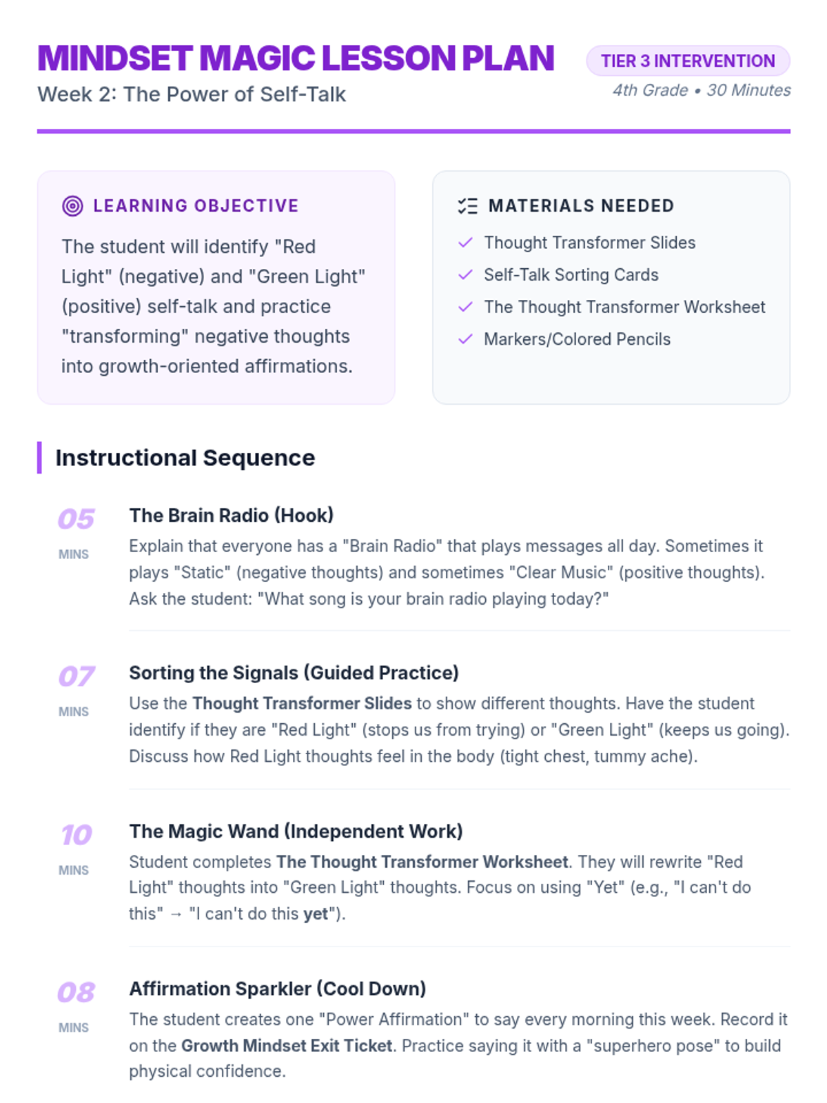A comprehensive three-week Tier 3 intervention designed to boost a 4th-grade student's self-confidence through strength identification, positive self-talk, and real-world application.