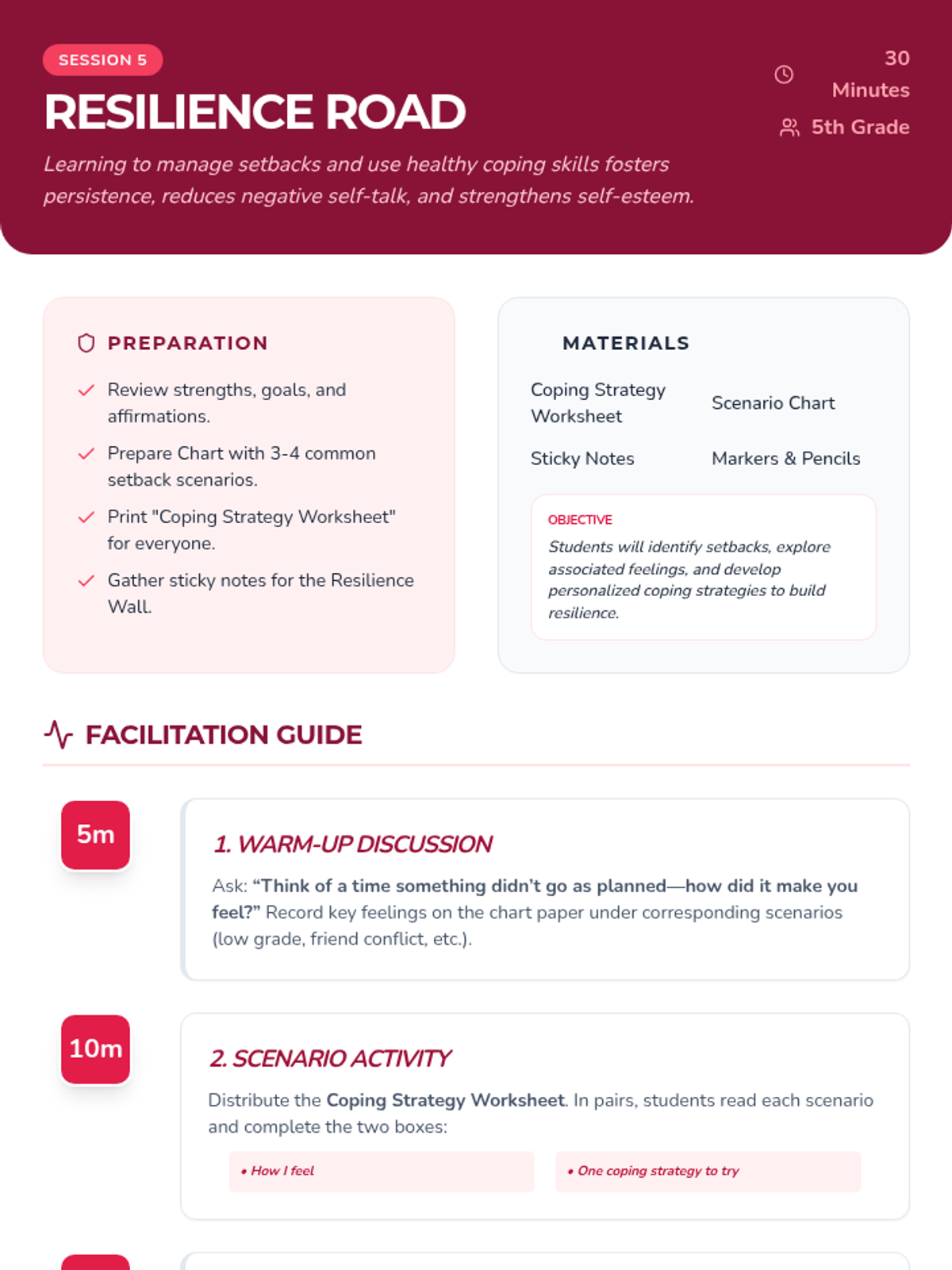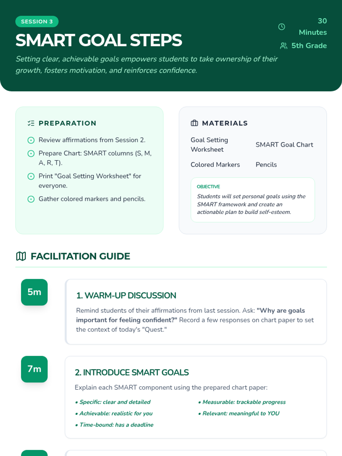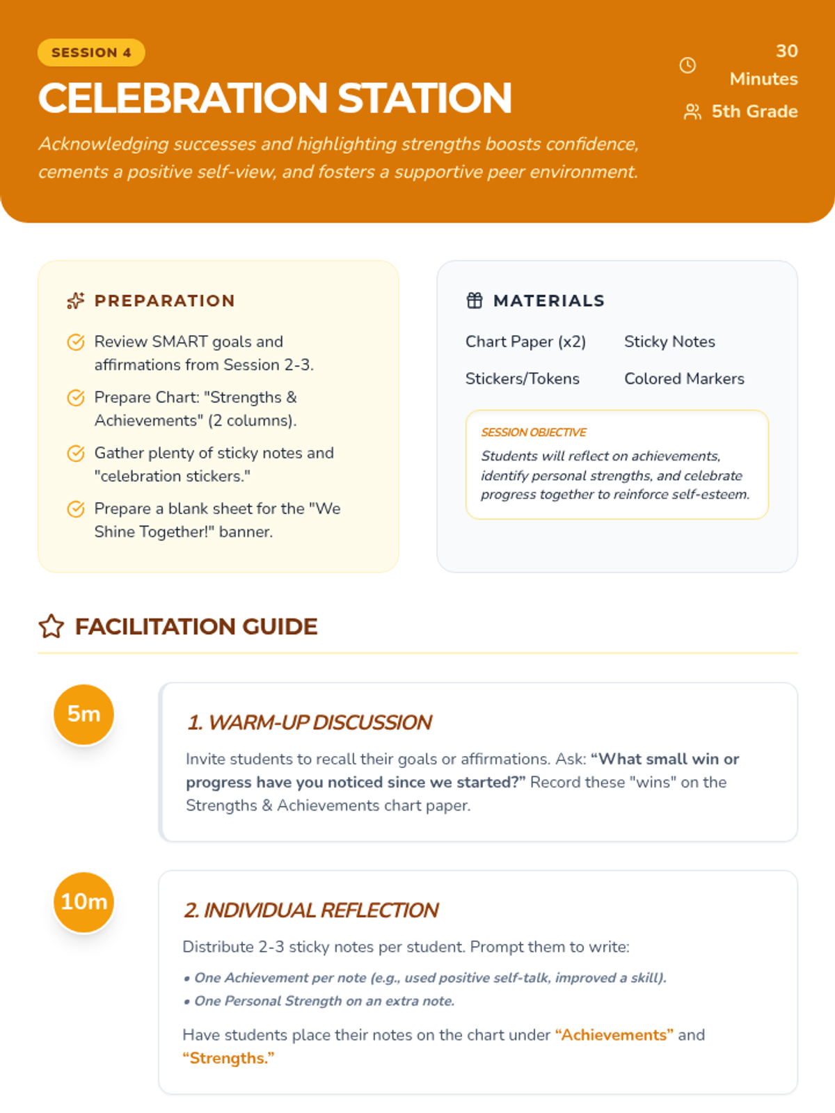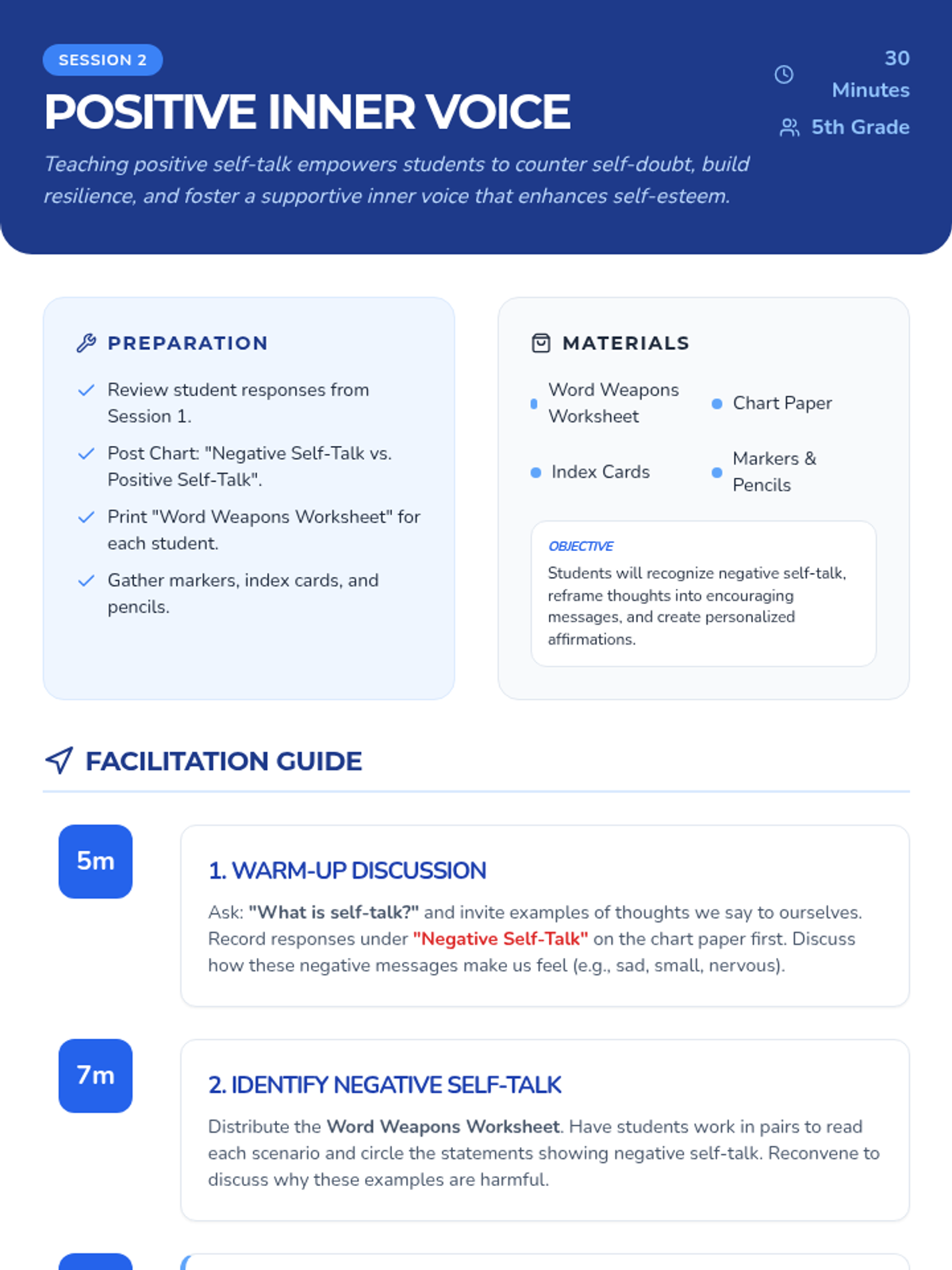 A 6-session Tier 2 self-esteem group for 5th graders designed to boost confidence, develop positive self-talk, and foster resilience through reflective activities and peer support.