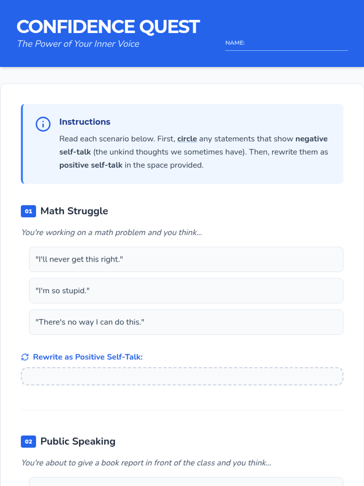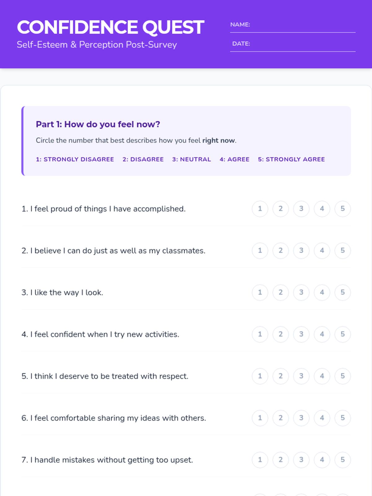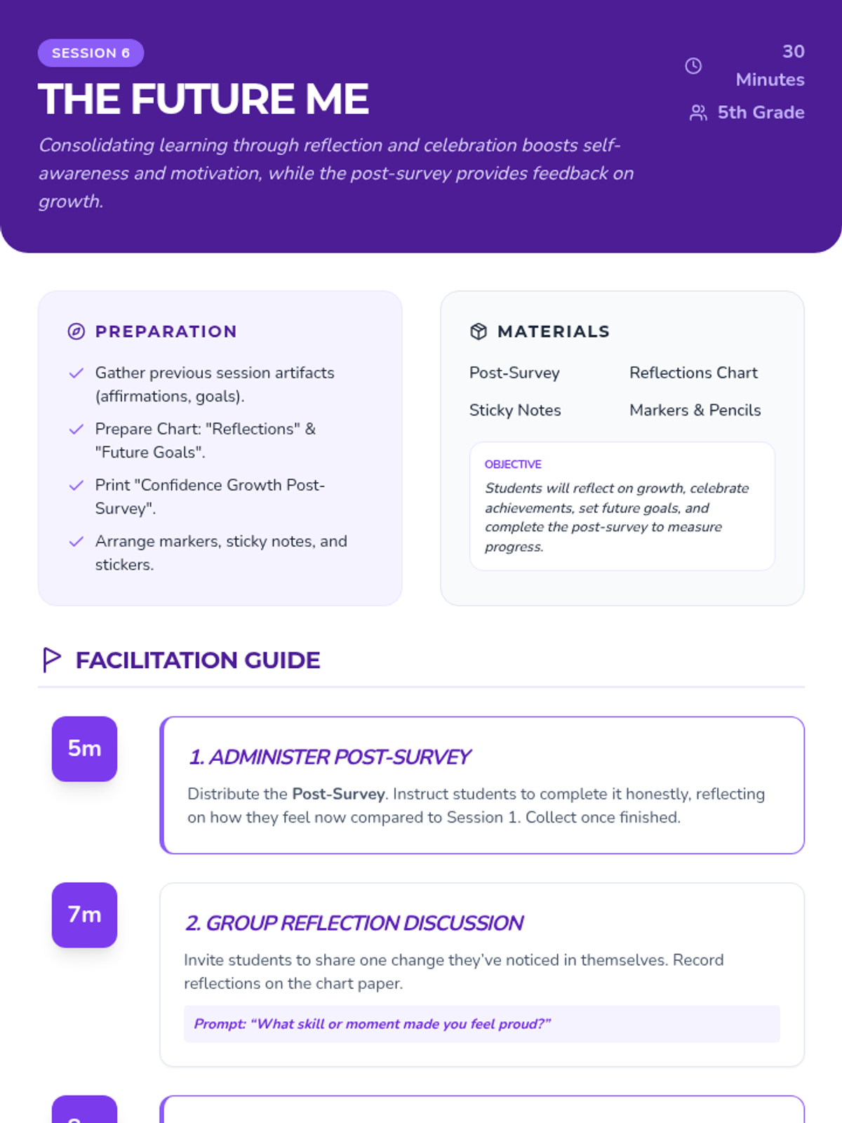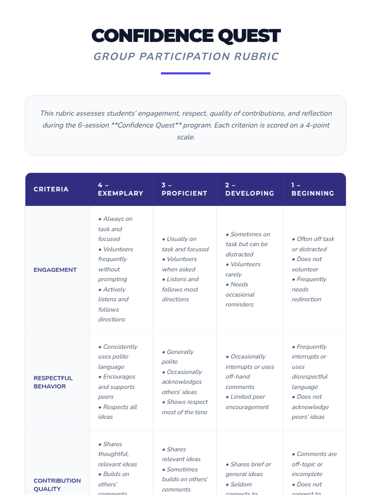 A 6-session Tier 2 self-esteem group for 5th graders designed to boost confidence, develop positive self-talk, and foster resilience through reflective activities and peer support.