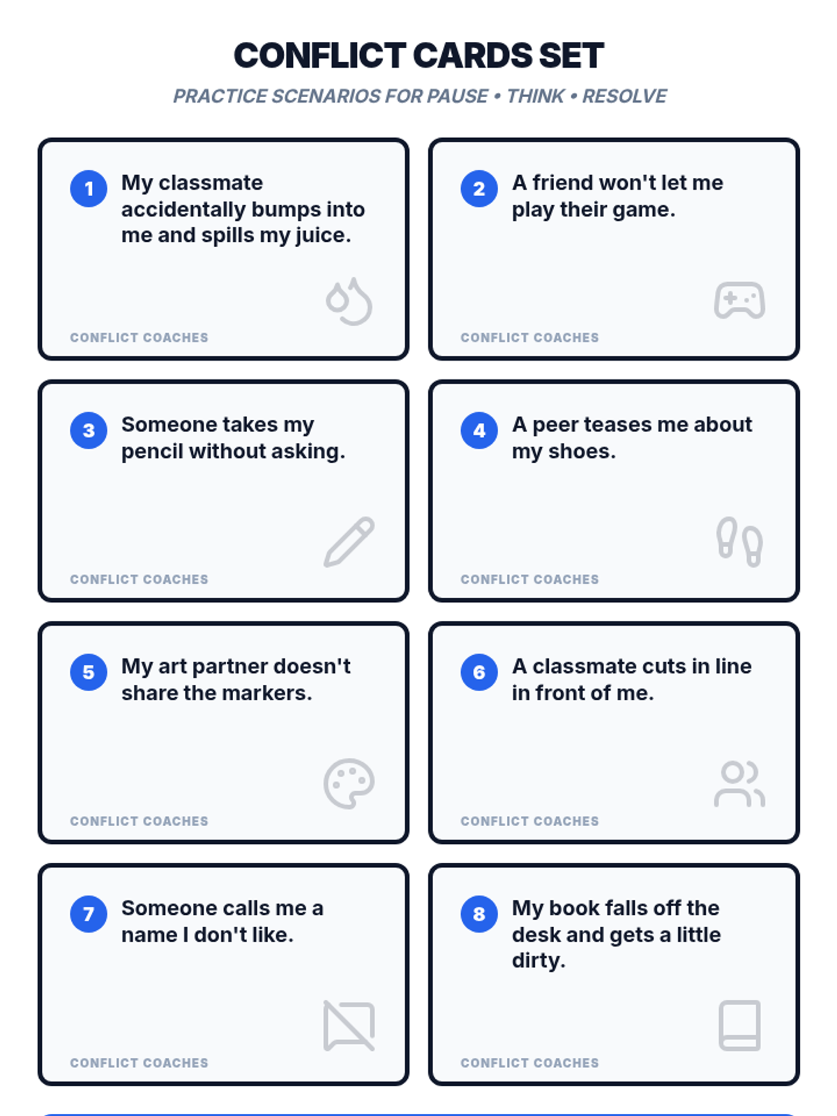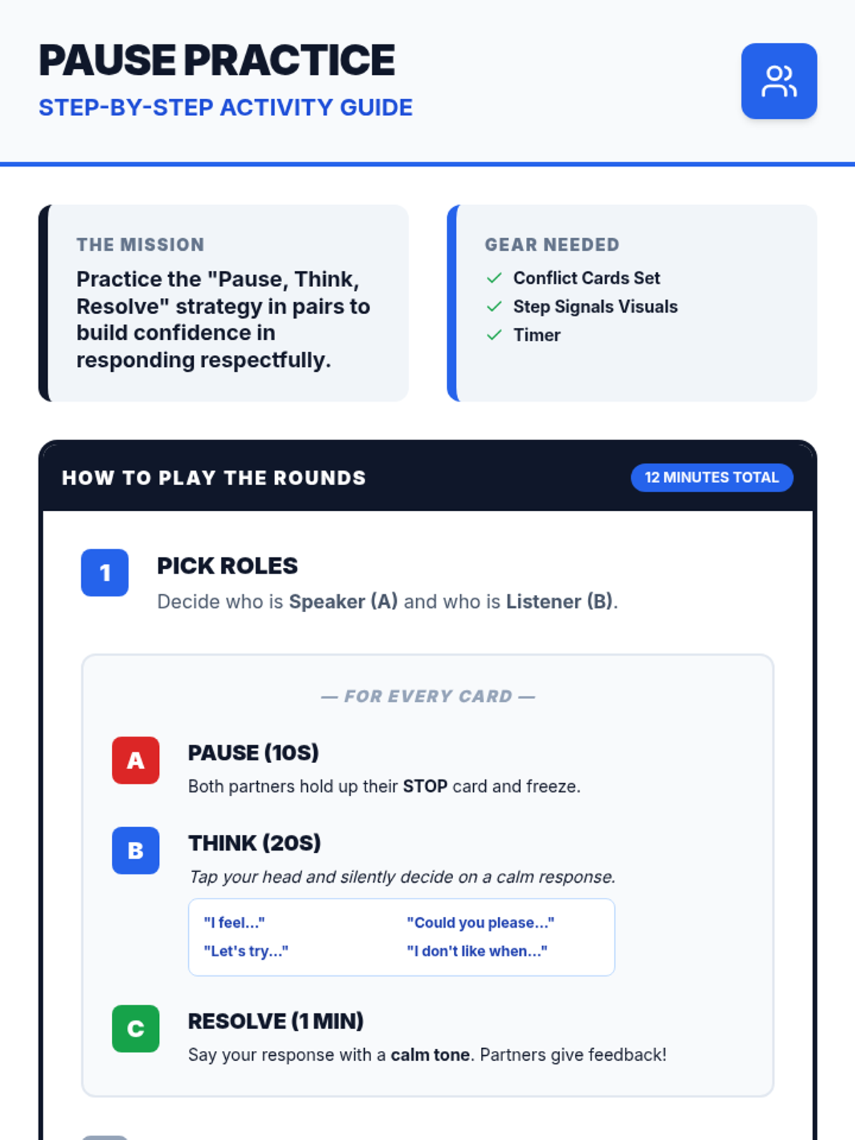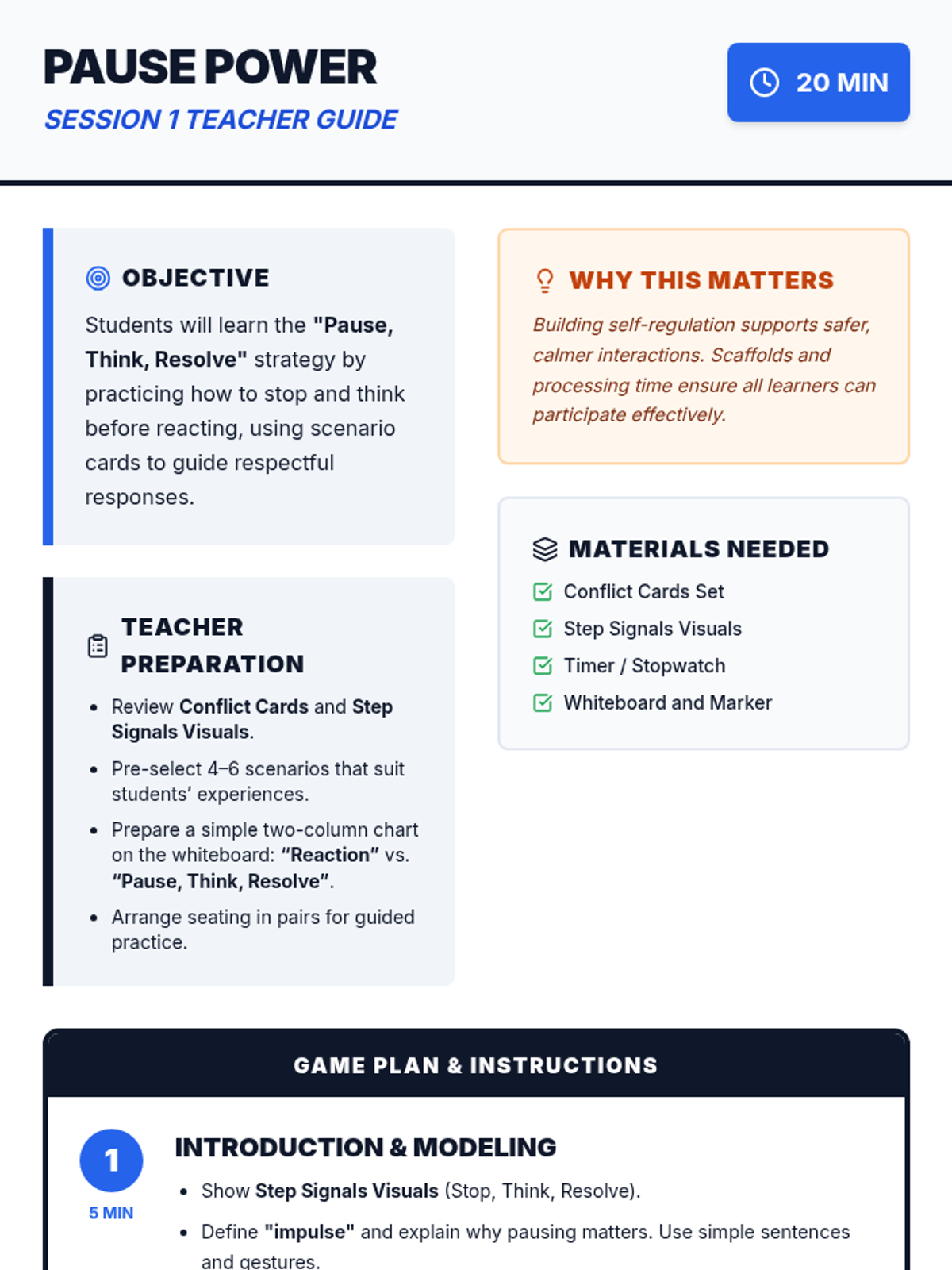 A 2-session social-emotional learning sequence for 4th-grade boys focused on building self-regulation and peer communication skills through the 'Pause, Think, Resolve' strategy.