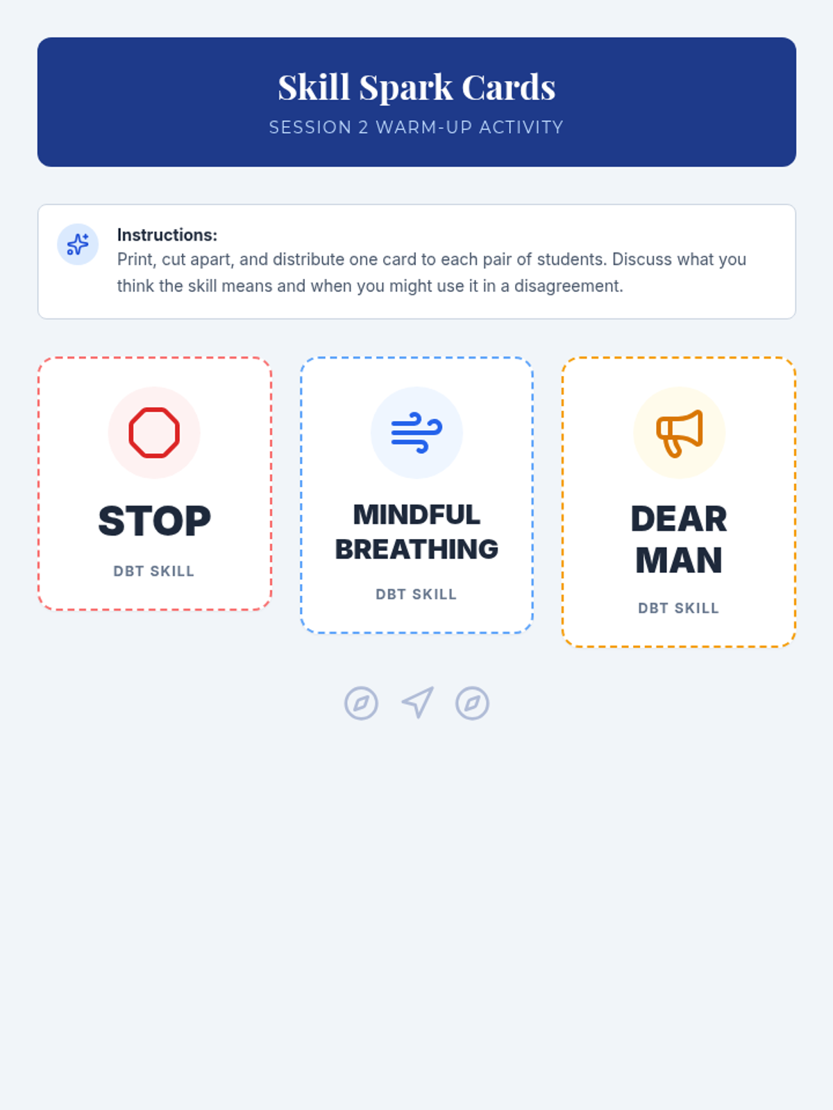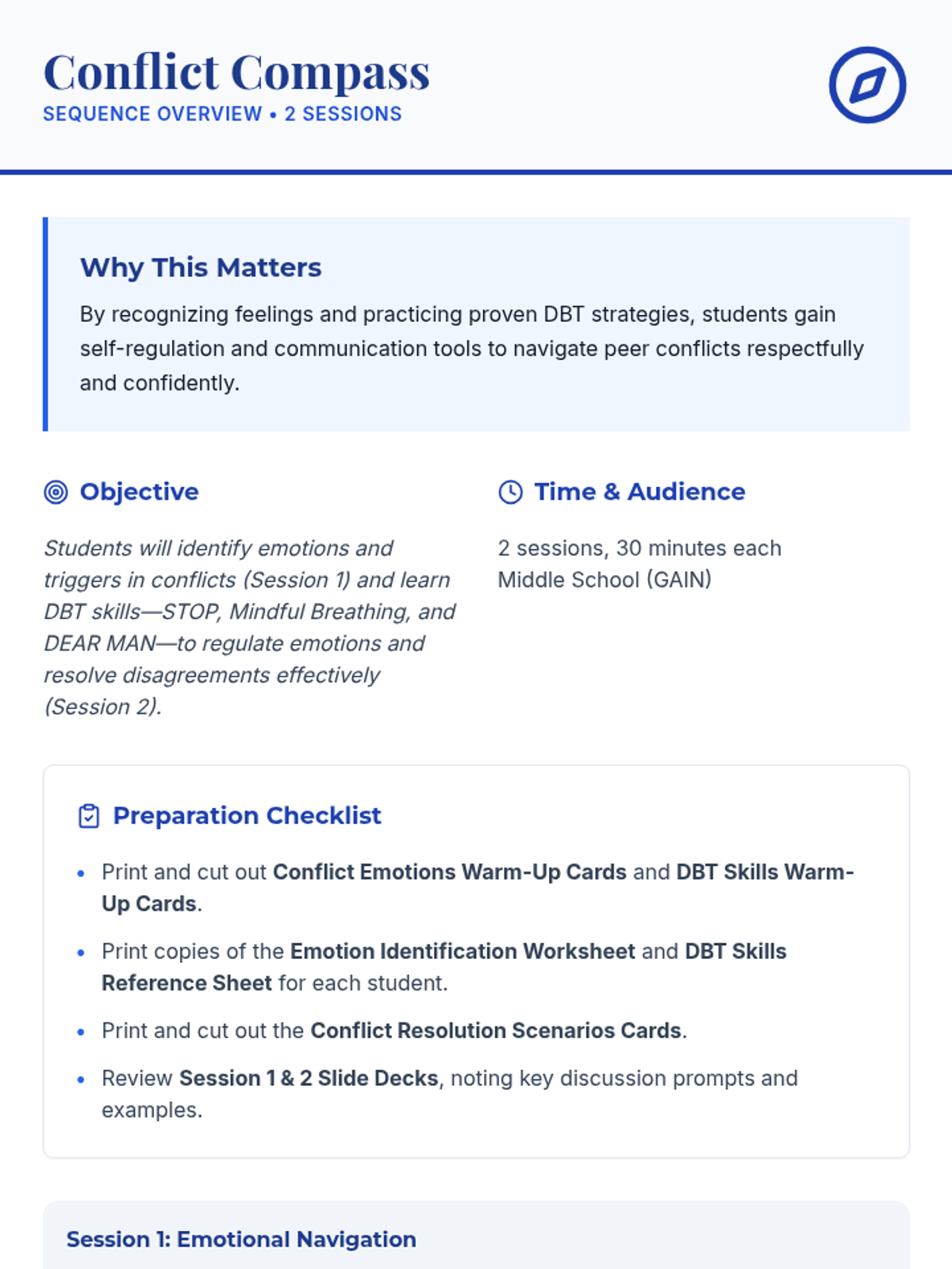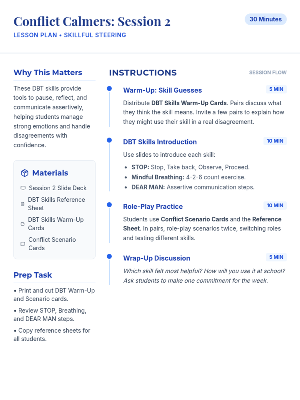 A two-session middle school unit where students learn DBT conflict resolution skills, including emotion identification and specific regulation strategies like STOP and DEAR MAN.