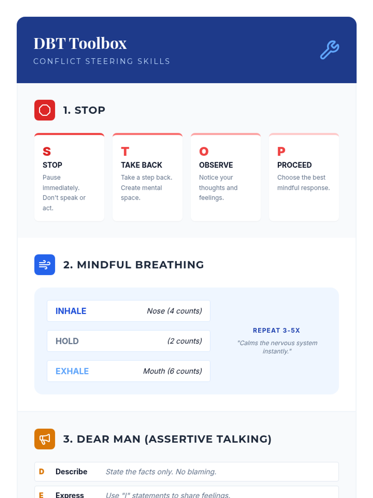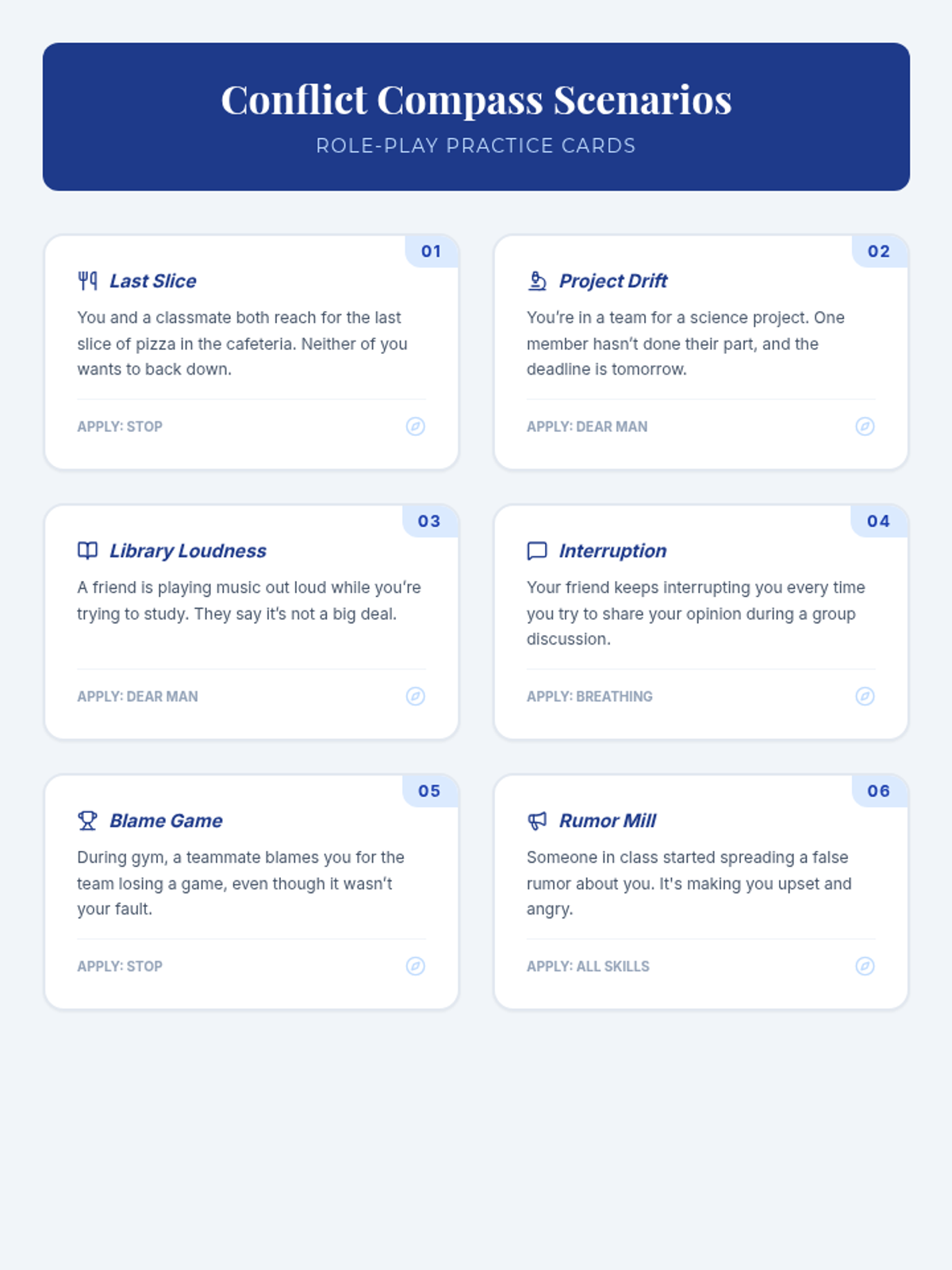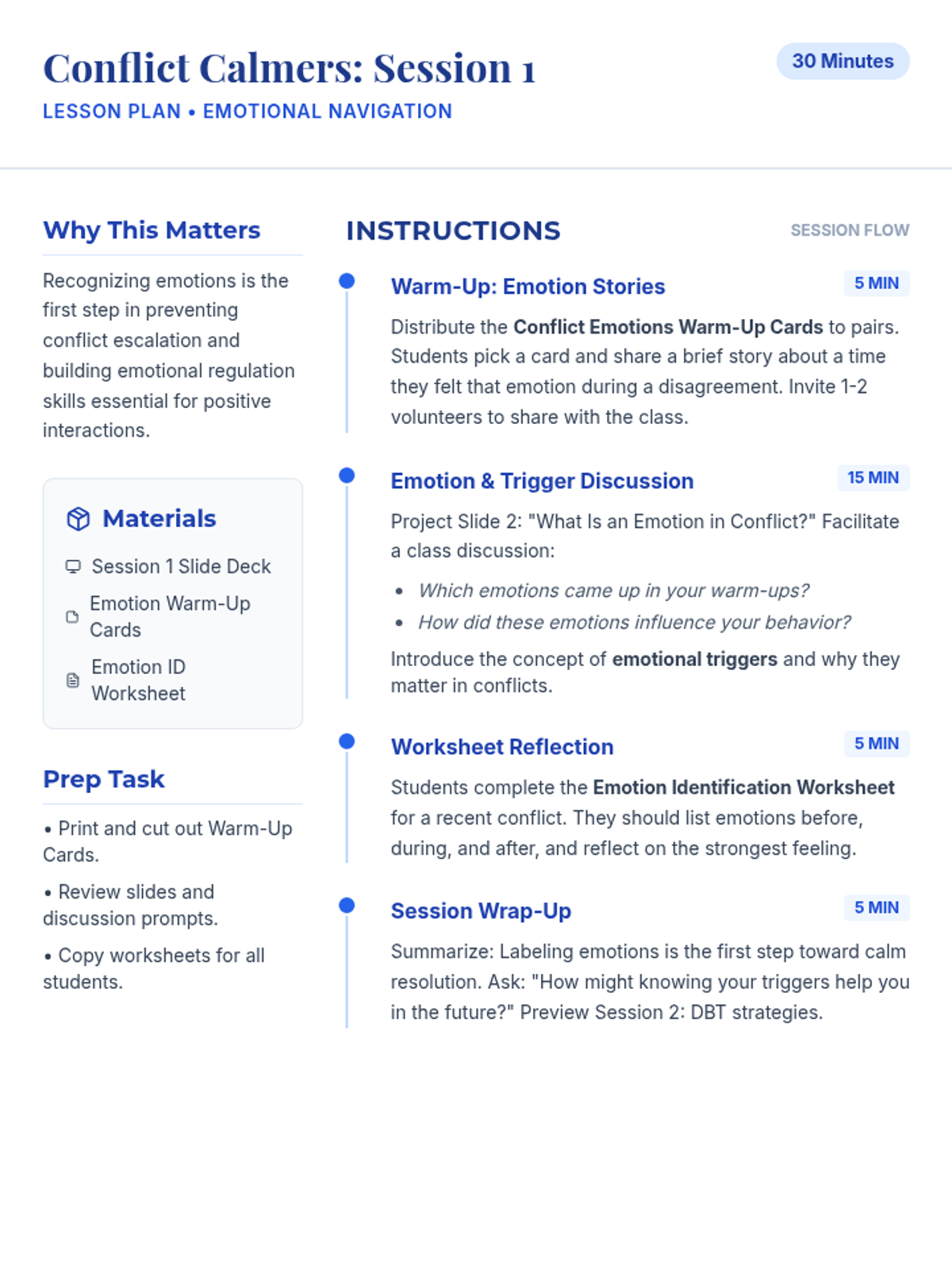 A two-session middle school unit where students learn DBT conflict resolution skills, including emotion identification and specific regulation strategies like STOP and DEAR MAN.