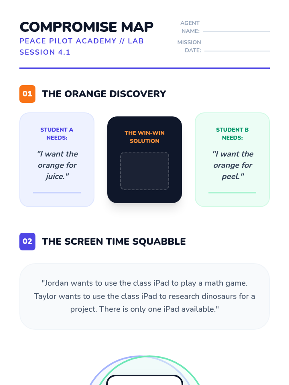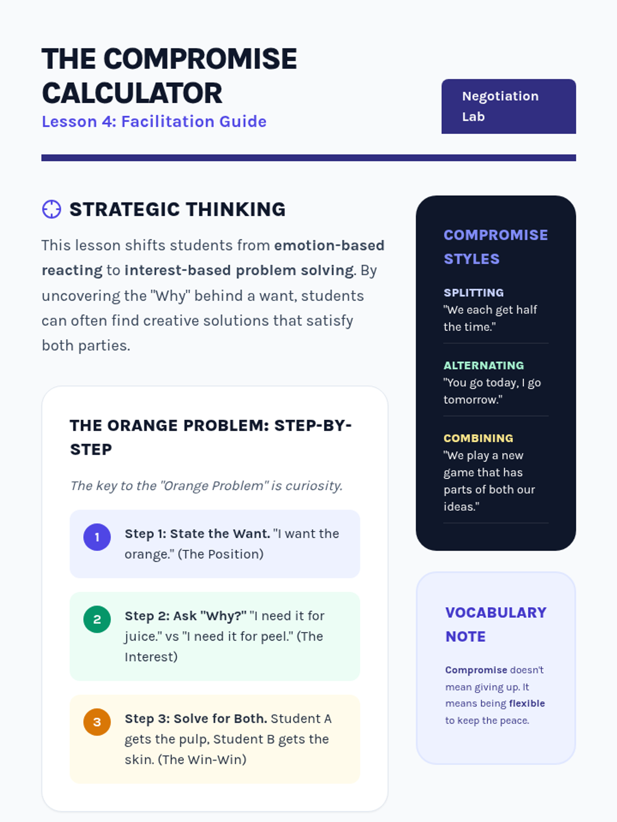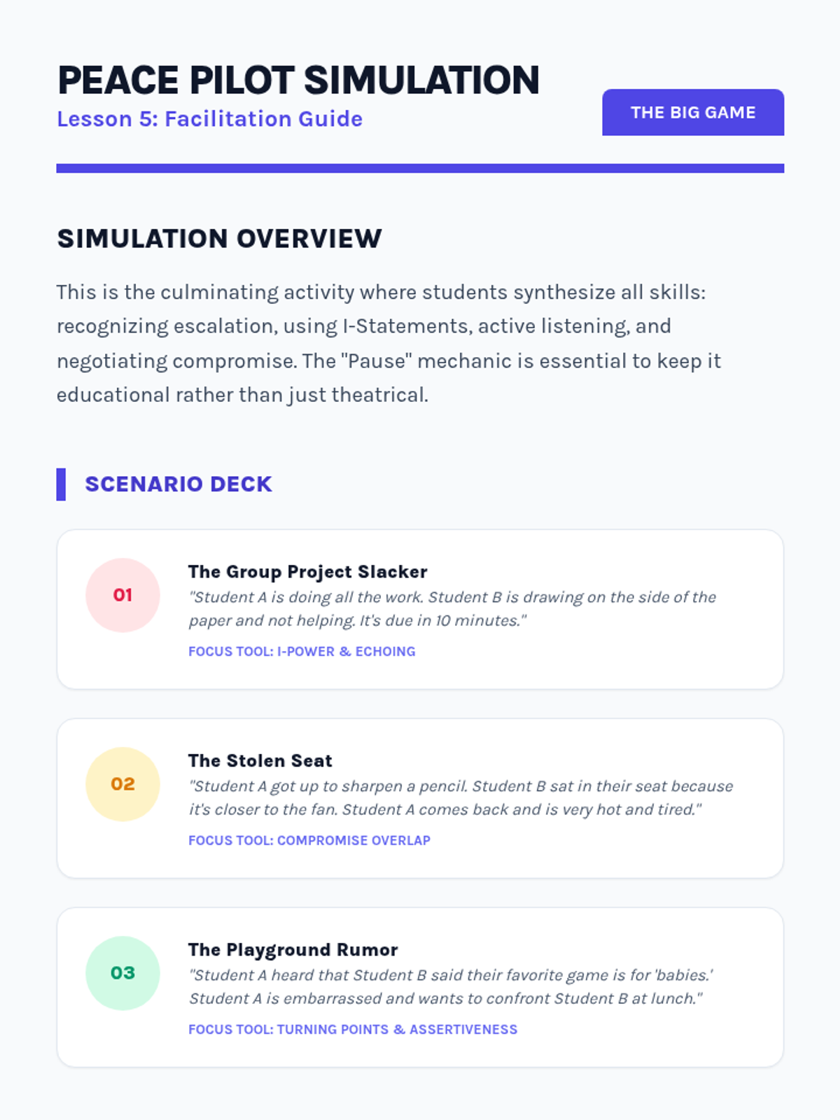 A 5th-grade social-emotional learning sequence that teaches students how to deconstruct conflict, use I-statements, practice active listening, and negotiate compromises through simulations and role-play.