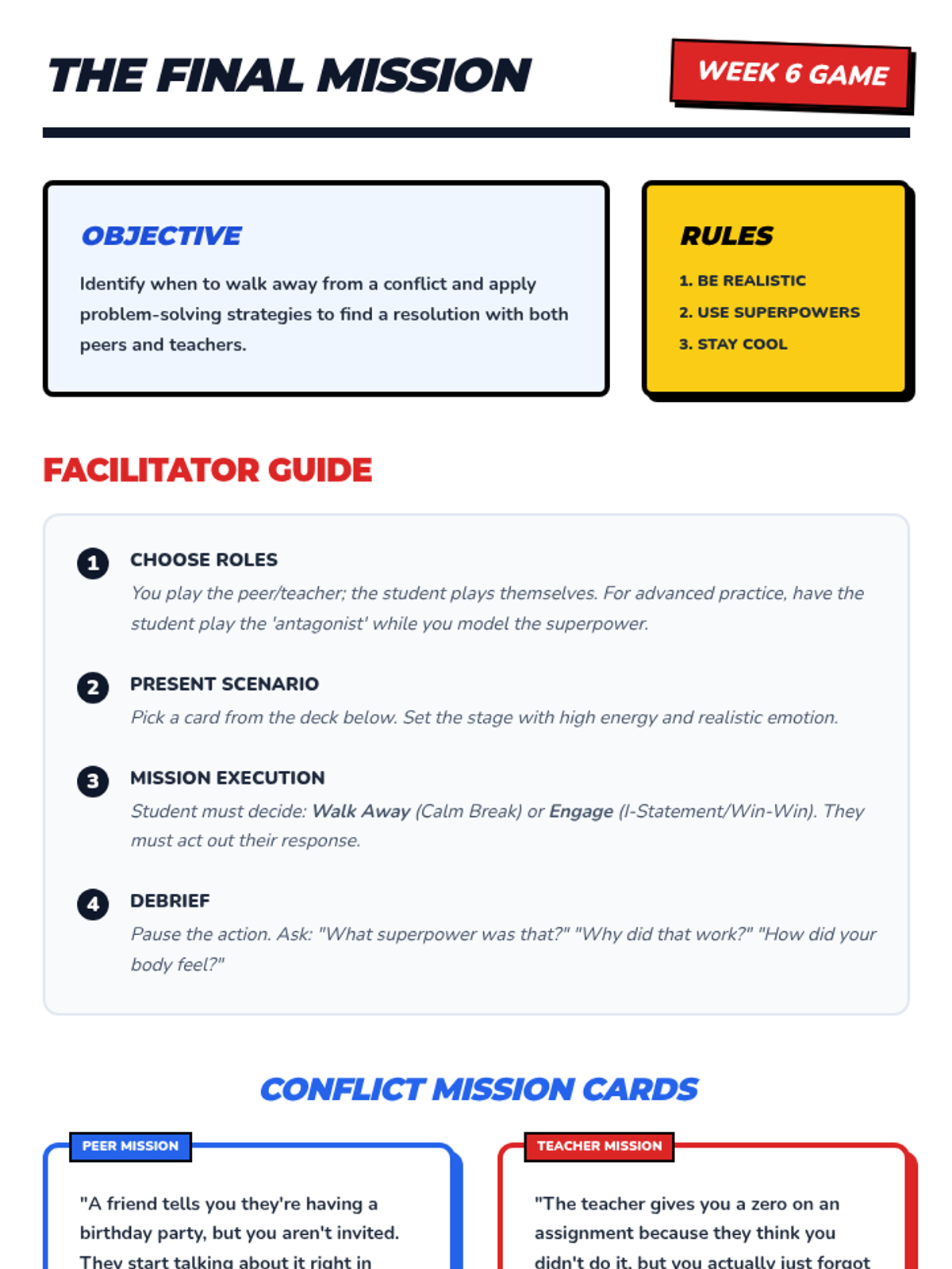 A 6-week Tier 3 intervention for 4th-grade students to master conflict management skills through the 'Conflict Crusader' framework. Students learn self-regulation, 'I Statements', and win-win problem-solving through progressive lessons and scenario-based practice.