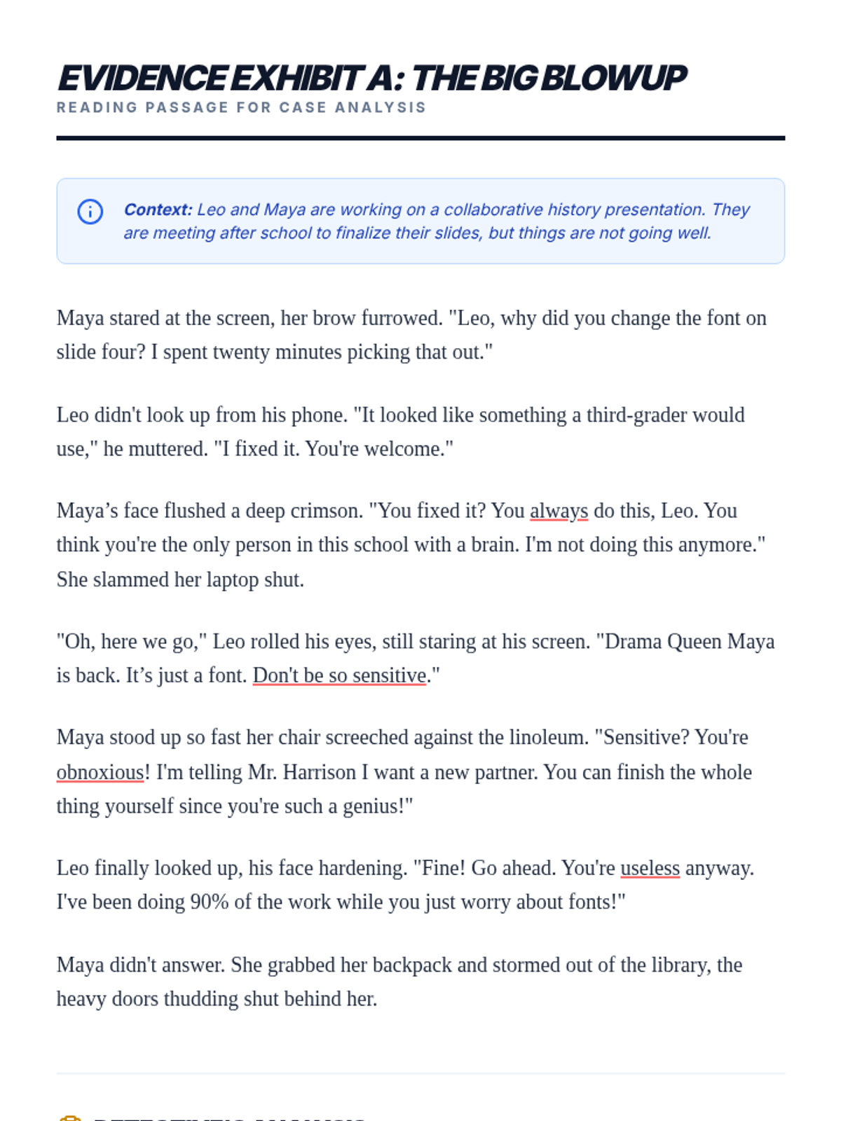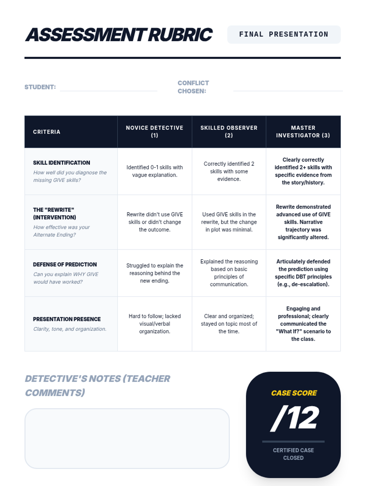 A 6th-grade sequence where students act as 'Communication Detectives' to analyze and apply DBT GIVE skills (Gentleness, Interest, Validation, Easy manner) within literature, history, and film to understand how communication shapes outcomes.