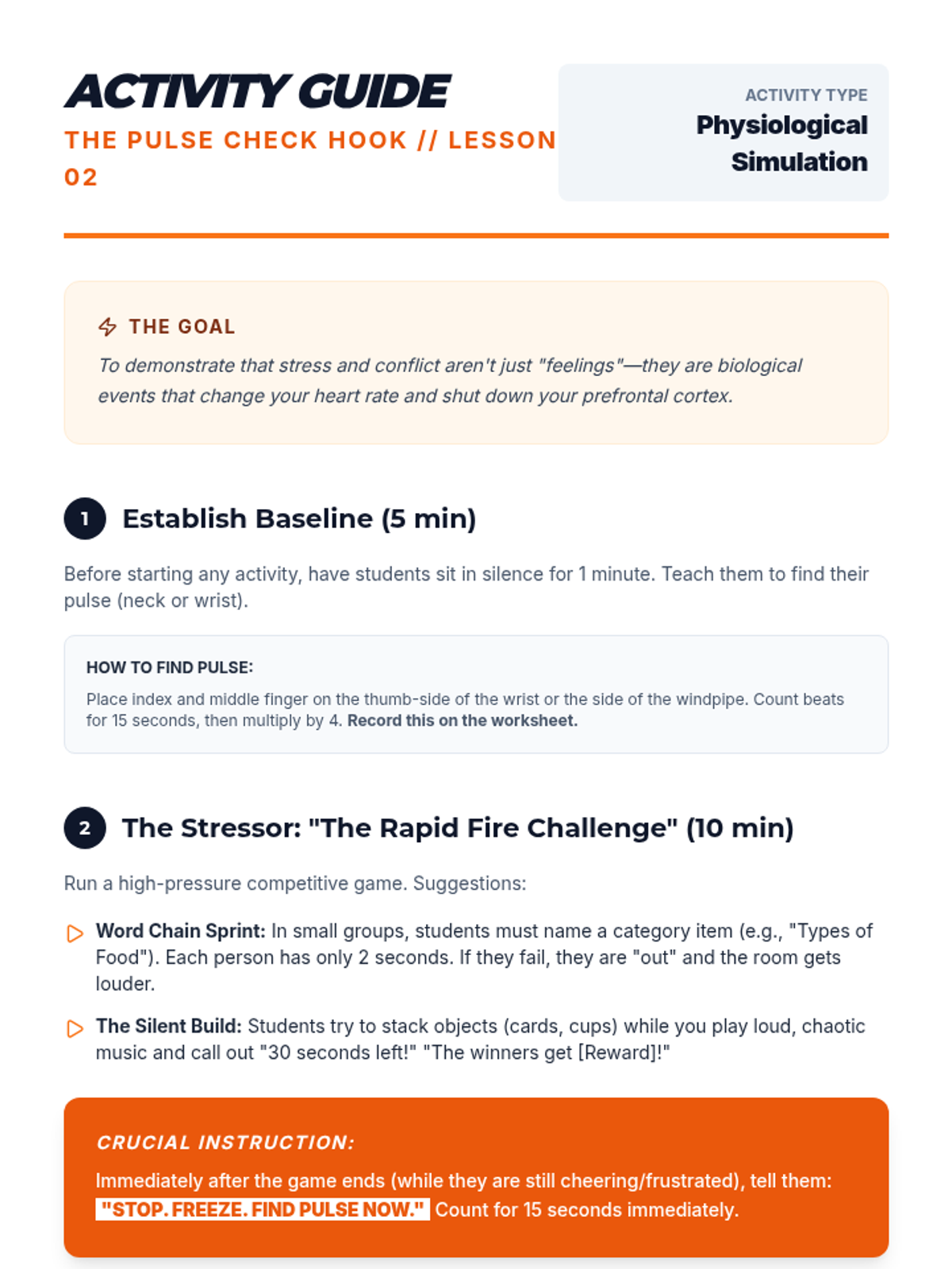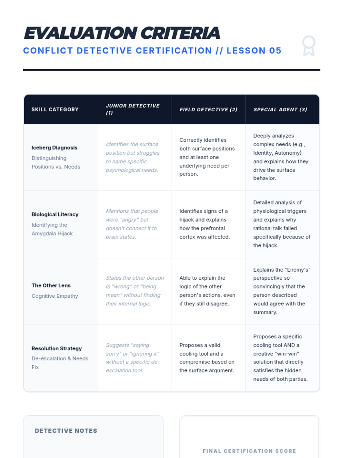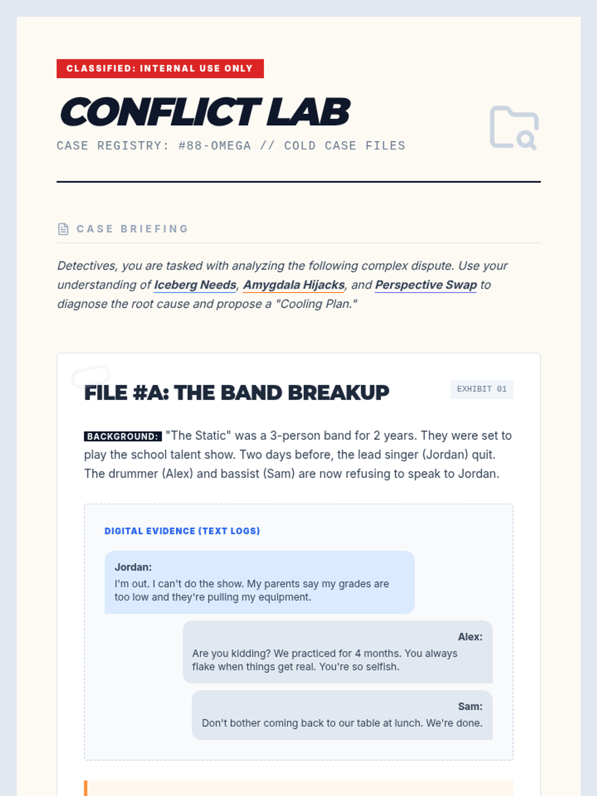 An 8th-grade counseling sequence focused on identifying the psychological root causes of conflict and managing high-arousal emotions using the Conflict Iceberg model and neuroscience-based de-escalation.