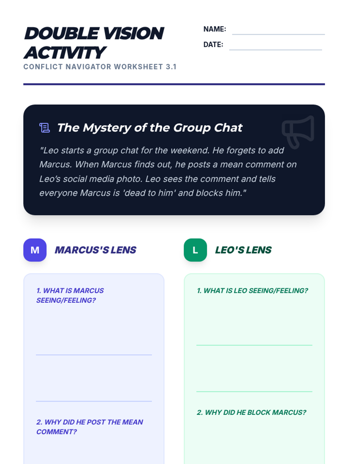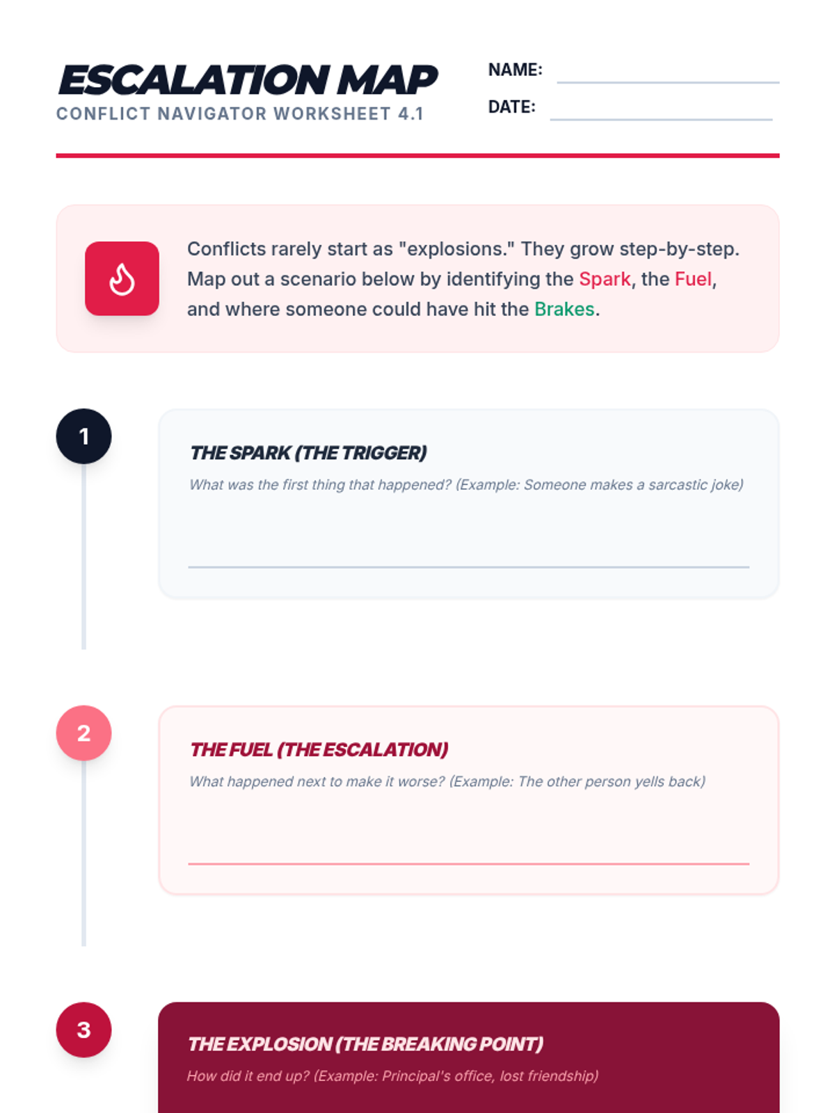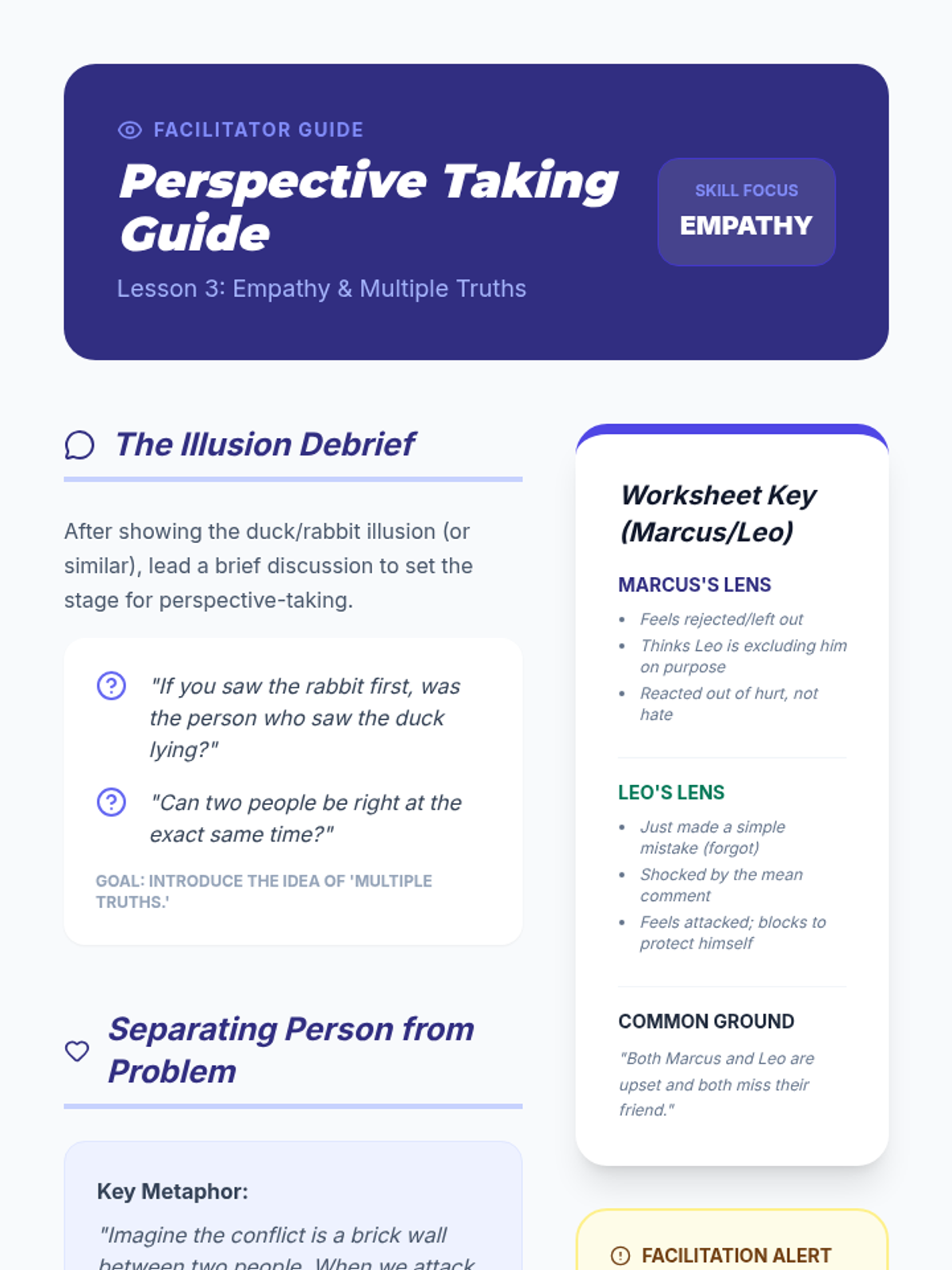 A comprehensive 6th-grade sequence on conflict navigation, teaching students to identify root causes, recognize personal conflict styles, practice perspective-taking, understand escalation, and diagnose complex disputes.