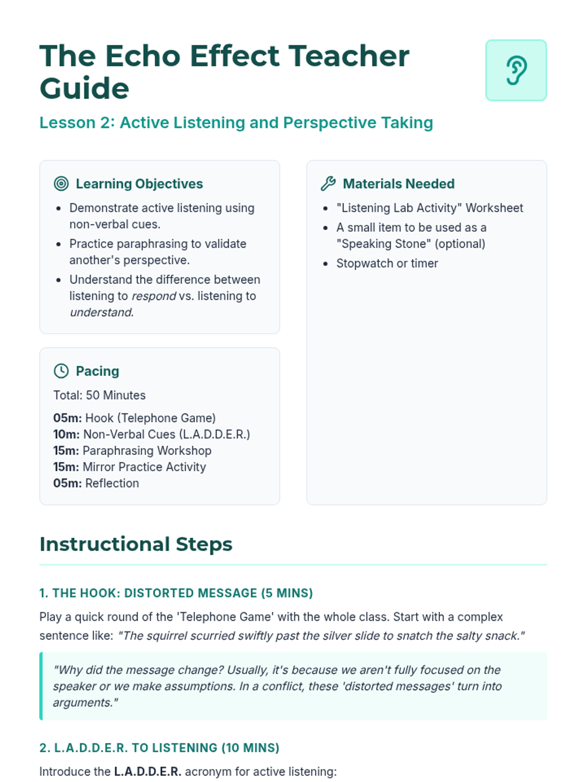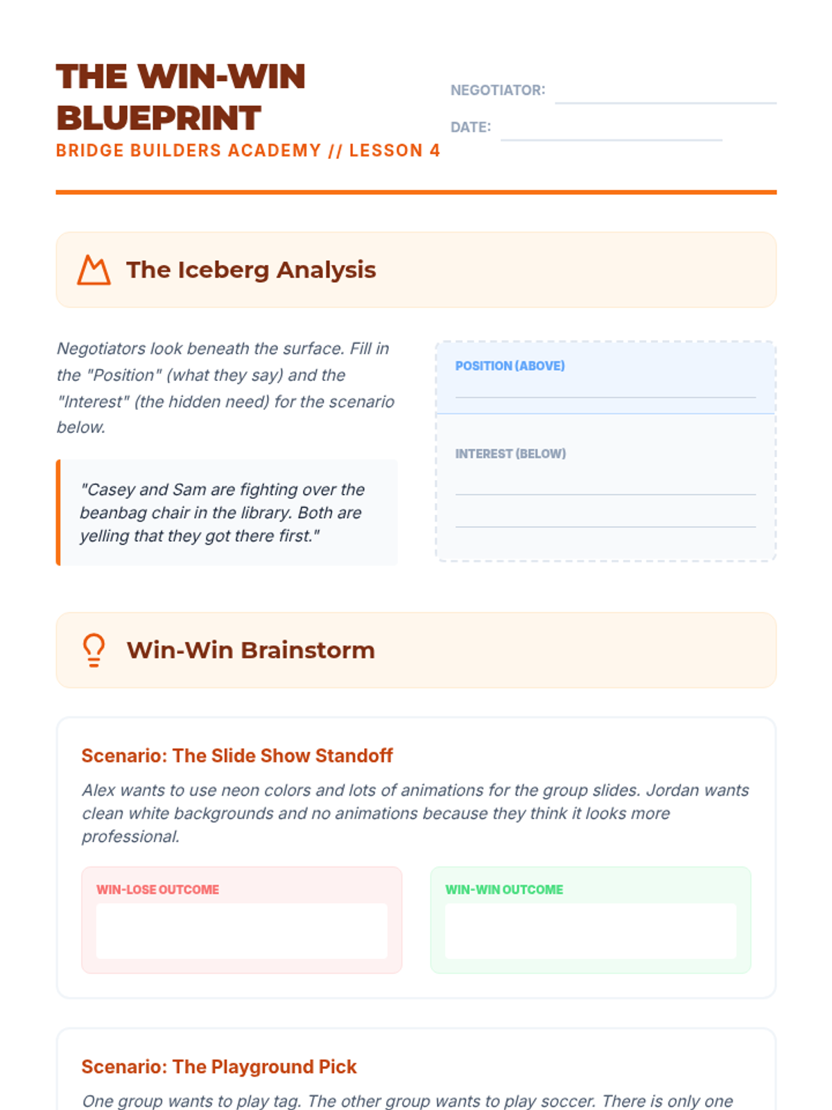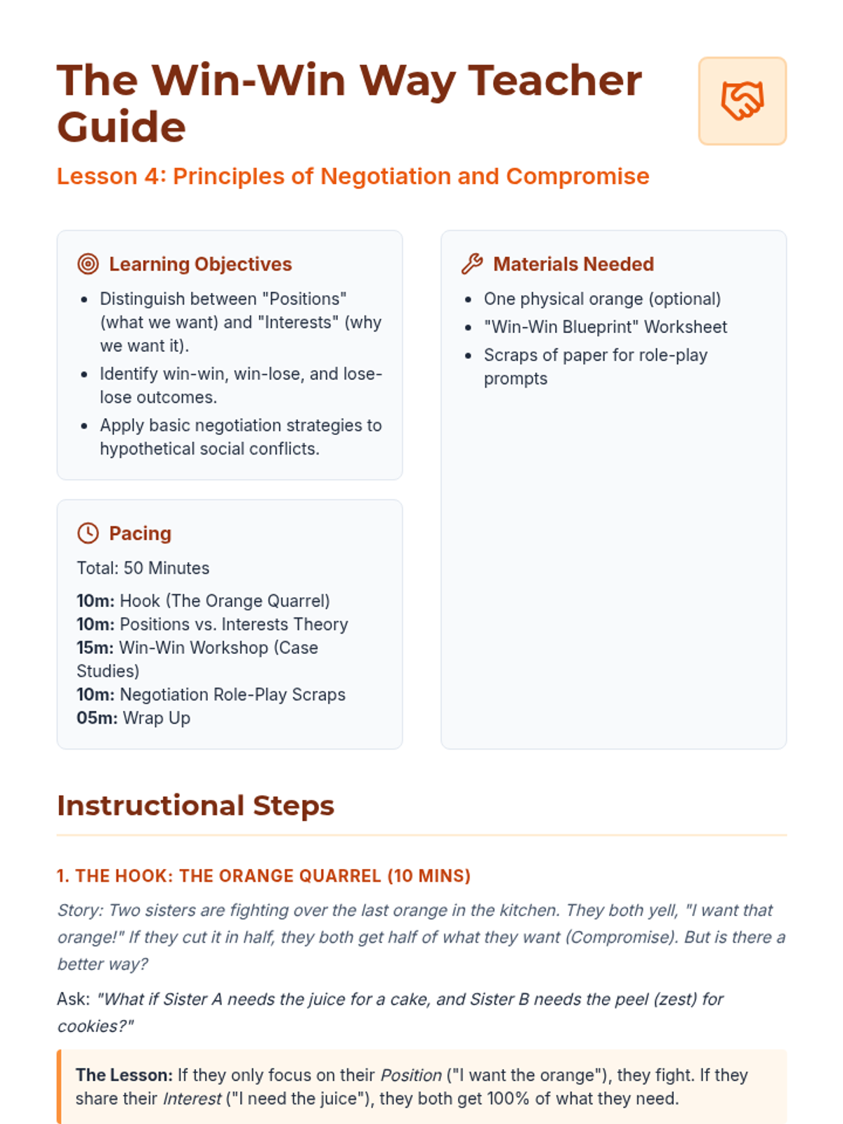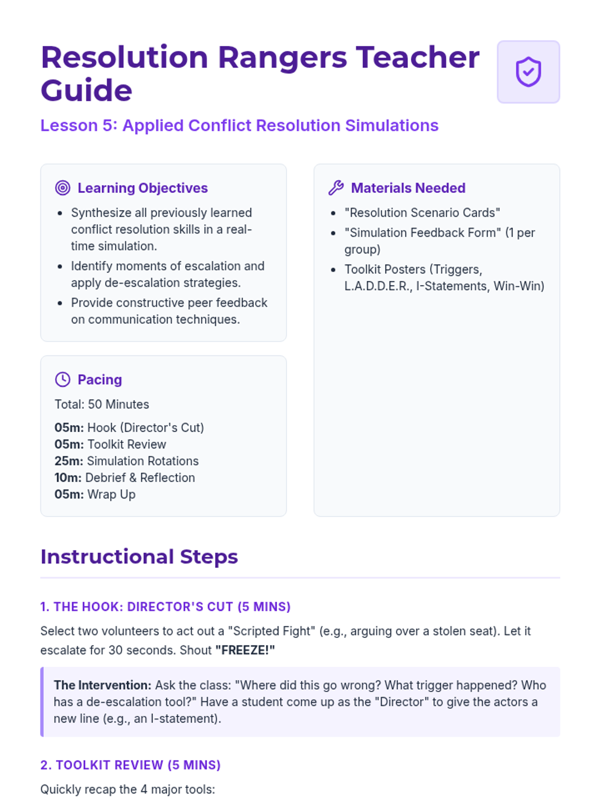 A comprehensive 5-lesson sequence for 6th-grade students on conflict resolution, covering triggers, escalation, active listening, assertive communication, and negotiation. Students will build a practical toolkit for managing interpersonal disputes peacefully and effectively.