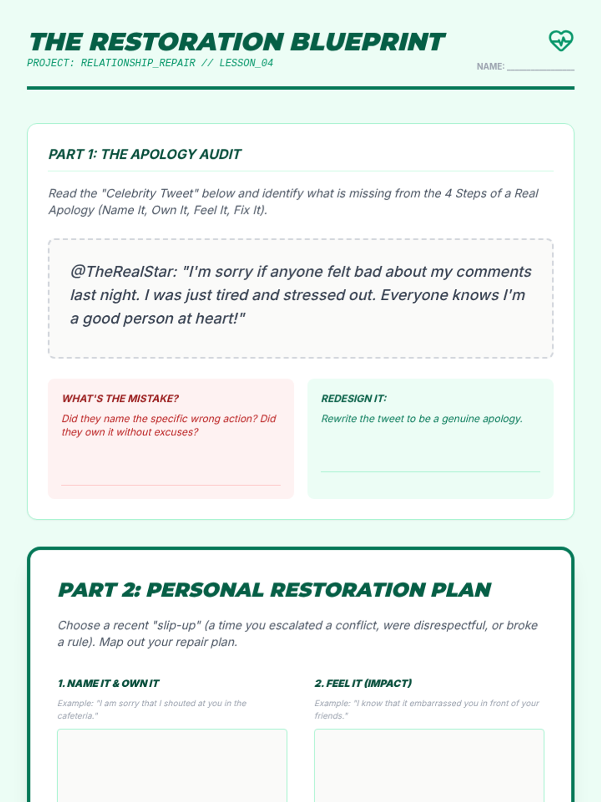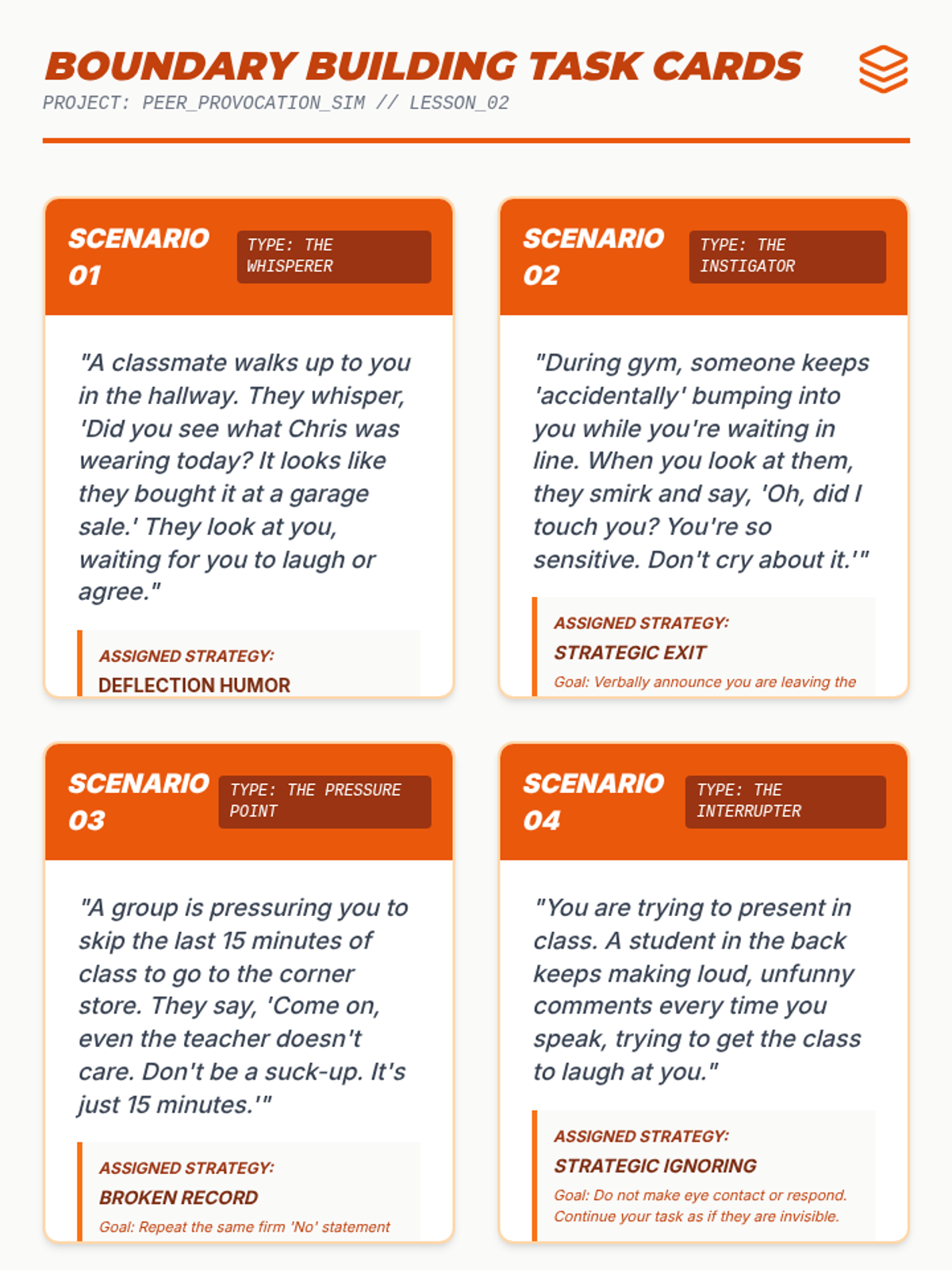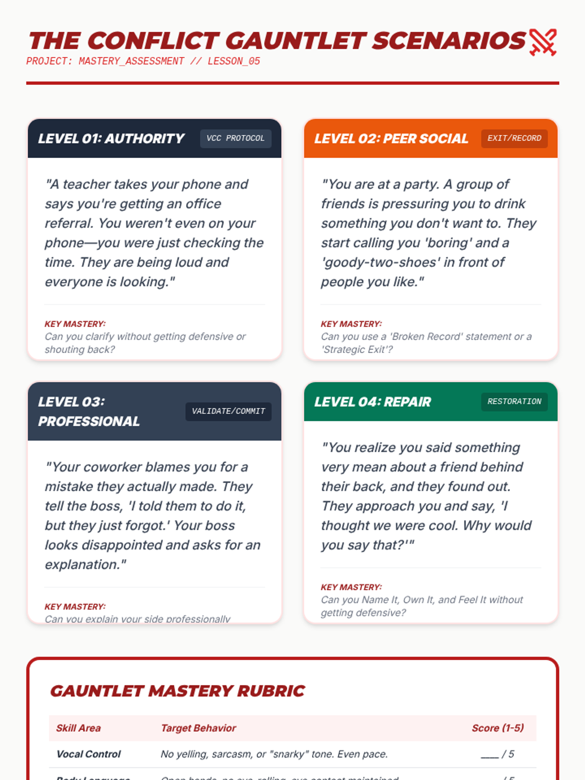 A 10th-grade sequence focused on de-escalation, conflict resolution, and restorative practices using a 'Blueprint for Peace' architectural theme. Students progress from analyzing conflict cycles to real-time simulations and relationship repair.