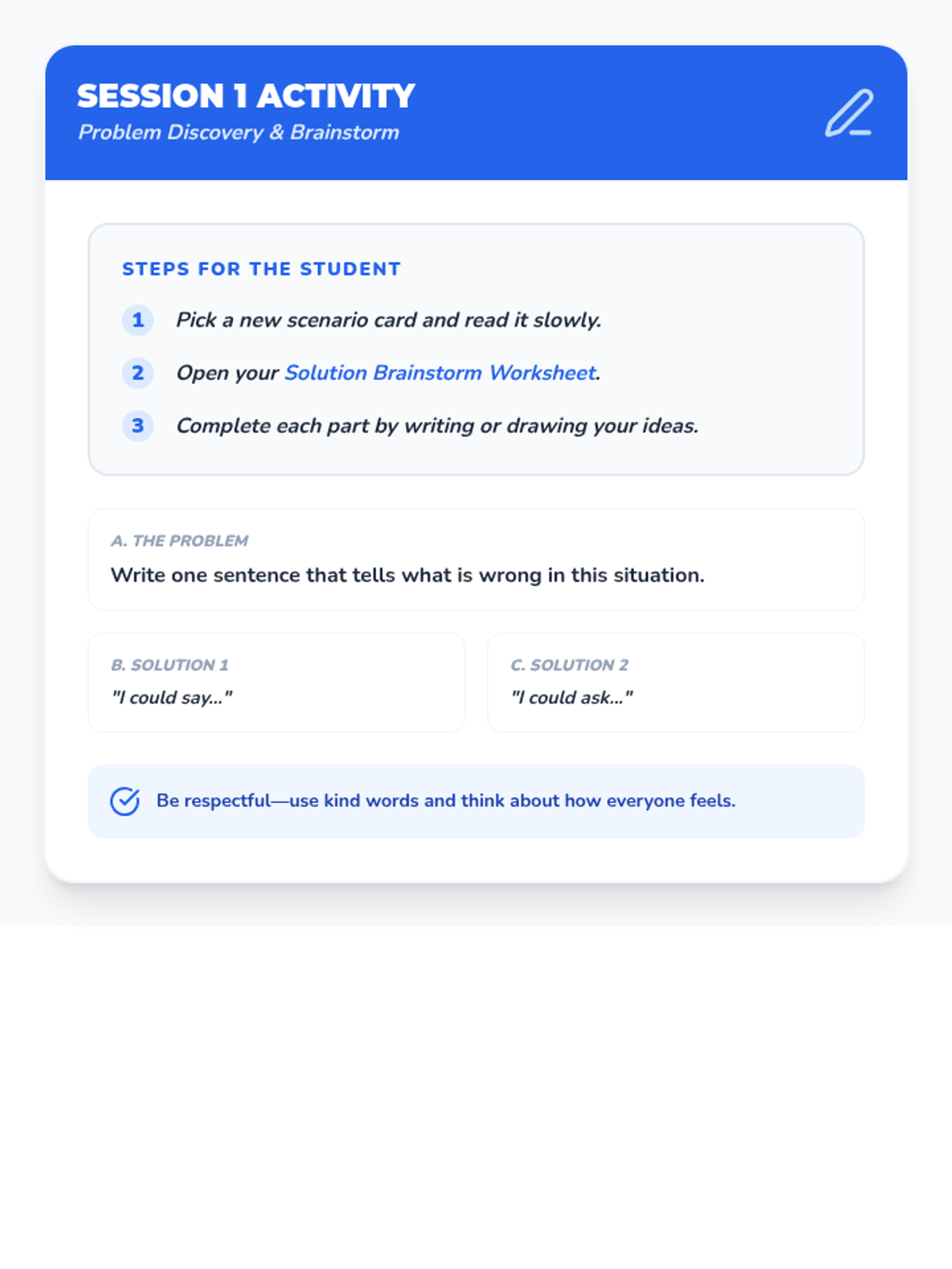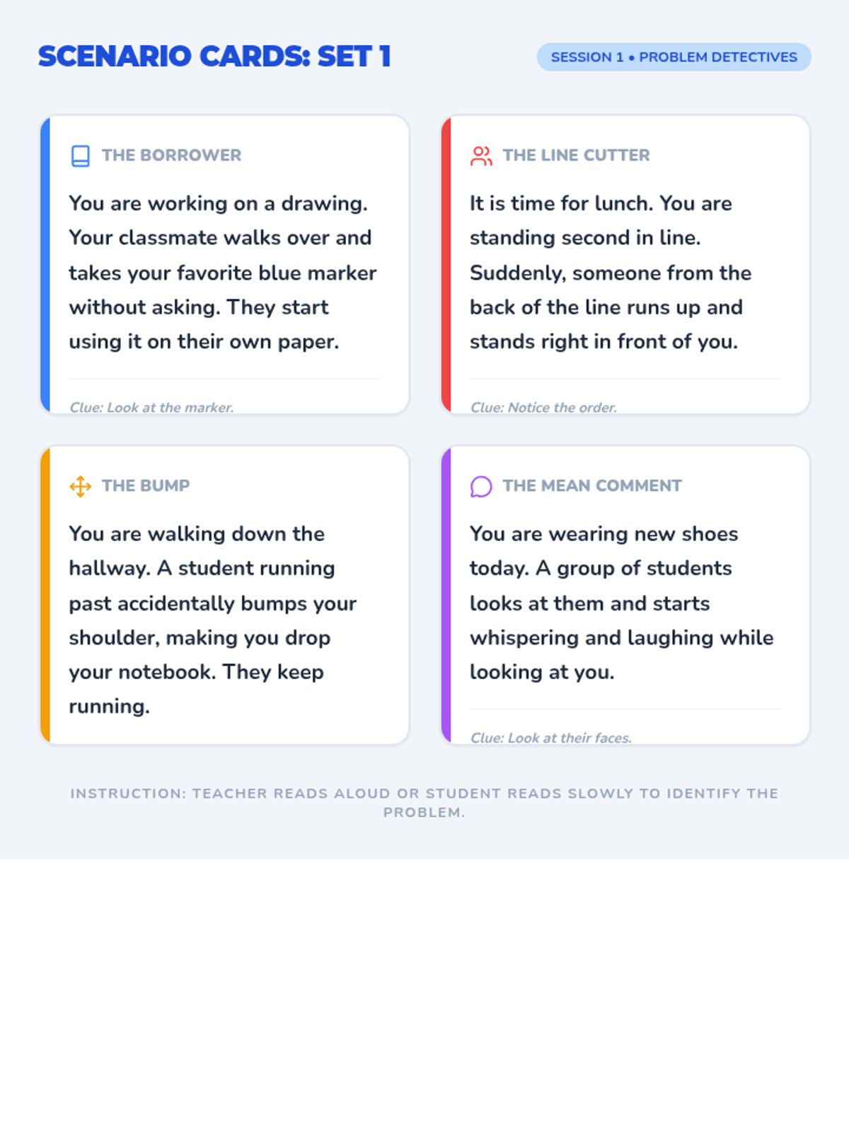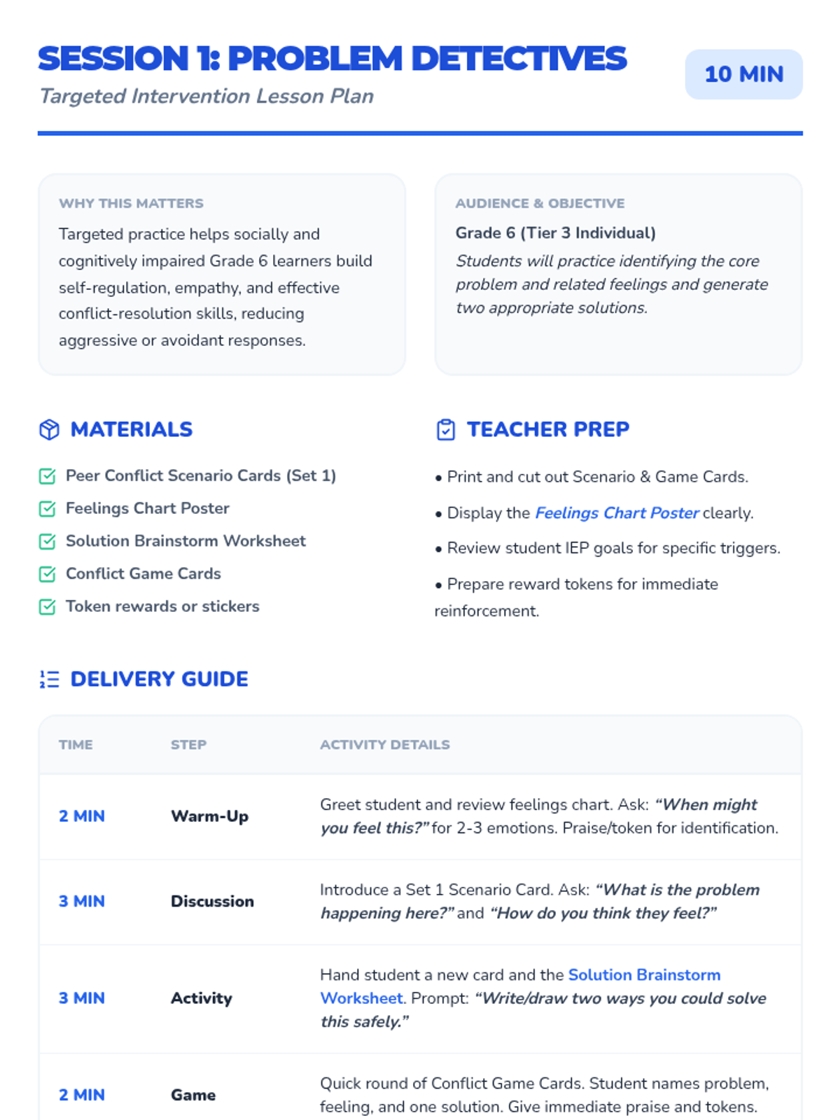 A 3-session intensive Tier 3 intervention for Grade 6 students focusing on identifying peer conflict problems, recognizing emotions, and generating respectful solutions. This sequence uses a 'Social Lab' theme to make problem-solving feel like a structured, detective-like process.