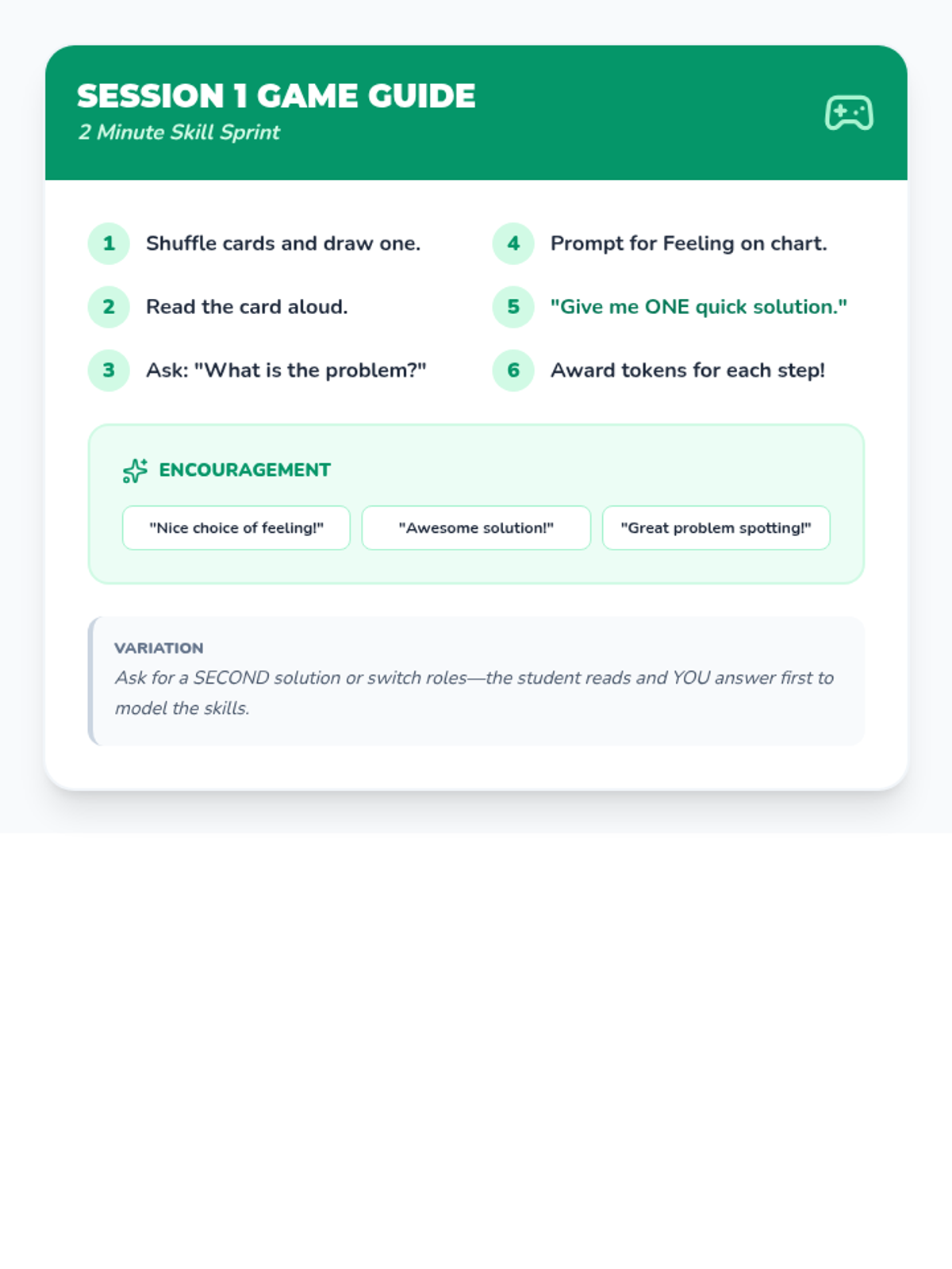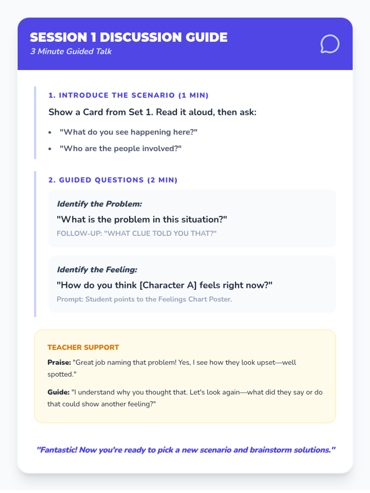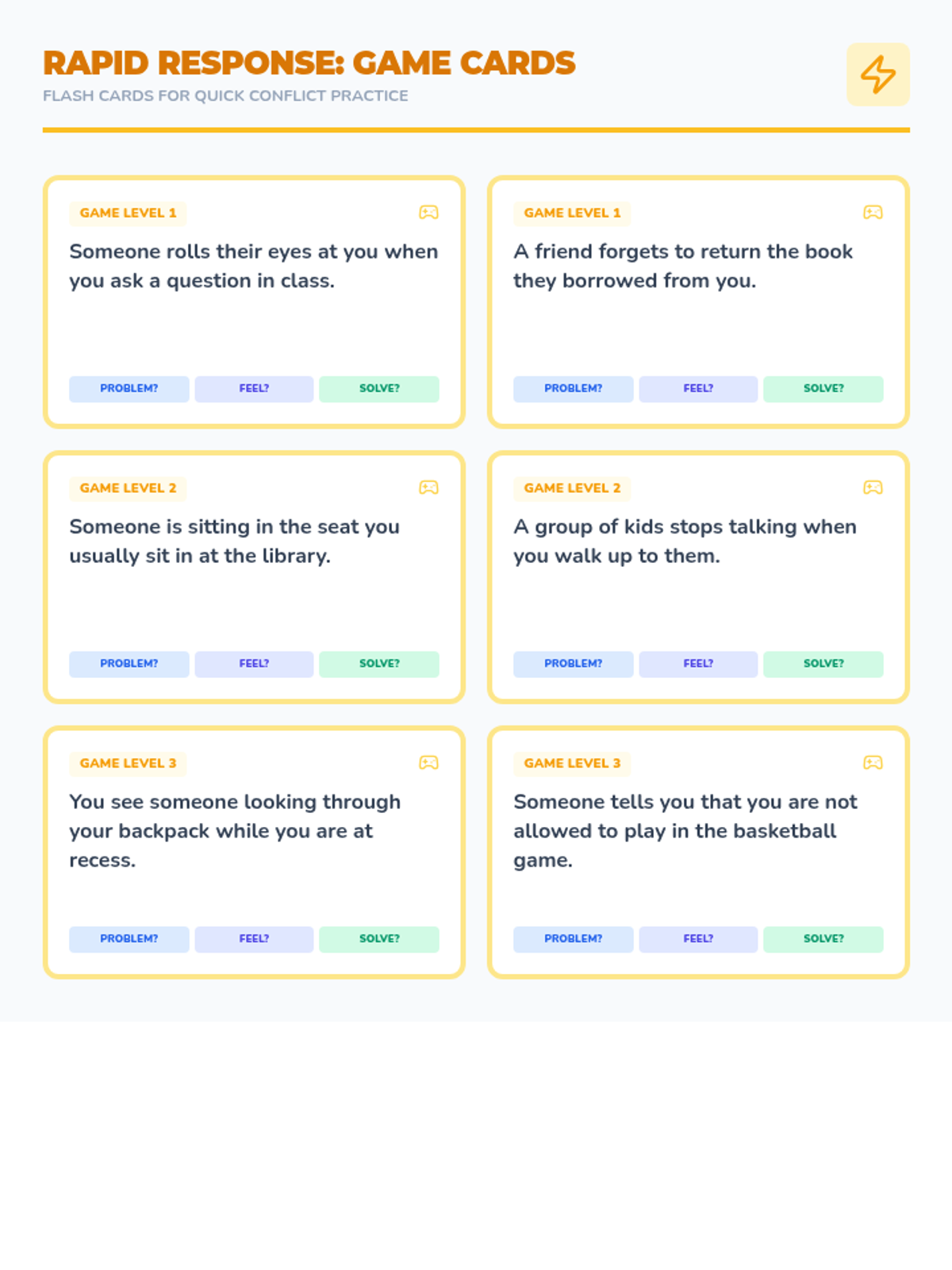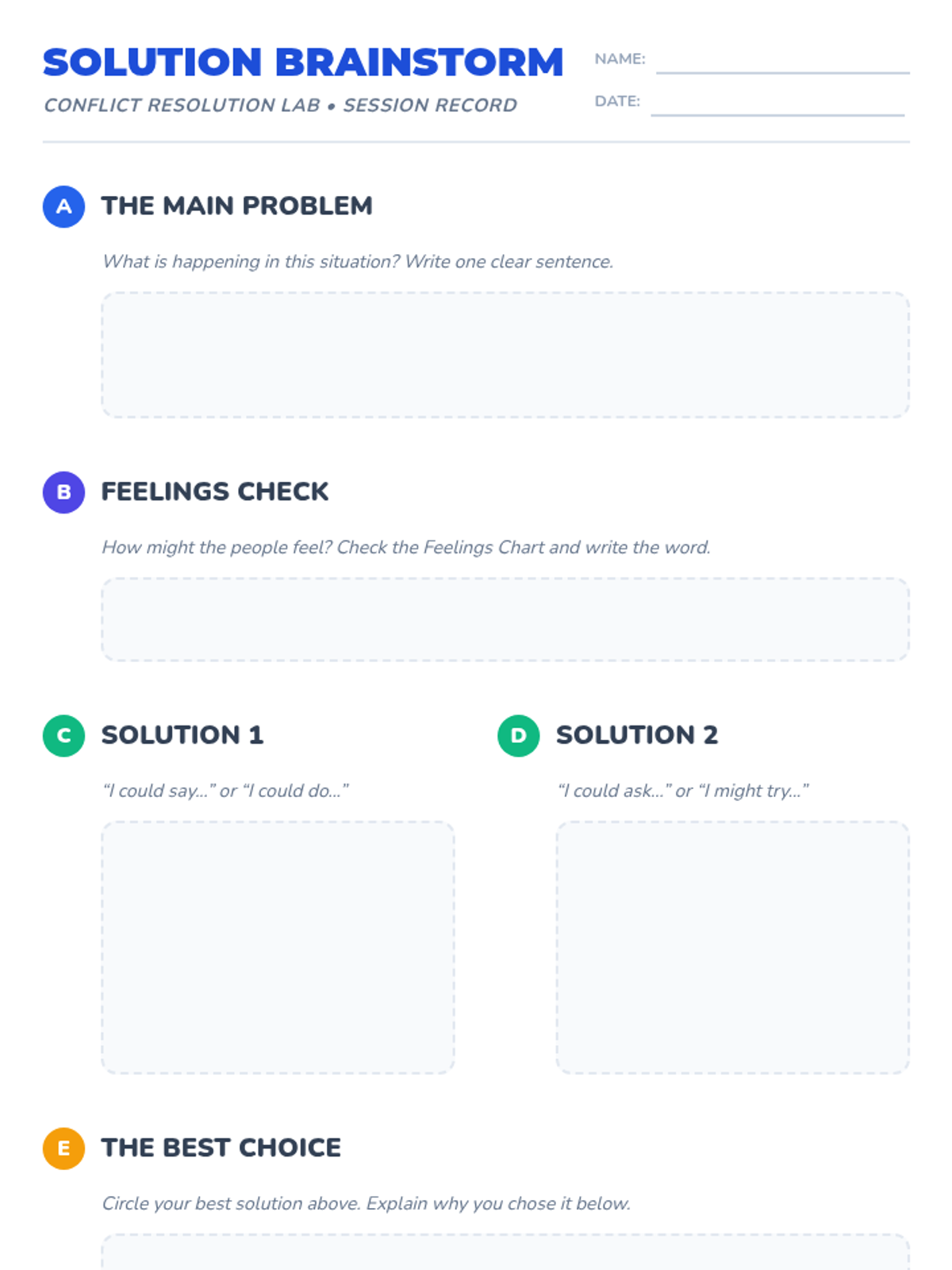 A 3-session intensive Tier 3 intervention for Grade 6 students focusing on identifying peer conflict problems, recognizing emotions, and generating respectful solutions. This sequence uses a 'Social Lab' theme to make problem-solving feel like a structured, detective-like process.