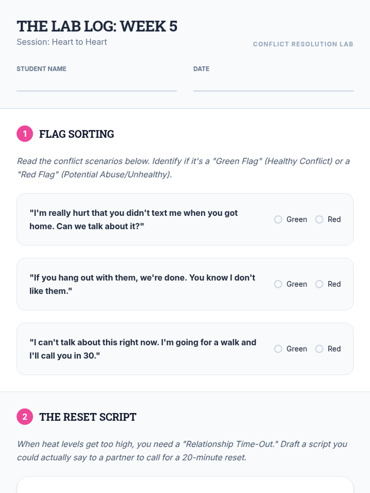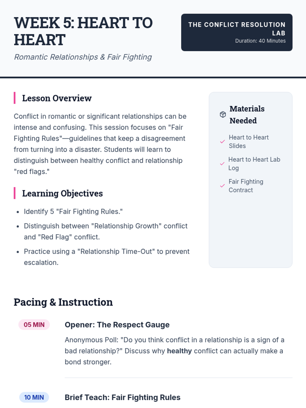A 6-week curriculum for 11th and 12th graders focused on practical conflict resolution strategies with peers, teachers, parents, and romantic partners.