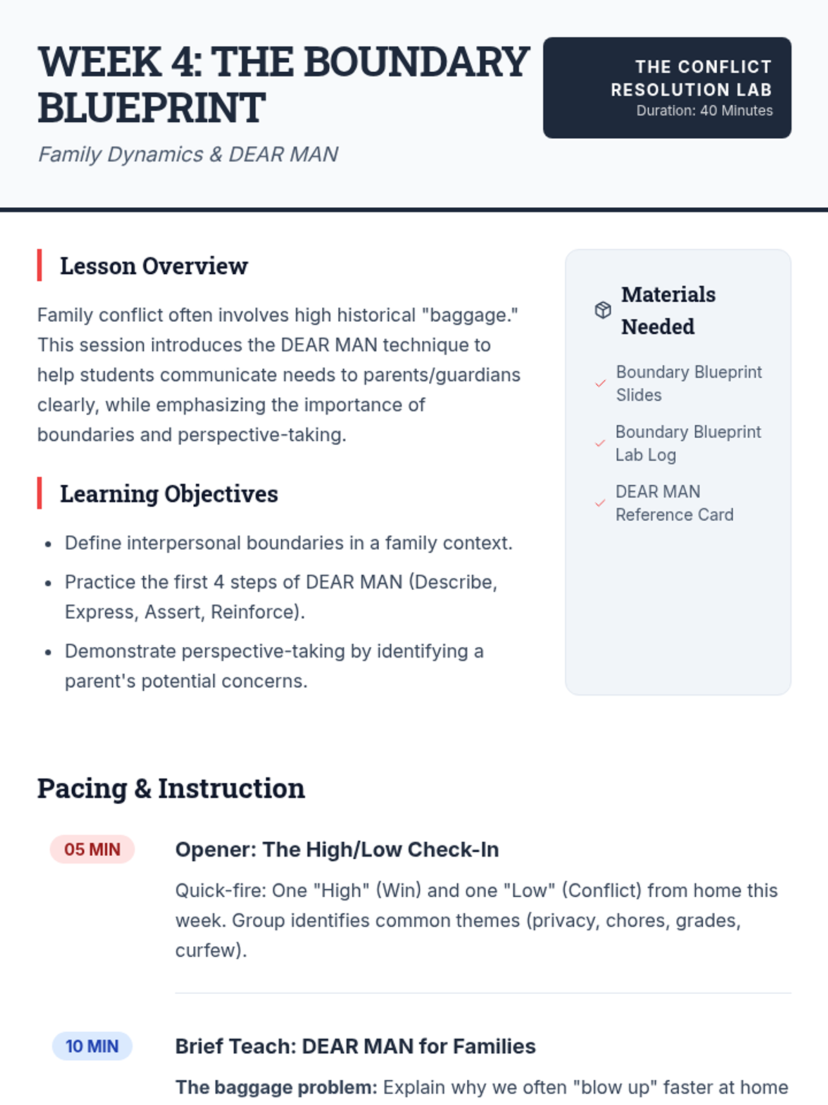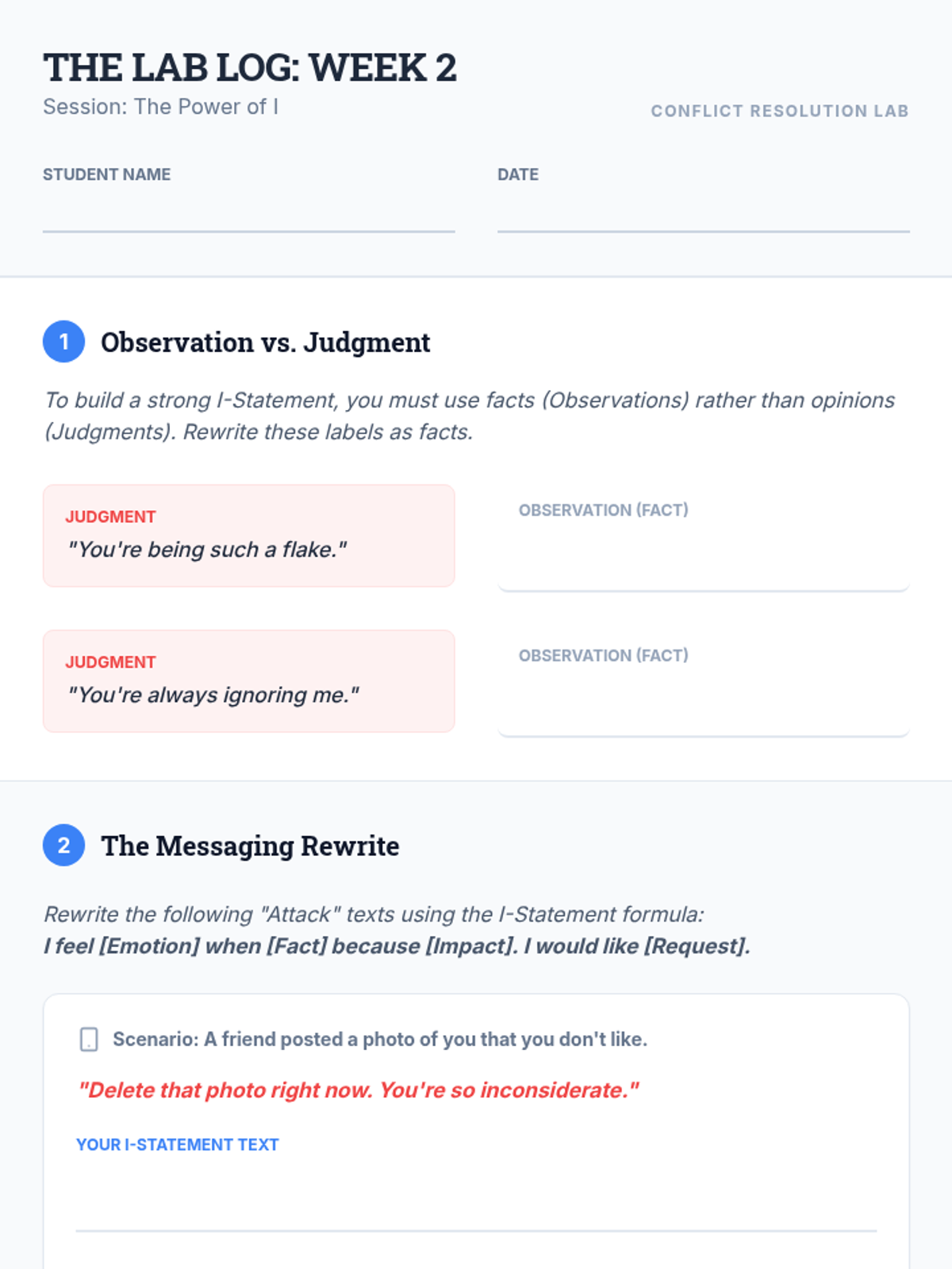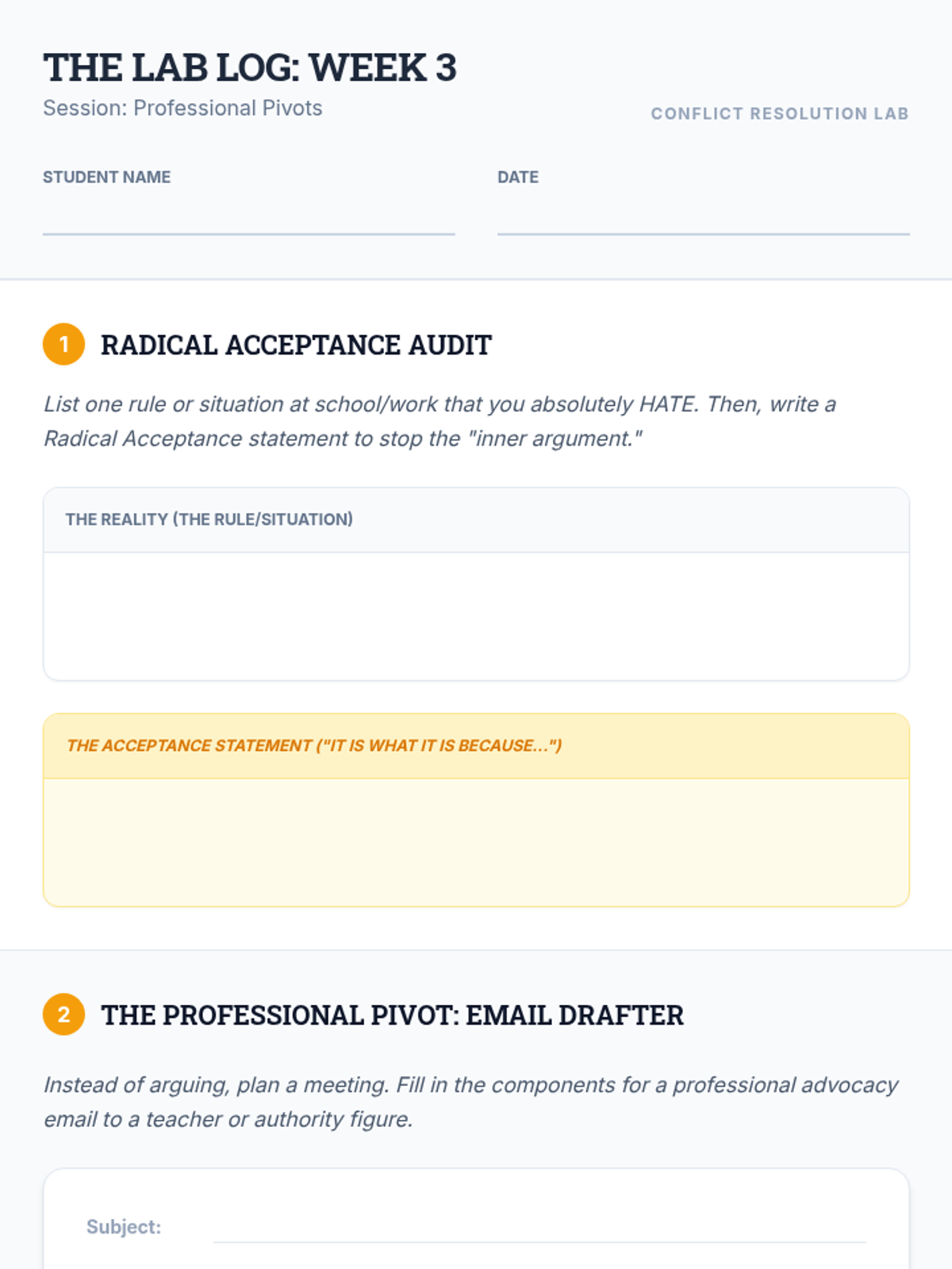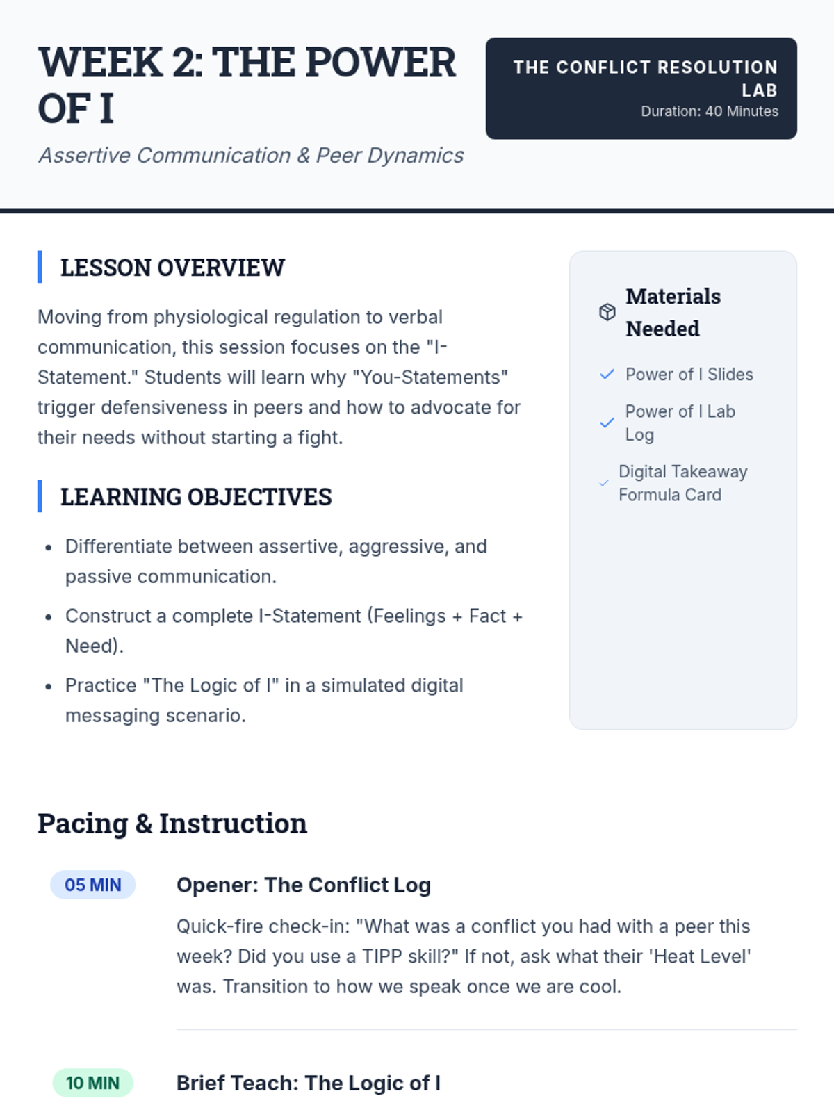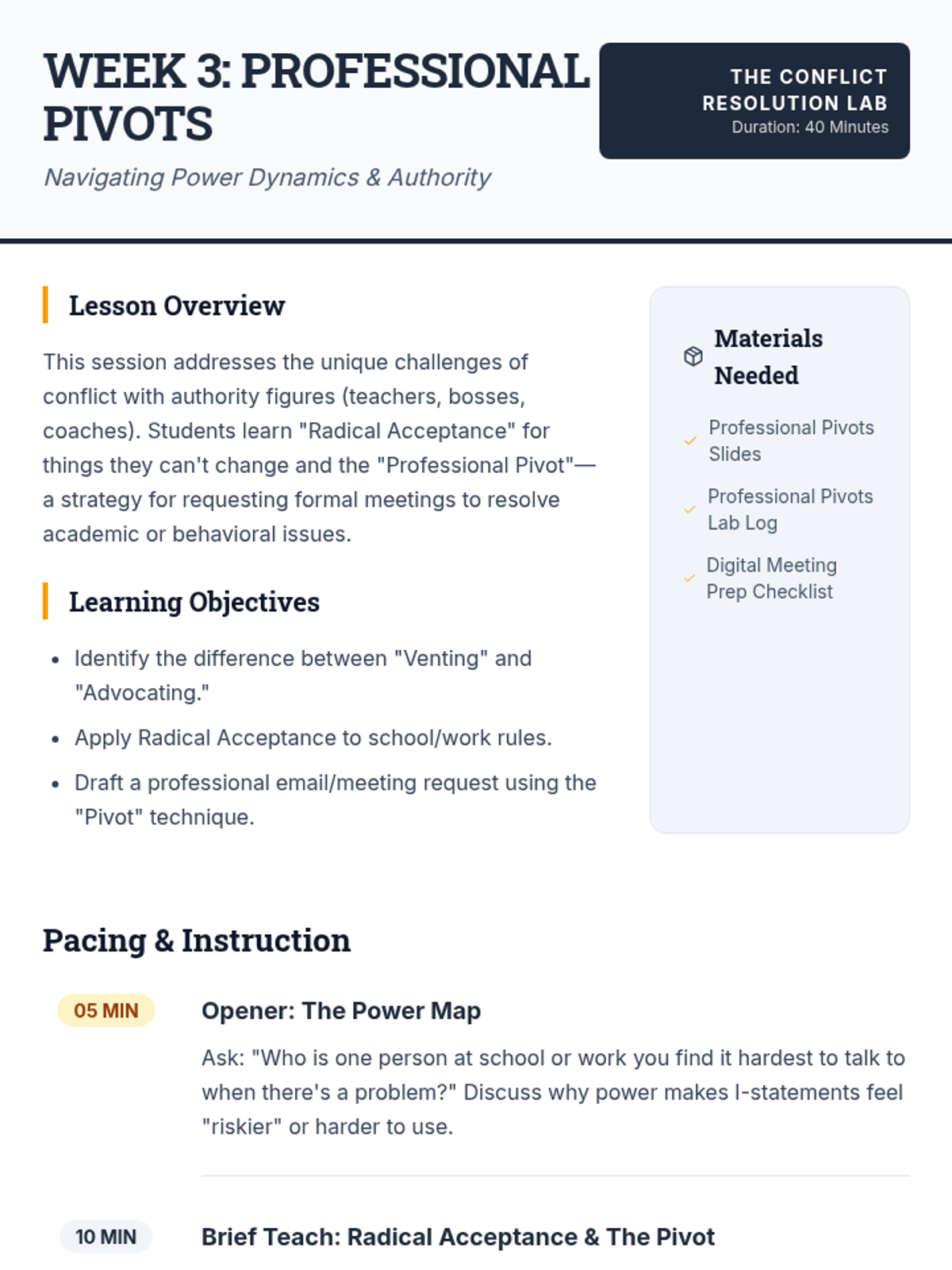 An advanced five-part professional development series for 11th graders focusing on the psychology of conflict, high-stakes communication, and strategic diplomacy. Students prepare for adult environments by mastering emotional intelligence, interest-based negotiation, and professional digital protocols.