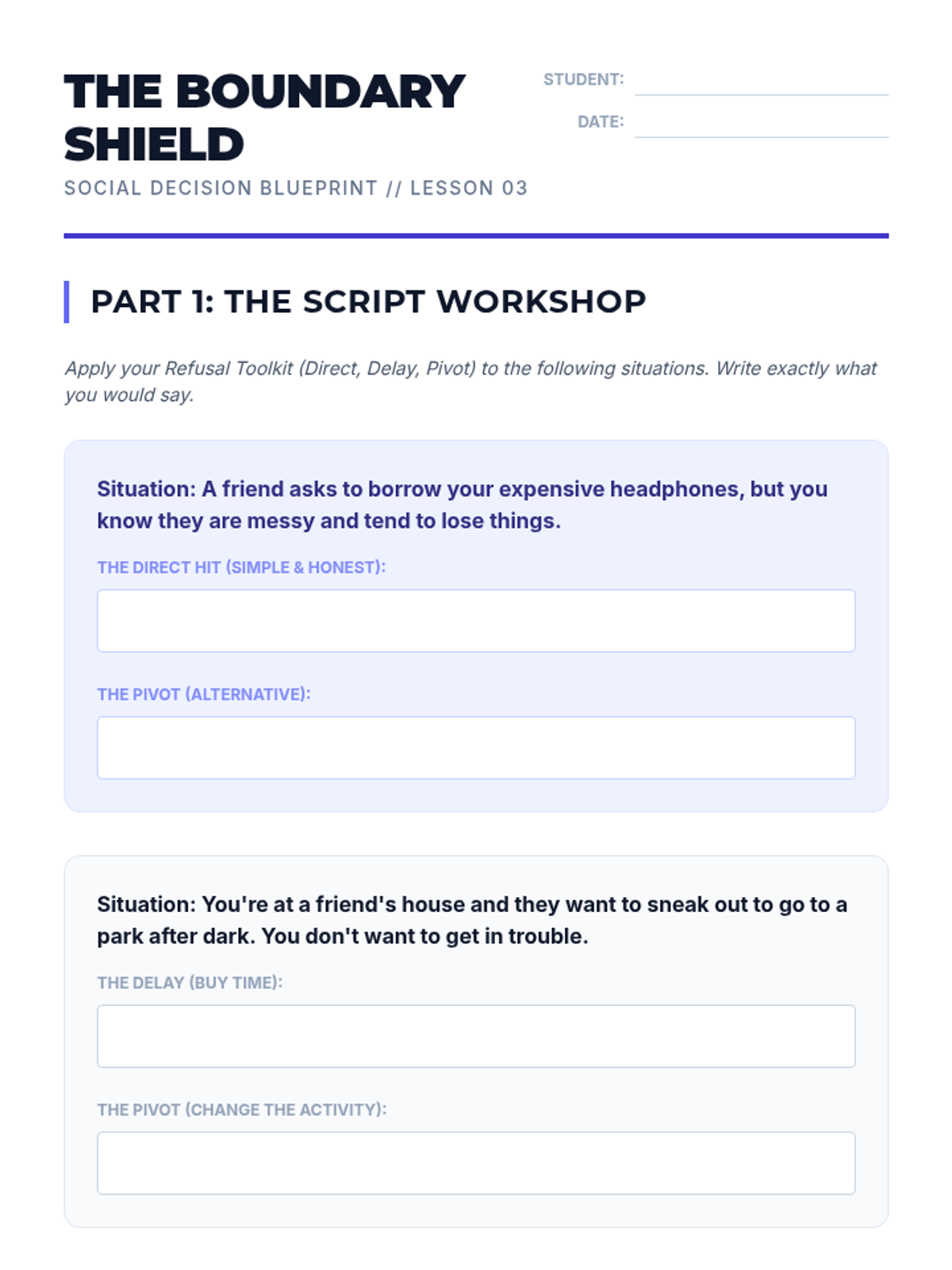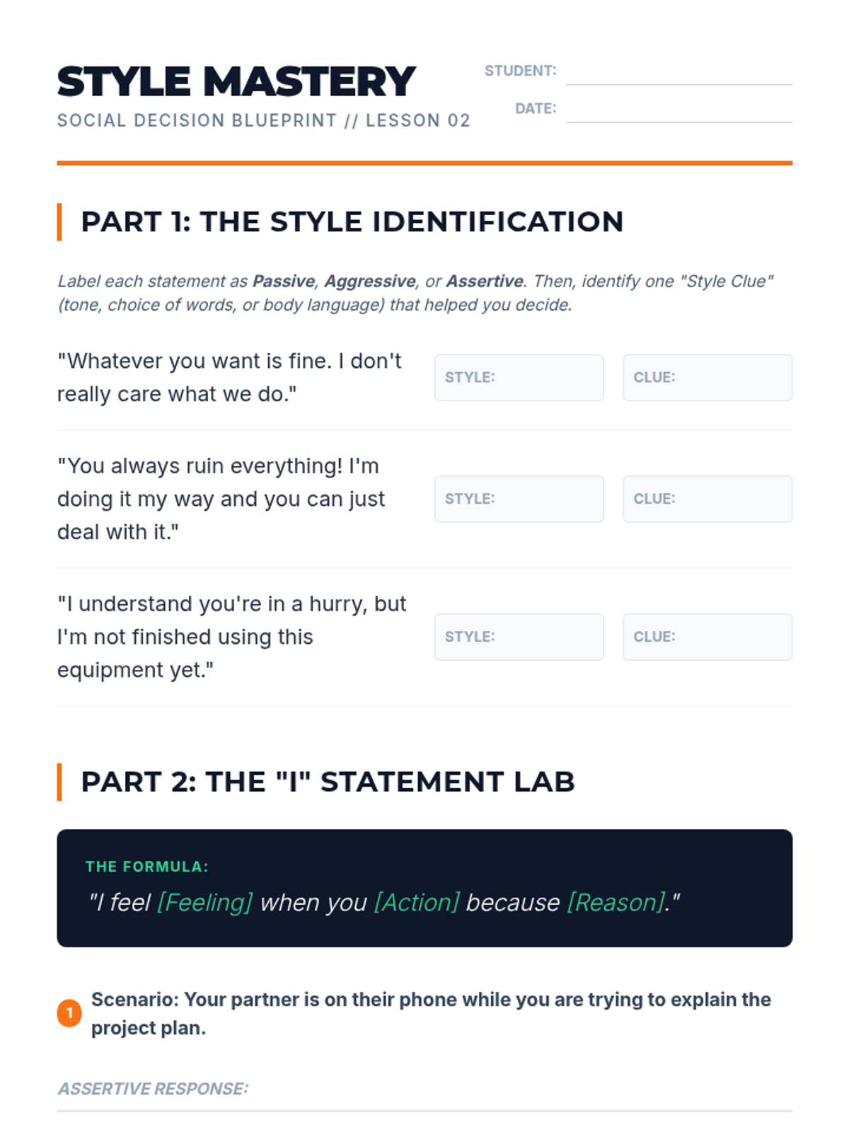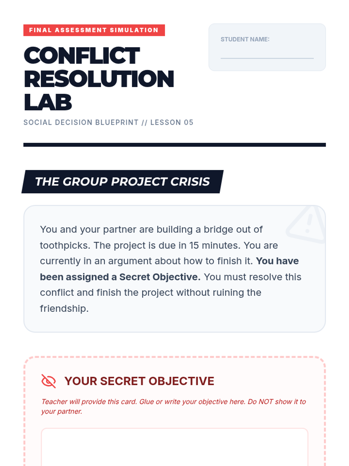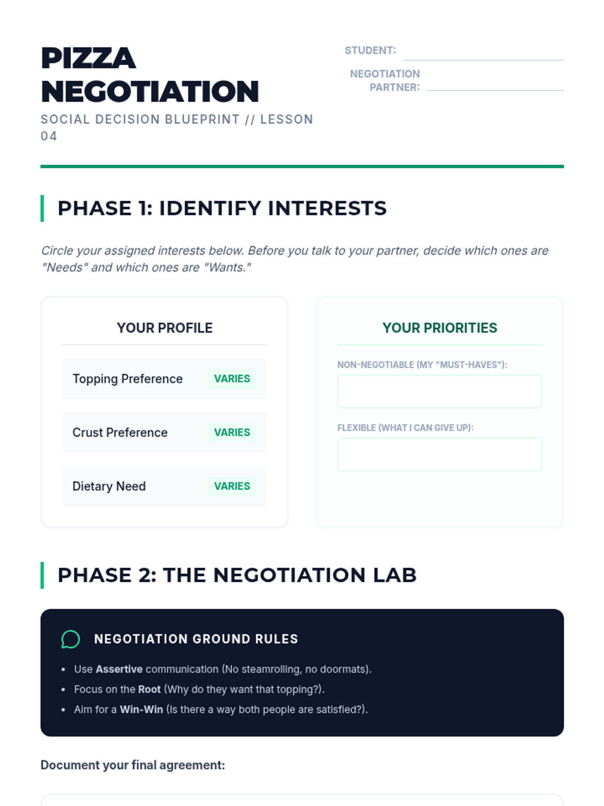 An 8th-grade social communication sequence focusing on assertive communication, conflict analysis, and negotiation. Students transition from reactive behavior to strategic social decision-making during interpersonal challenges.