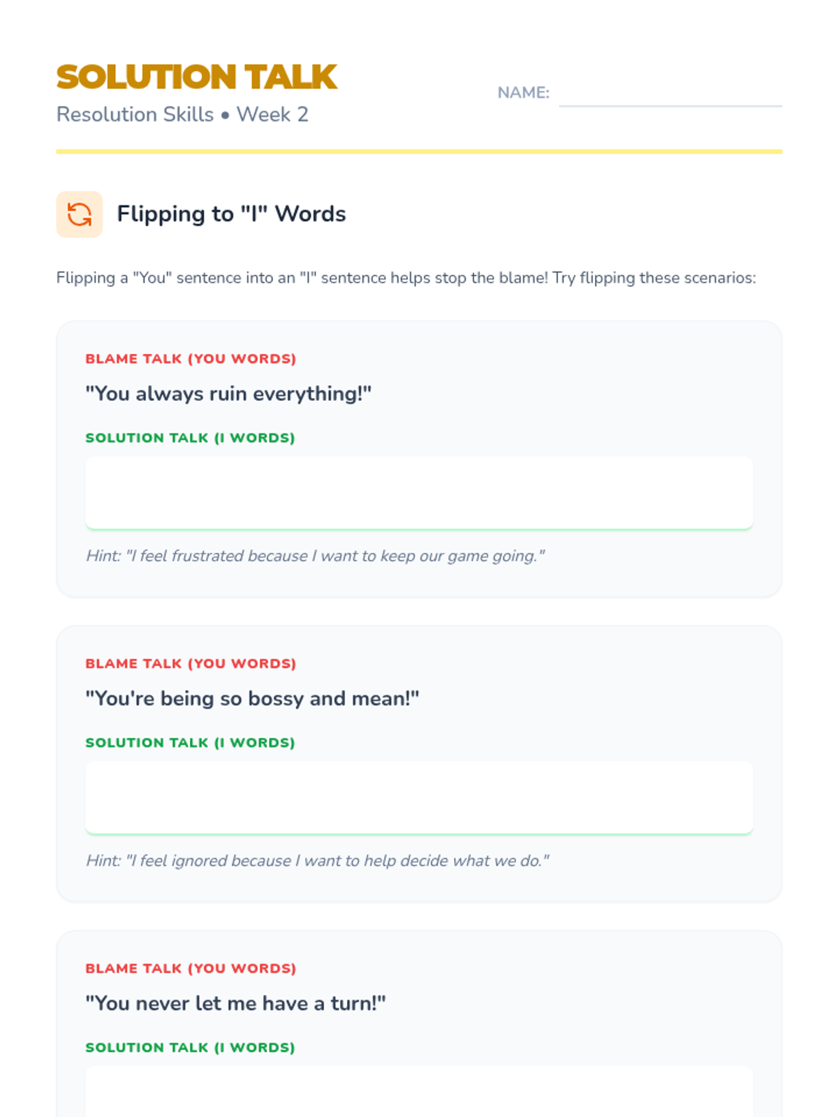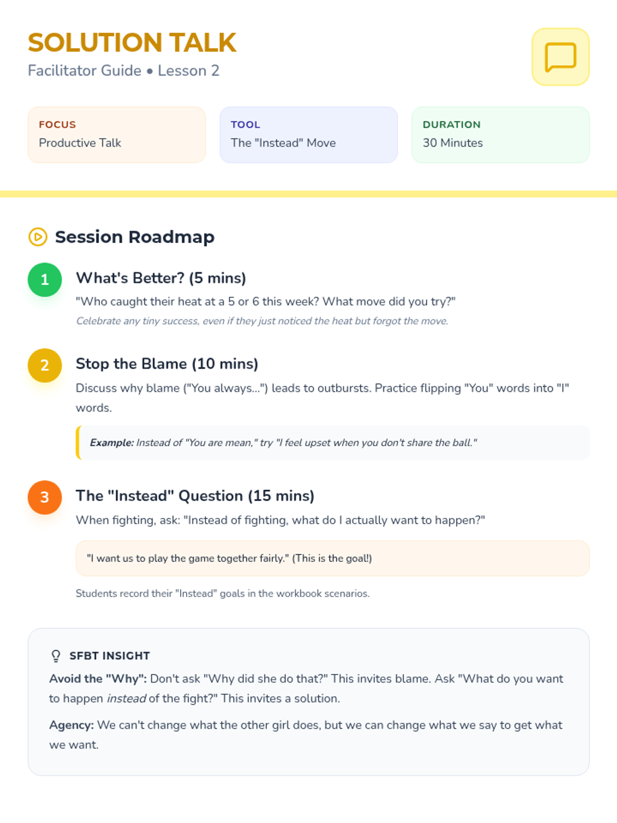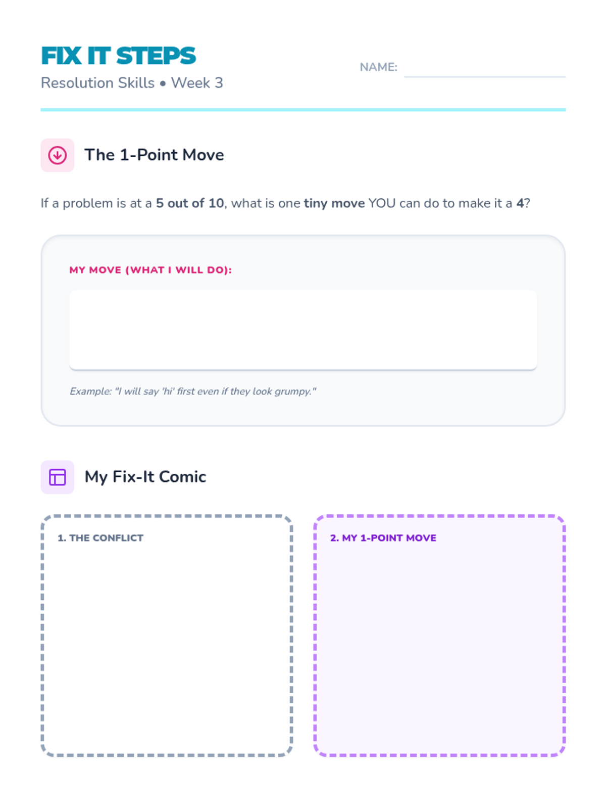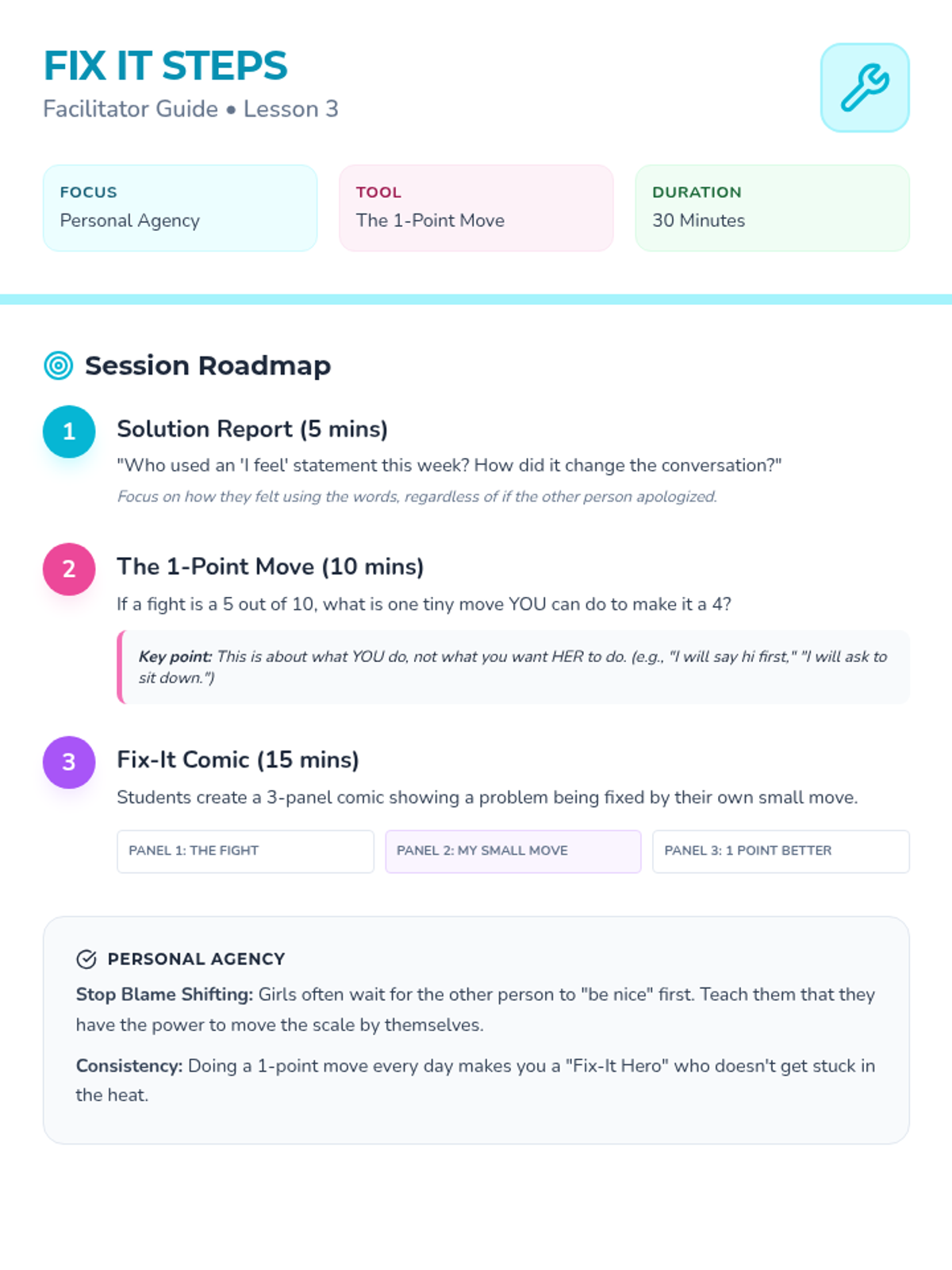 A 3-week program for 4th-grade girls focused on productive conflict resolution and self-regulation. Students learn to manage outbursts through 'Calm Body Moves', address conflict without blame using 'Solution Talk', and take personal agency with 'Fix-it Steps'.