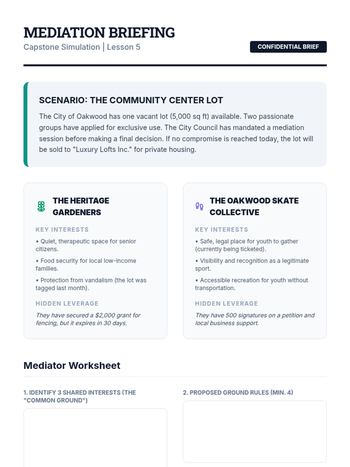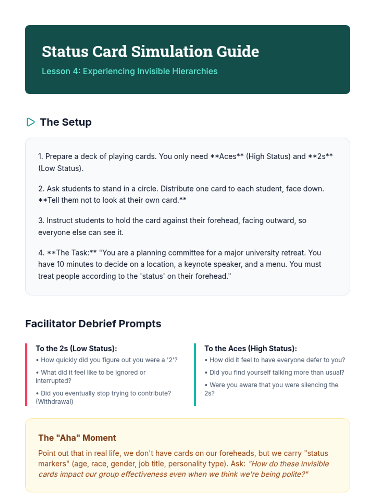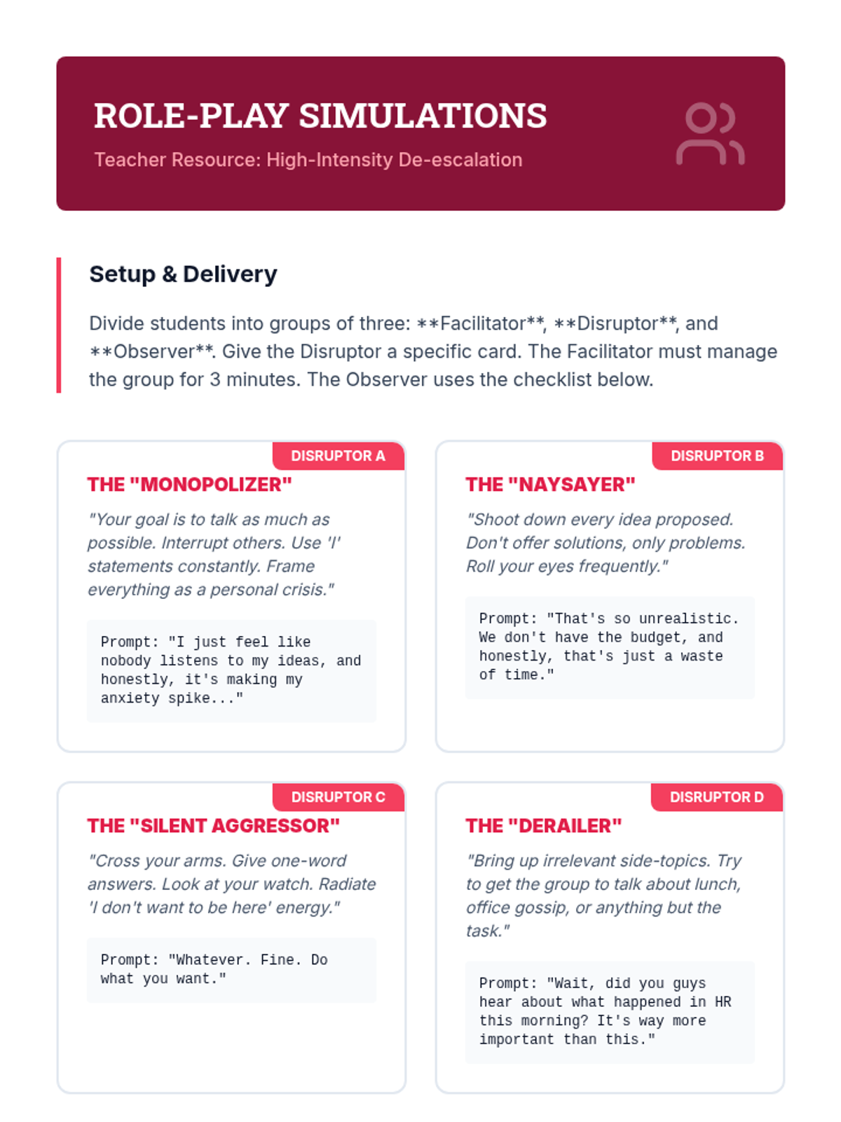 A comprehensive undergraduate sequence on group conflict resolution, exploring the theoretical underpinnings of group development, de-escalation skills, negotiation strategies, and power dynamics through immersive simulations.