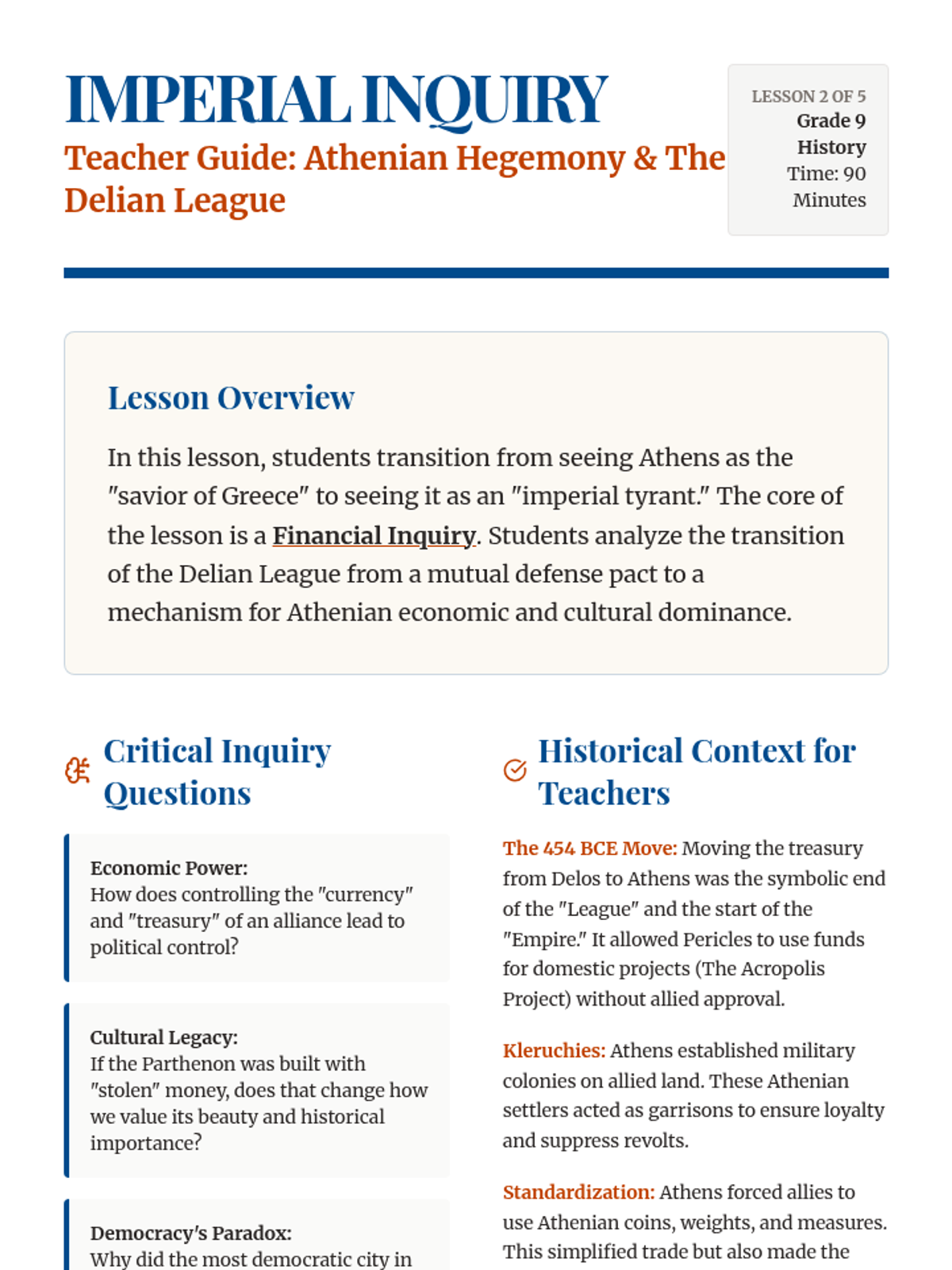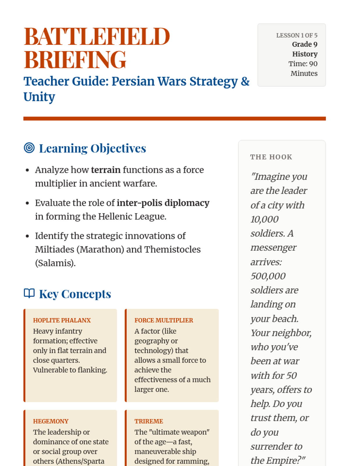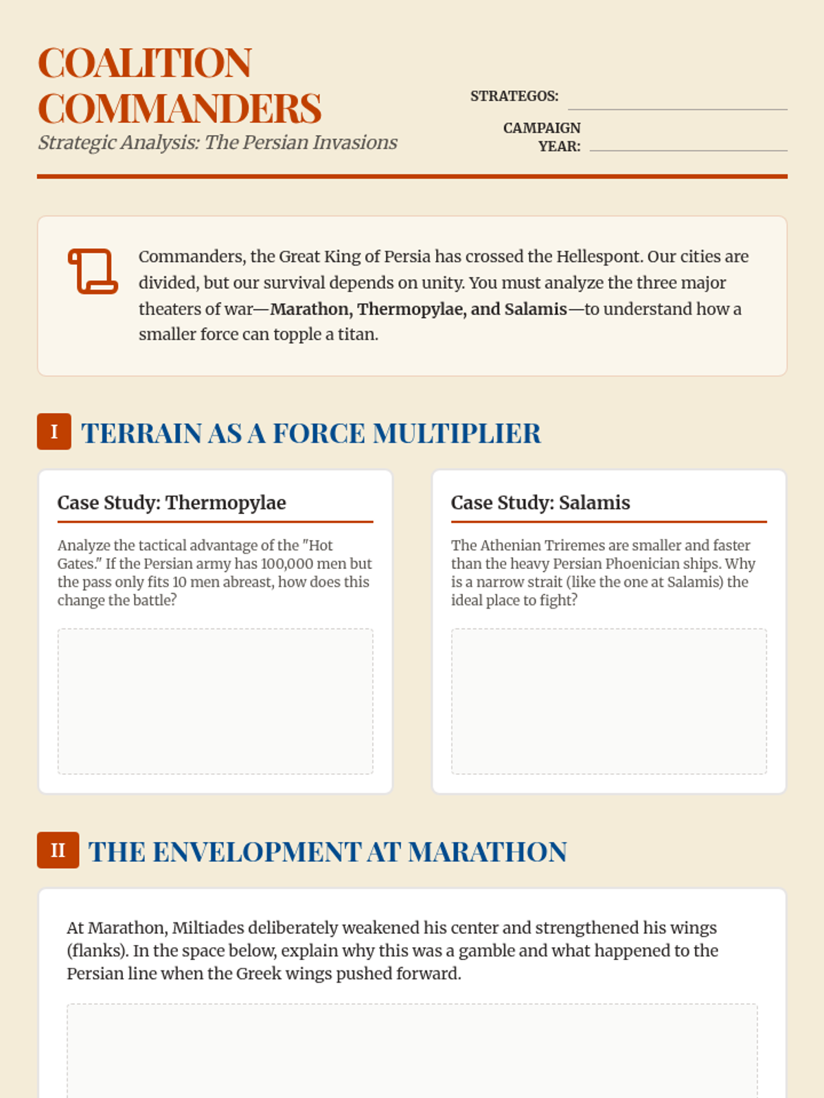 This sequence explores the pivotal military and political shifts in Classical Greece, focusing on the Persian Wars and the subsequent Peloponnesian War. Students analyze how external threats forged unity and how internal power struggles, Athenian imperialism, and strategic failures led to the decline of the Greek city-states and the rise of Macedonia.