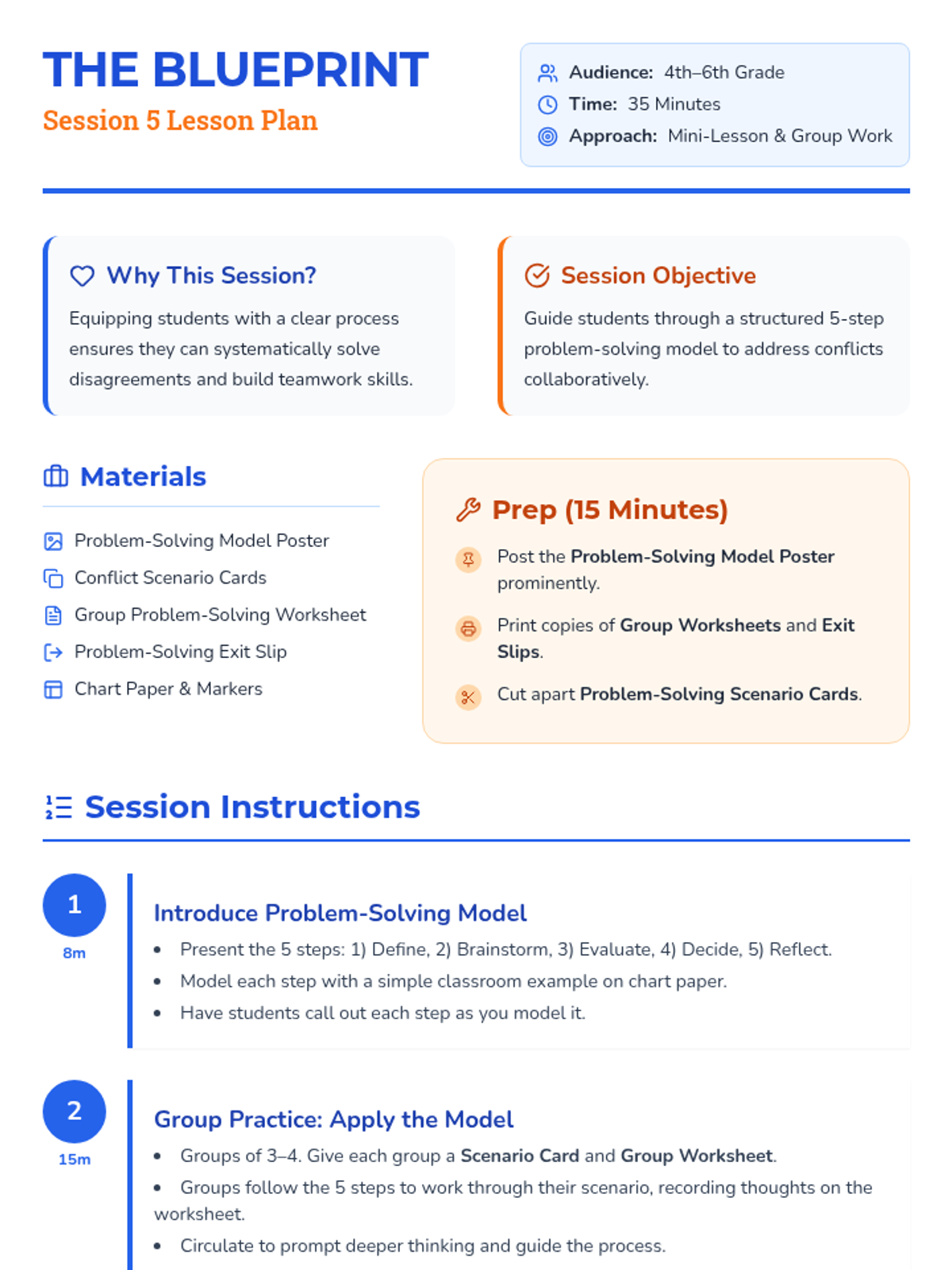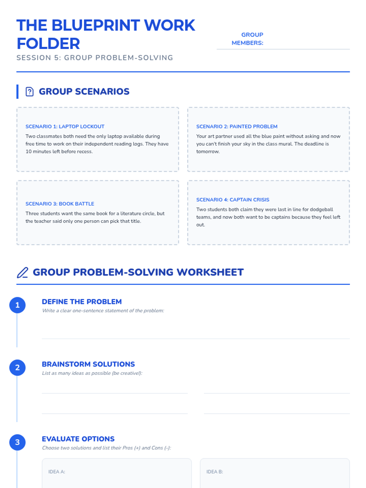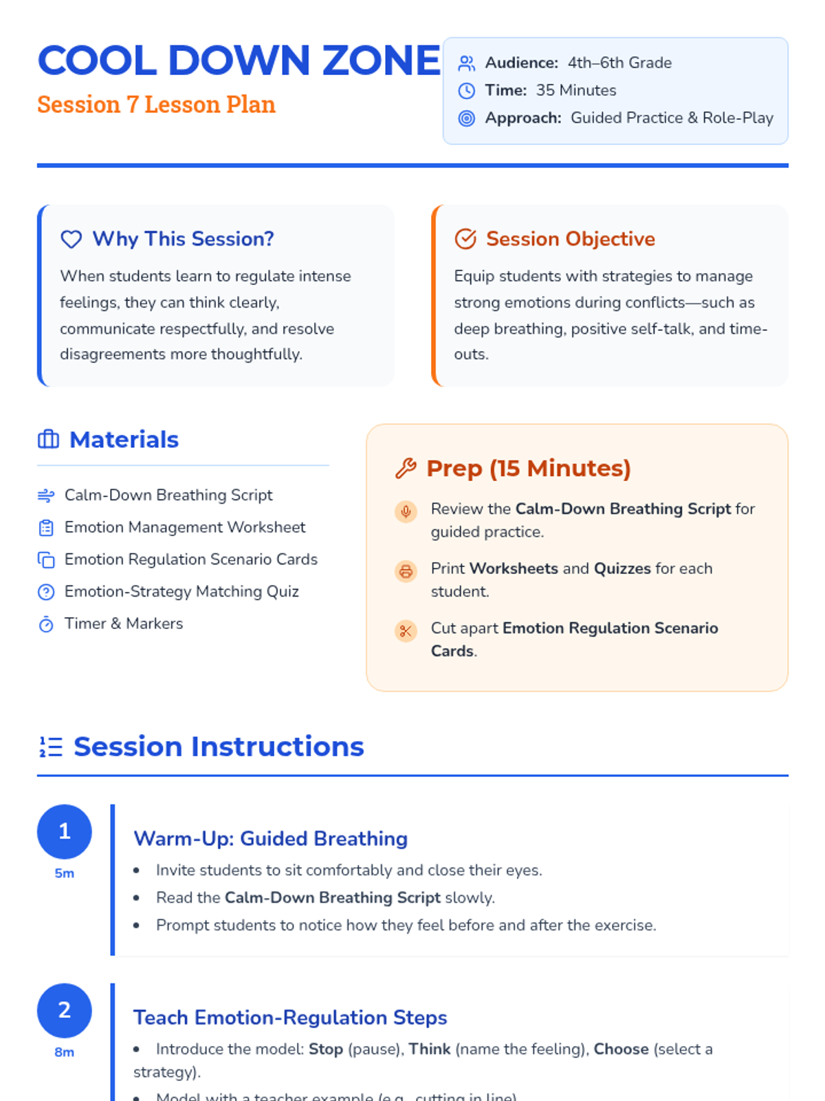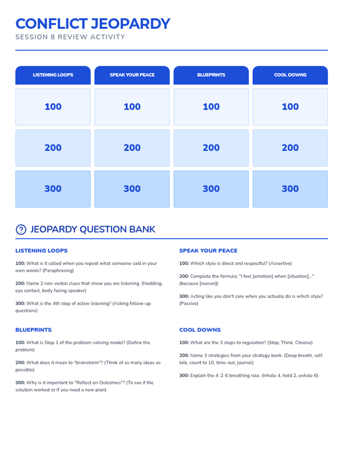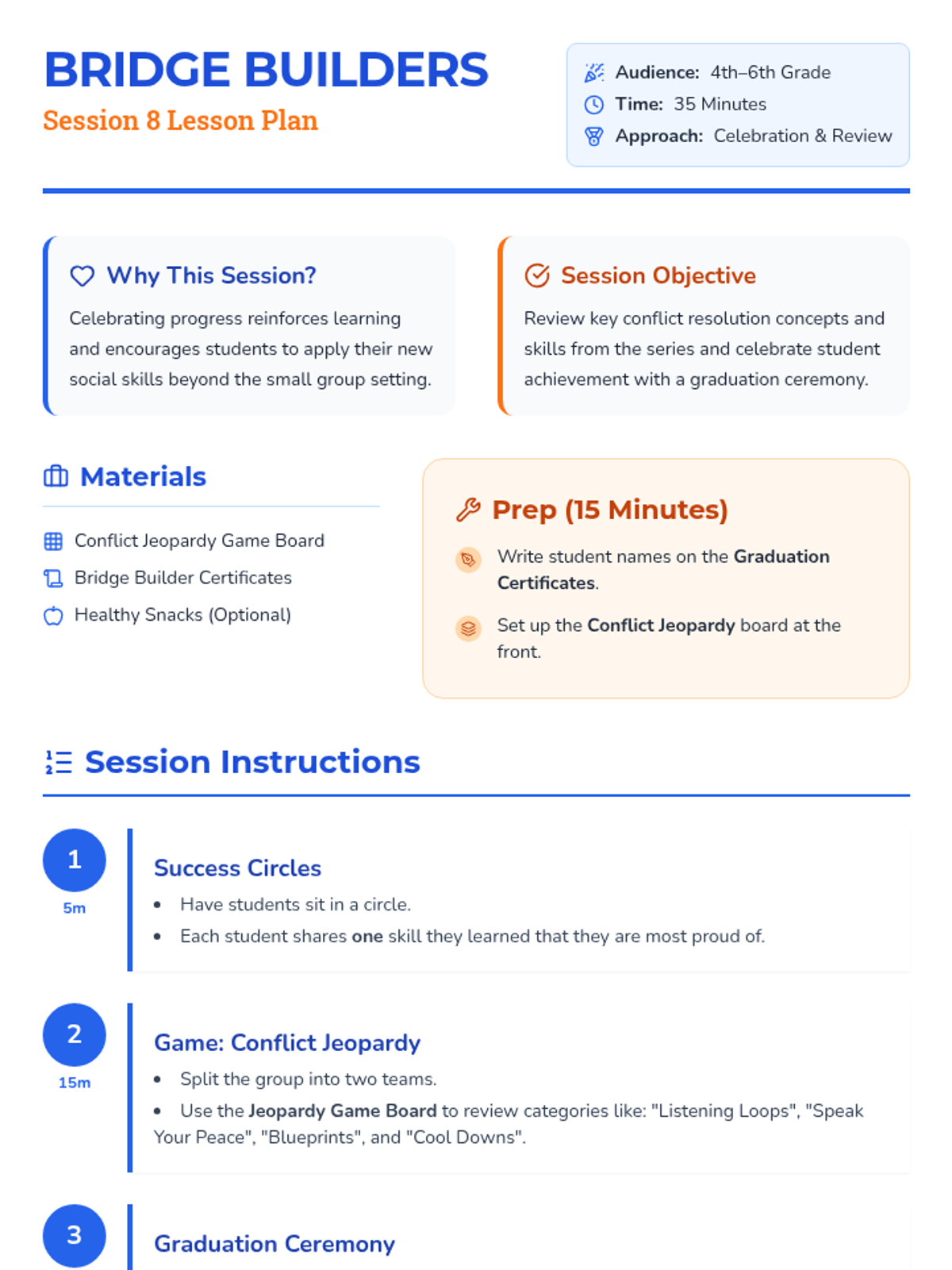 An 8-session conflict resolution series designed for 4th–6th graders to develop essential social skills in small-group settings. This sequence empowers students to navigate disagreements positively through interactive activities, games, and structured problem-solving.