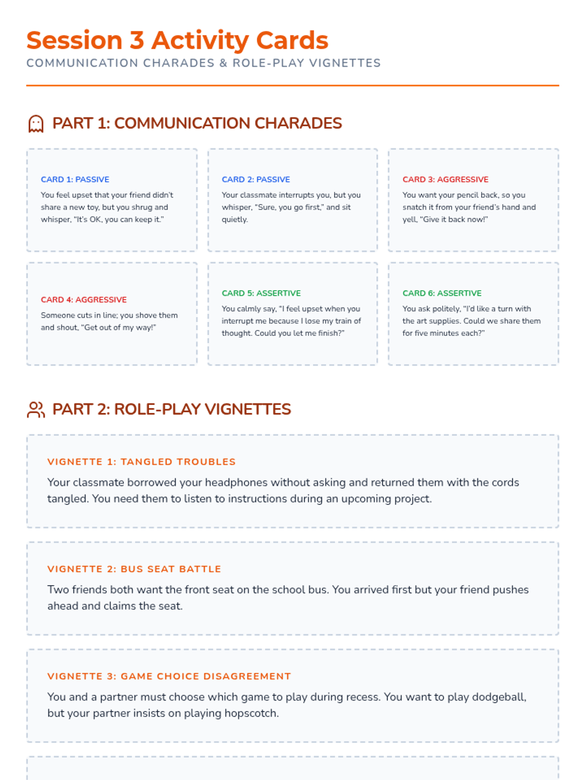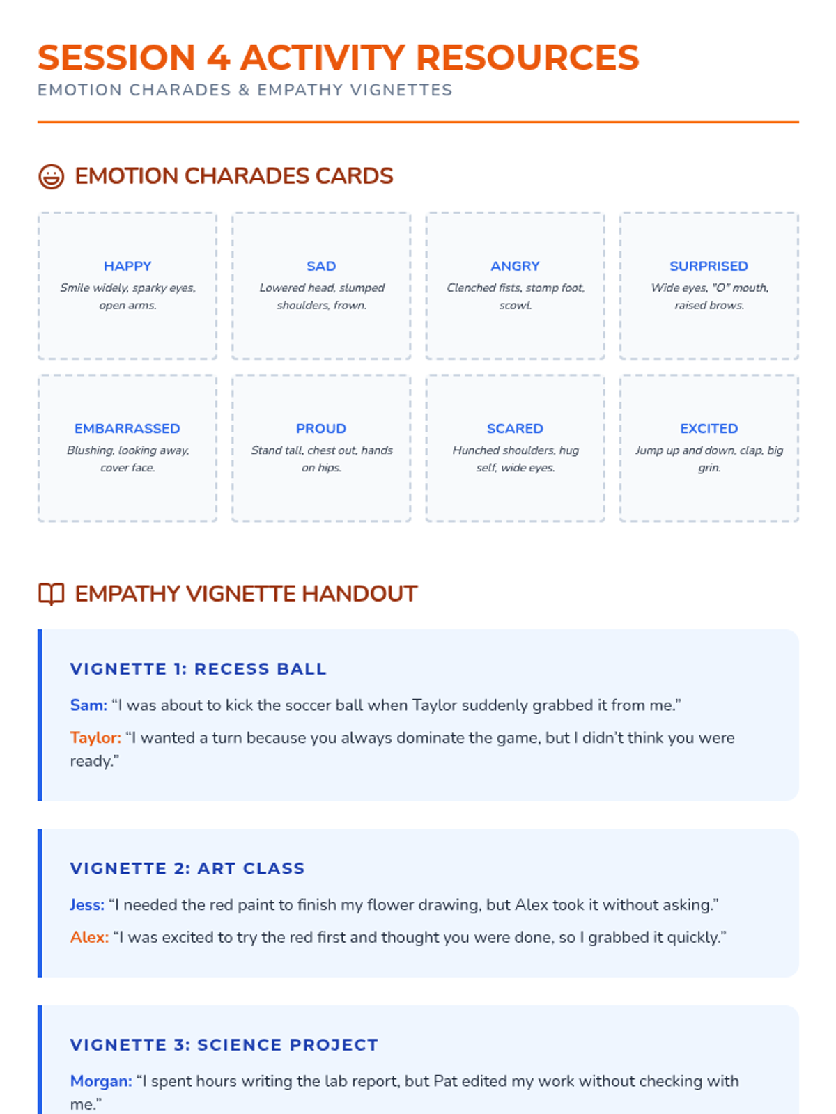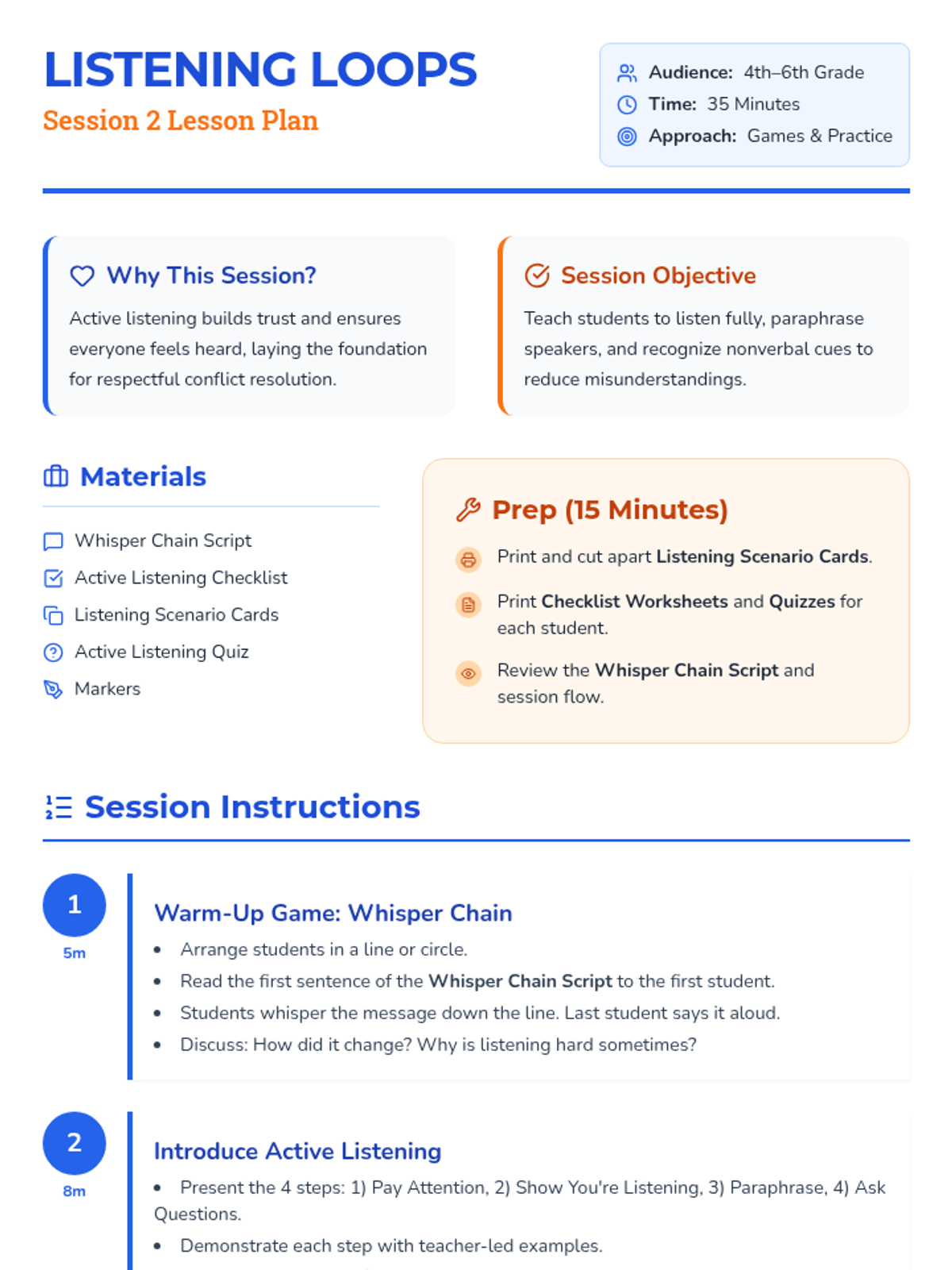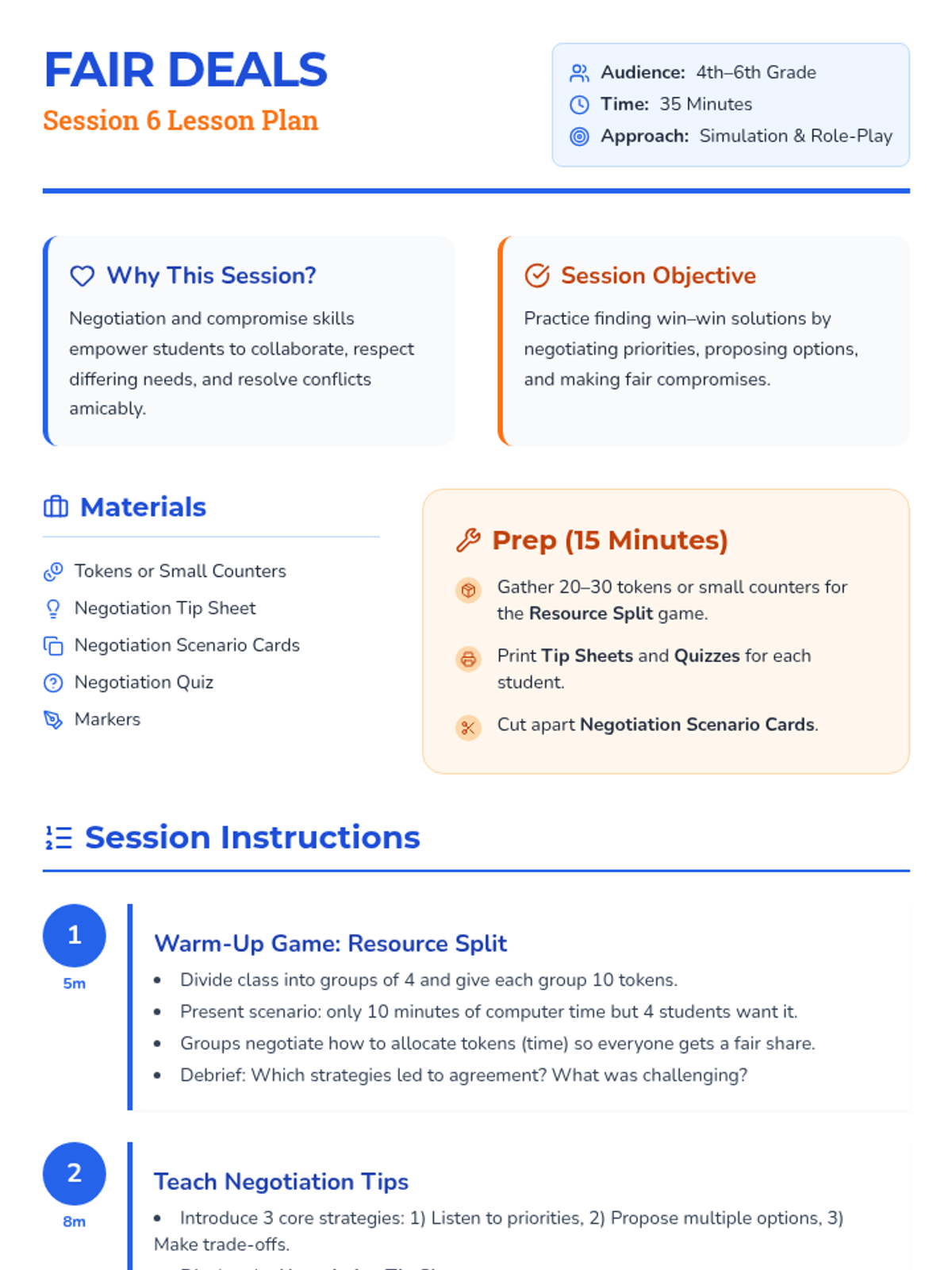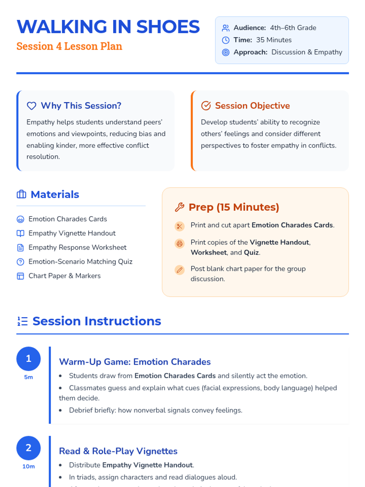 An 8-session conflict resolution series designed for 4th–6th graders to develop essential social skills in small-group settings. This sequence empowers students to navigate disagreements positively through interactive activities, games, and structured problem-solving.