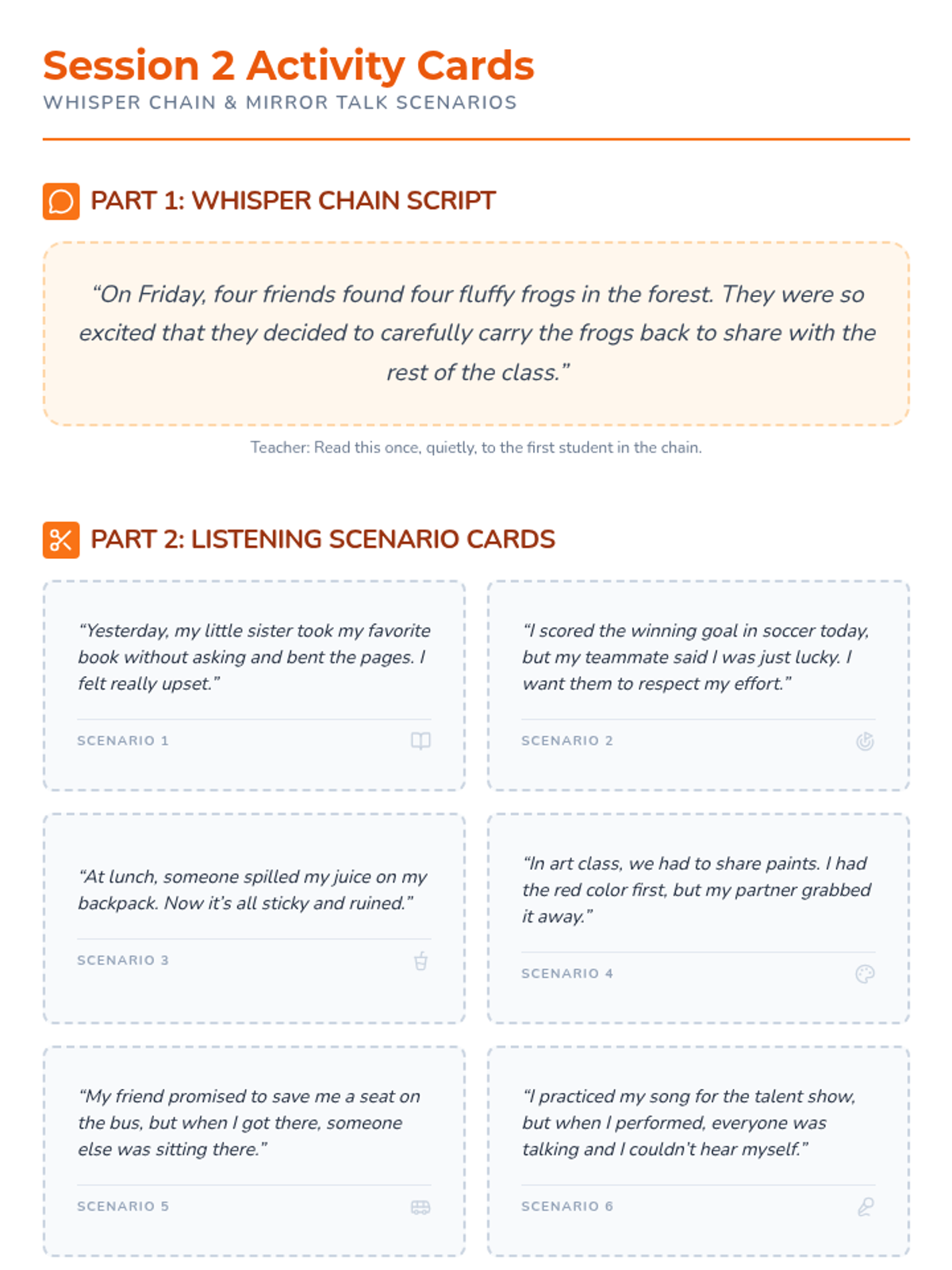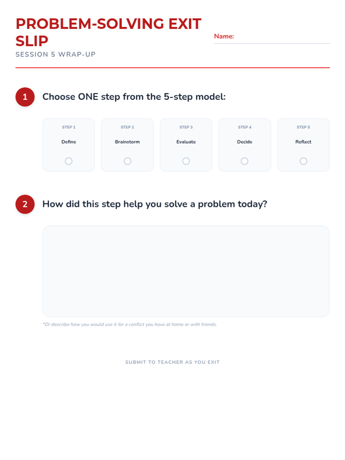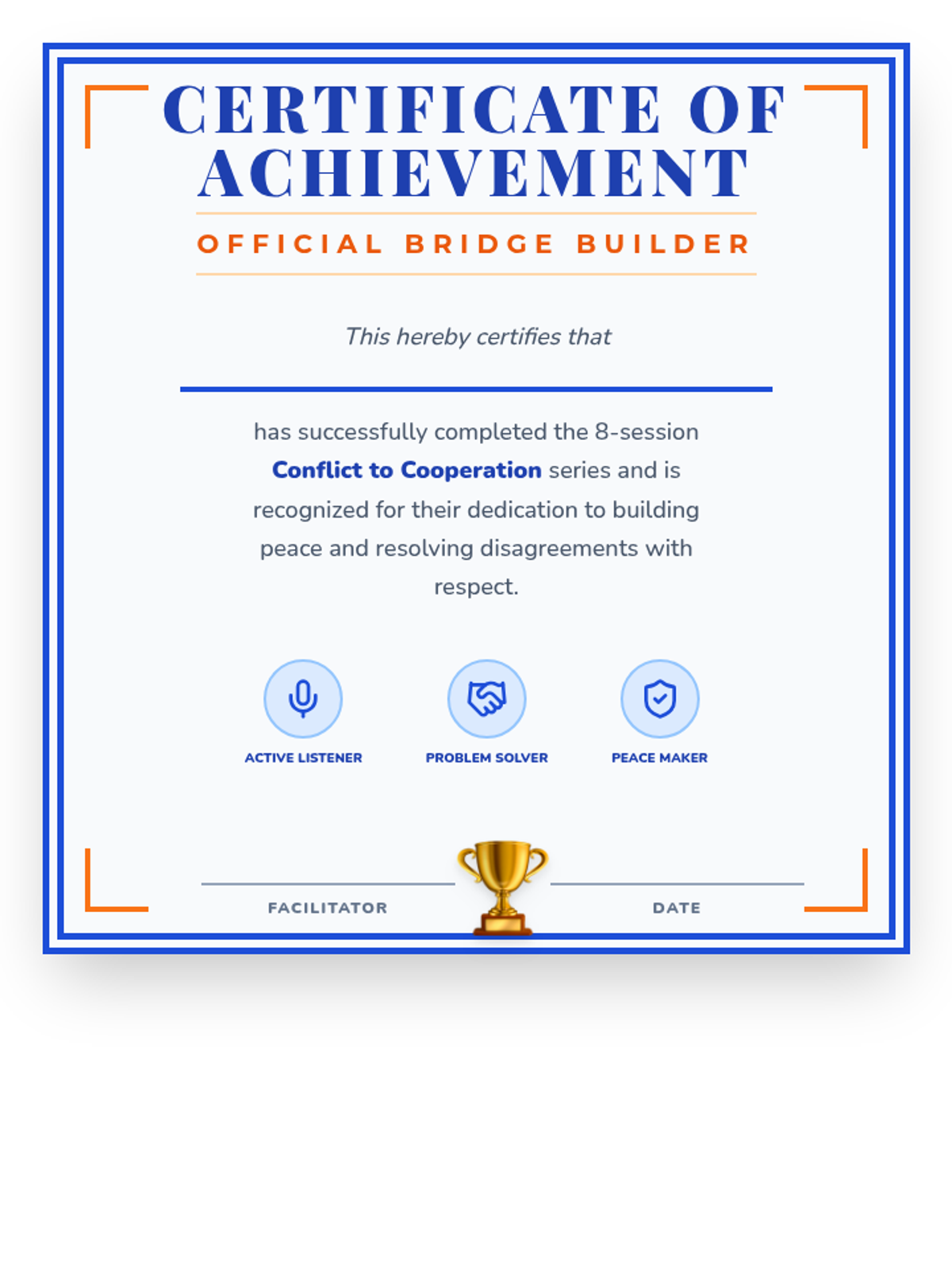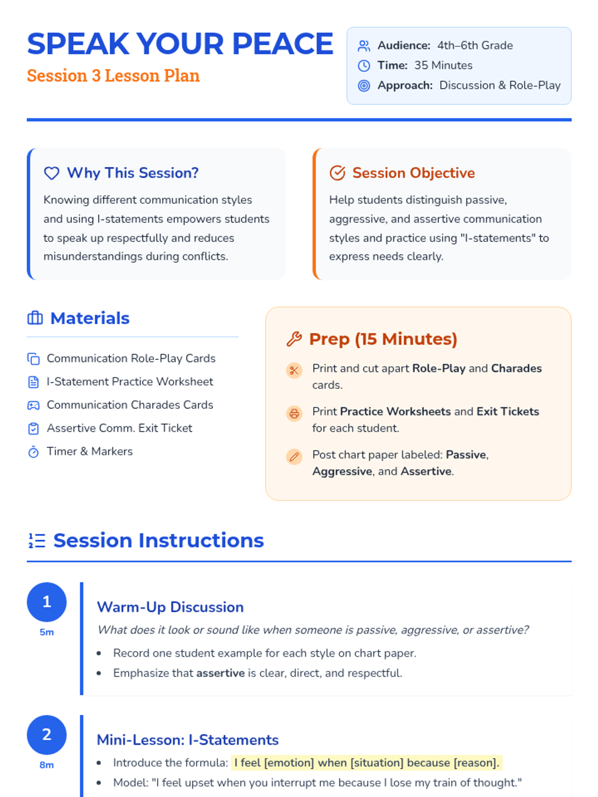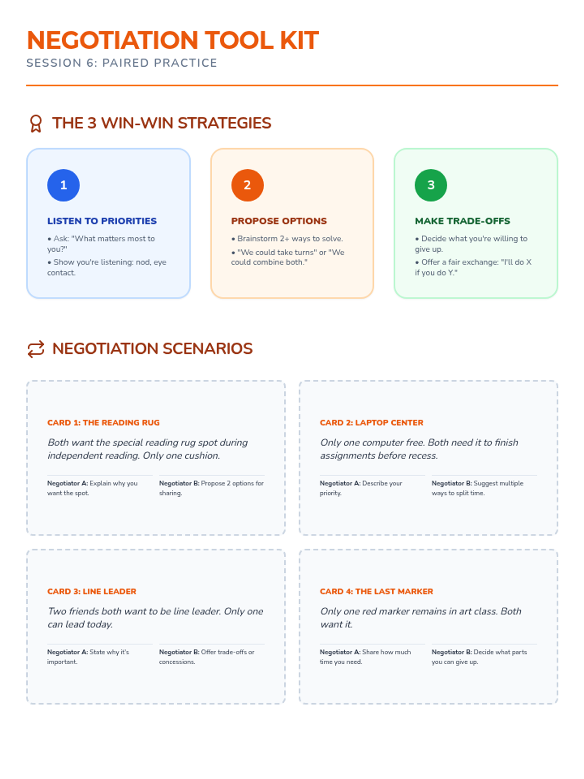 An 8-session conflict resolution series designed for 4th–6th graders to develop essential social skills in small-group settings. This sequence empowers students to navigate disagreements positively through interactive activities, games, and structured problem-solving.