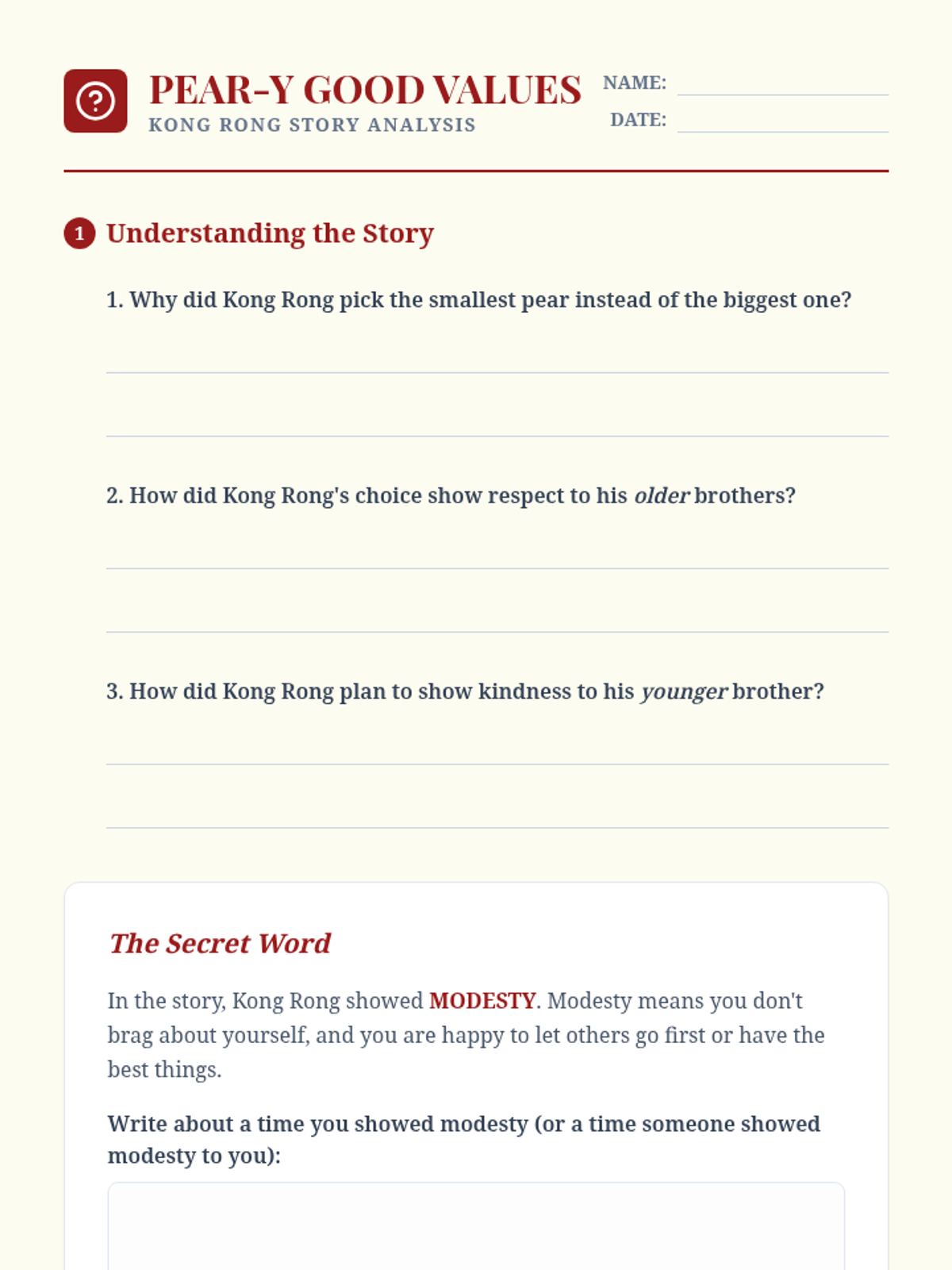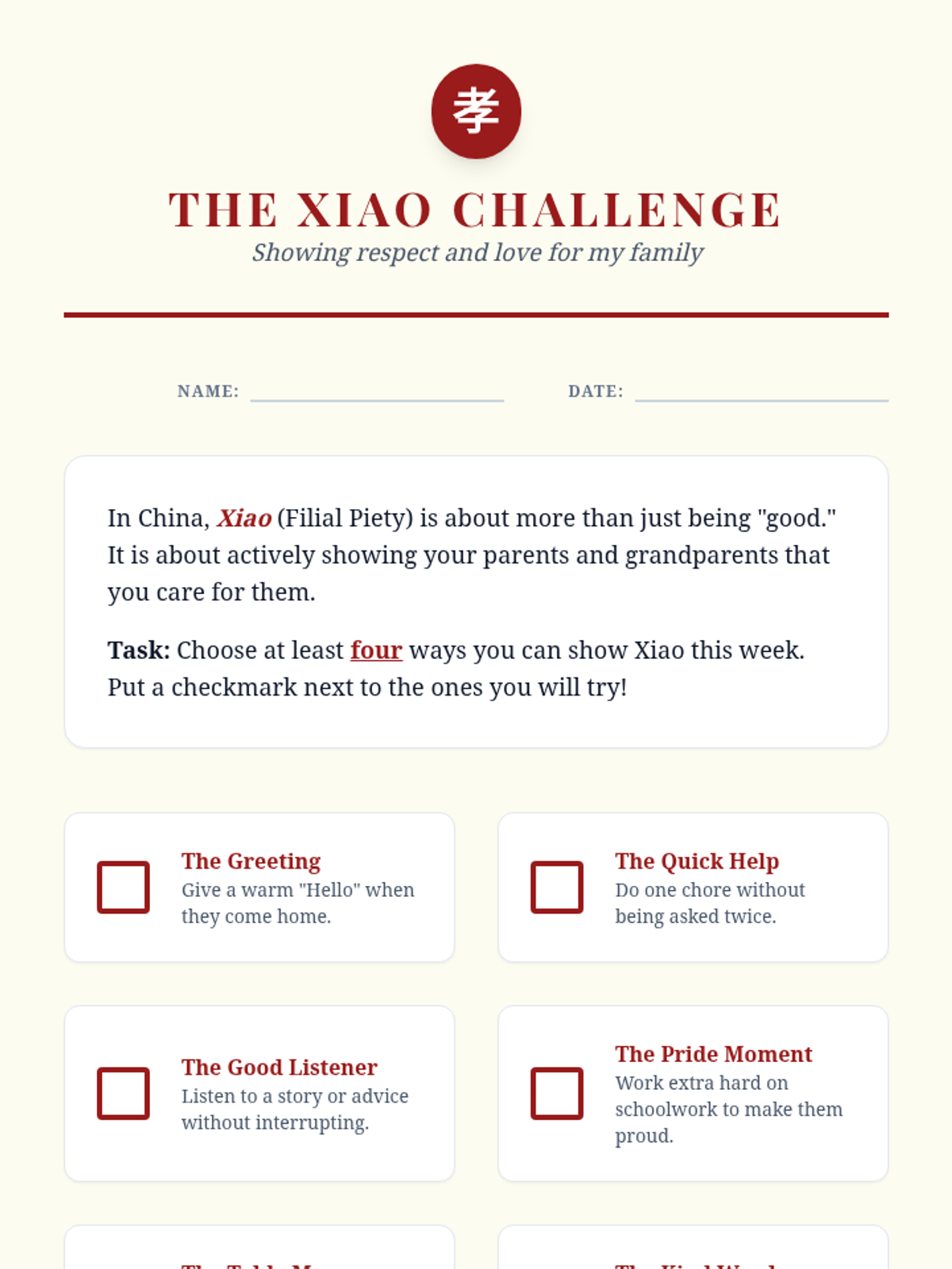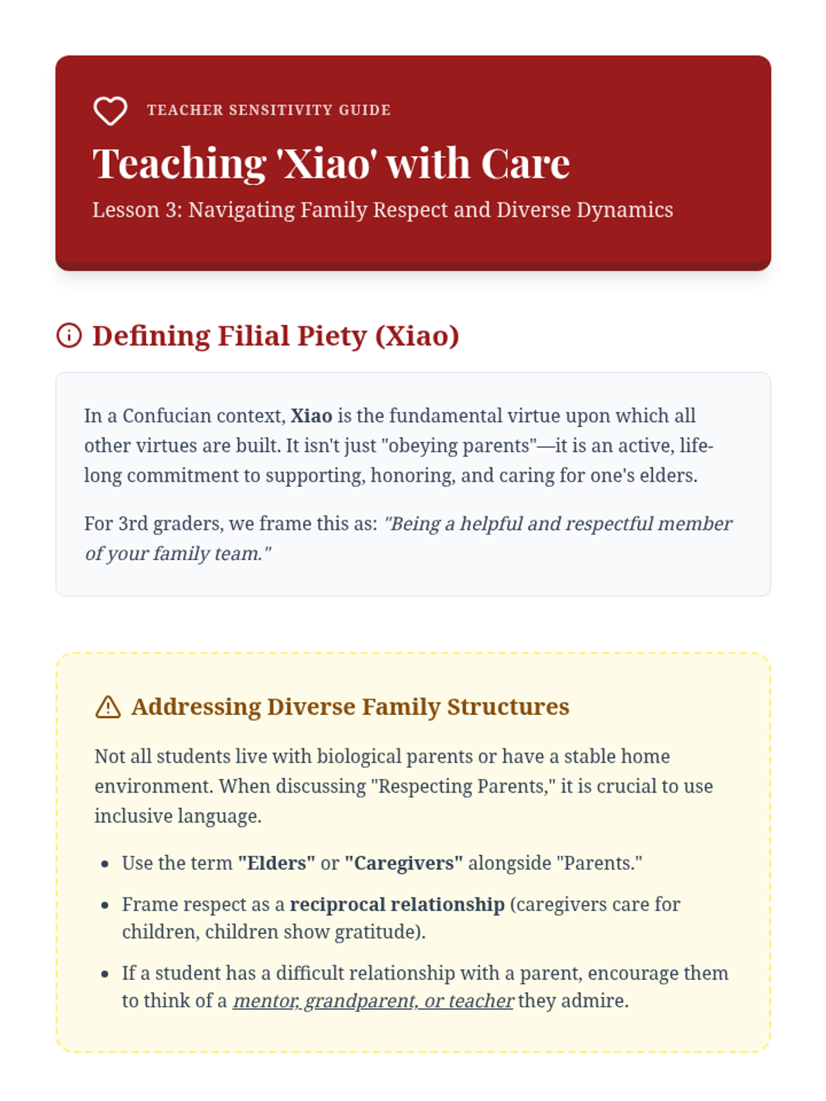 A 5-lesson sequence exploring traditional Chinese values through the lens of Confucian philosophy, family hierarchy, and the concept of filial piety for 3rd grade students.