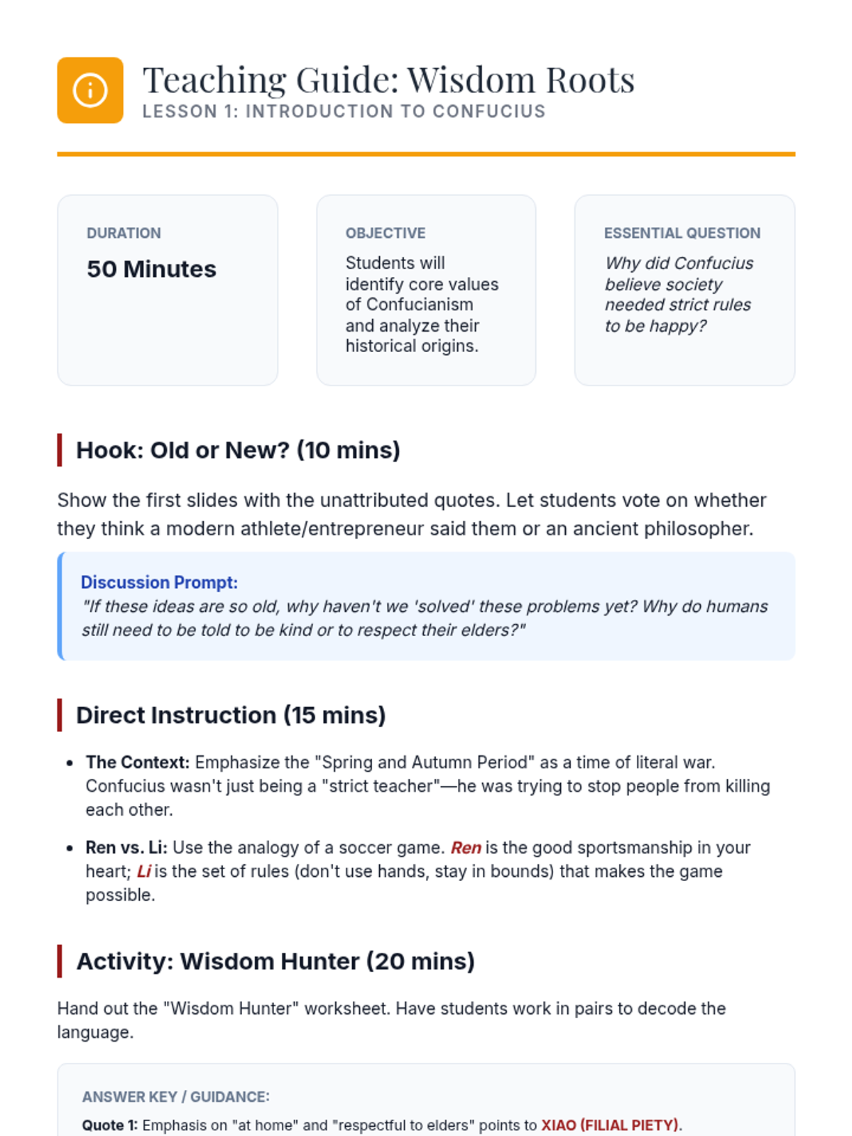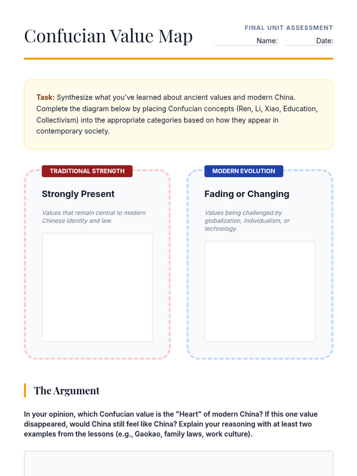 This sequence explores how ancient Confucian principles like Filial Piety and collective harmony continue to influence modern Chinese society, specifically within families and the education system. Students analyze historical texts and contemporary case studies to understand the tension between traditional values and modern individualism.