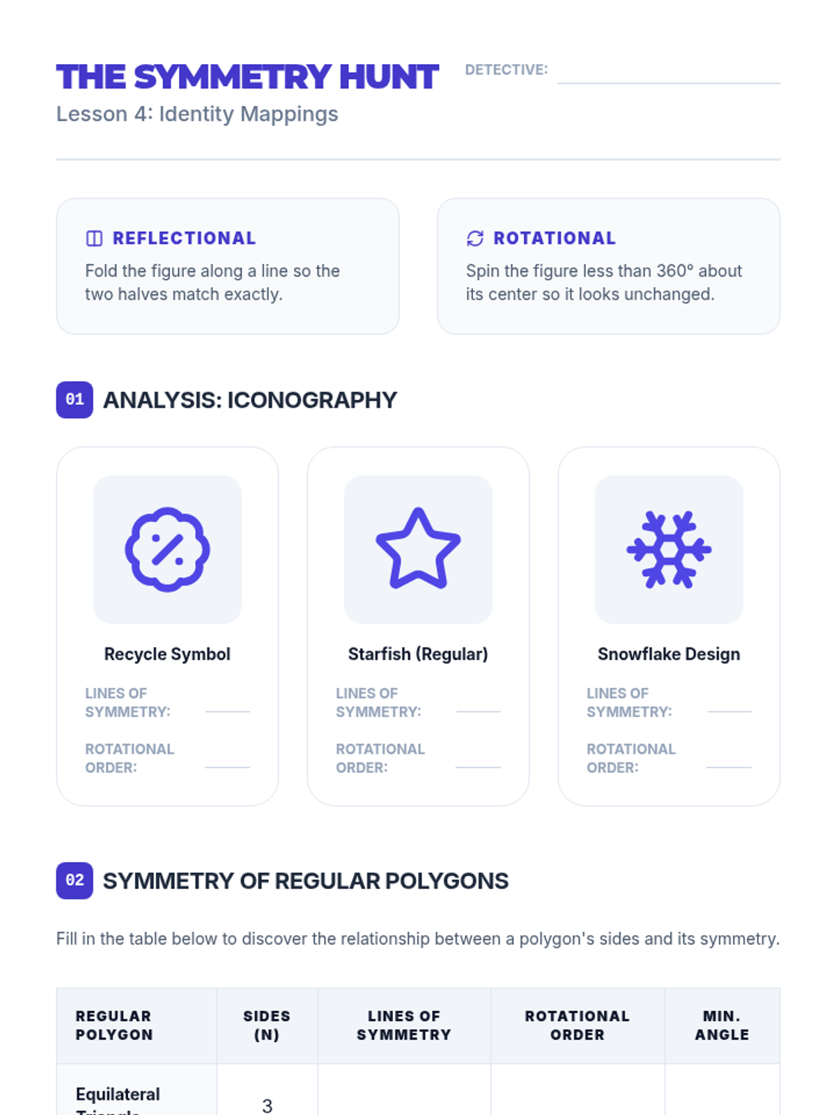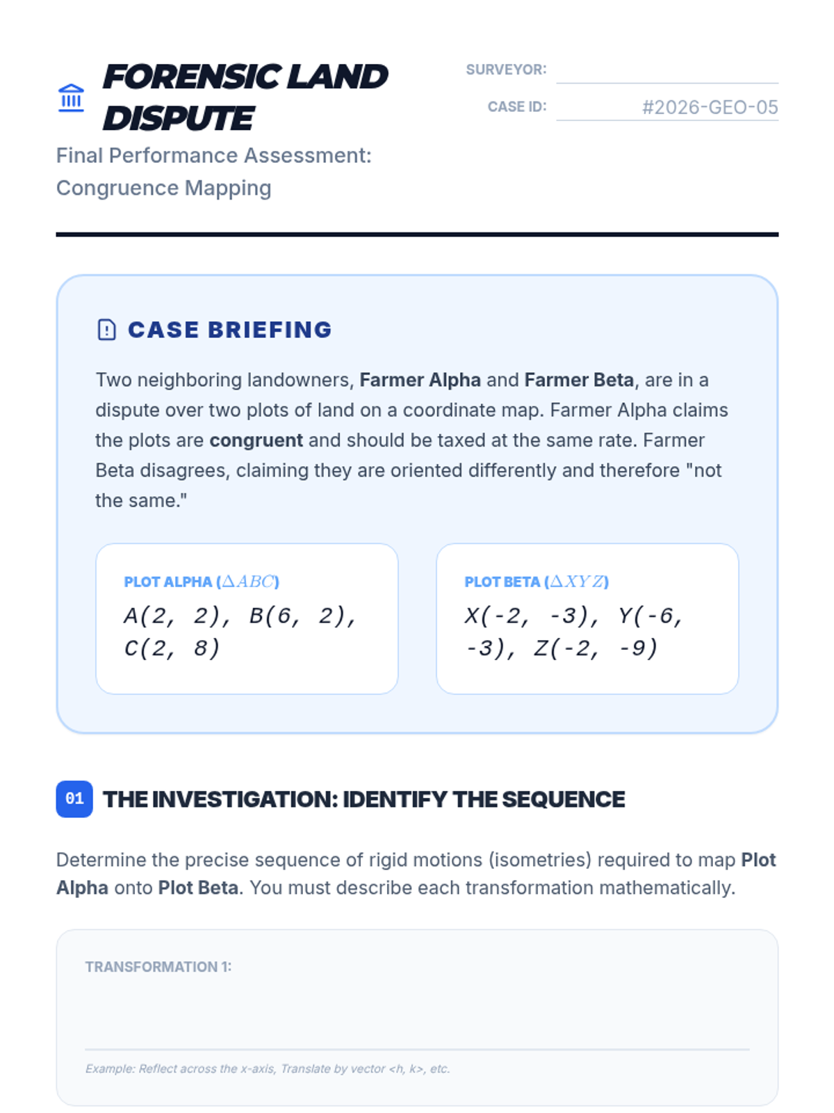 A 10th-grade geometry sequence focusing on rigid transformations (translations, reflections, rotations) and using mapping to define and verify geometric congruence. Students move from visual intuition to formal proofs using coordinate rules and composition of isometries.