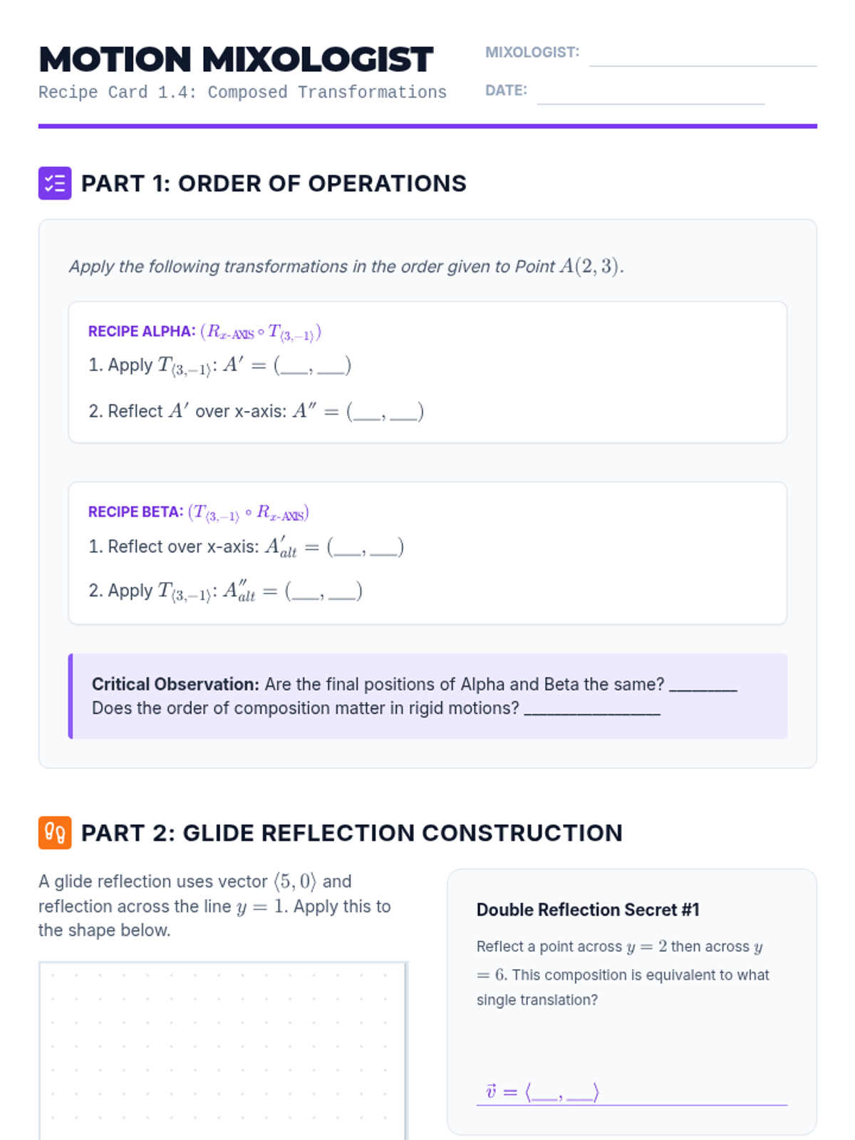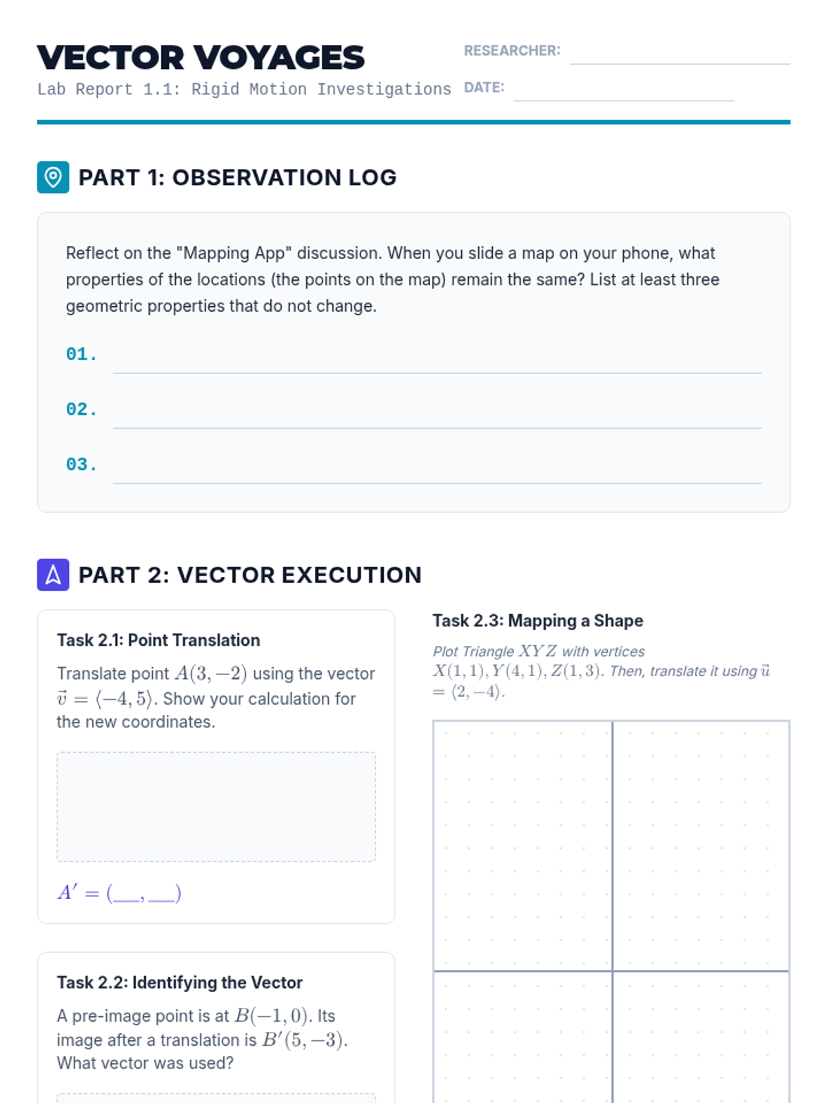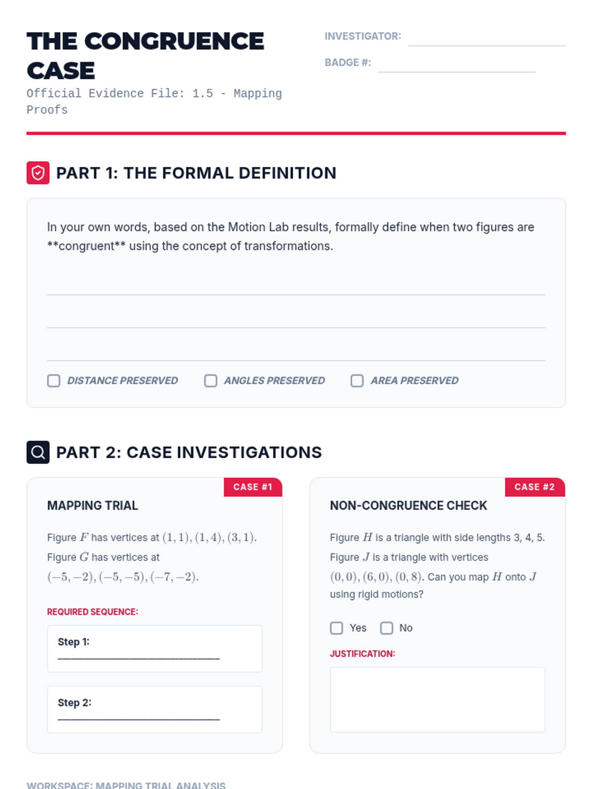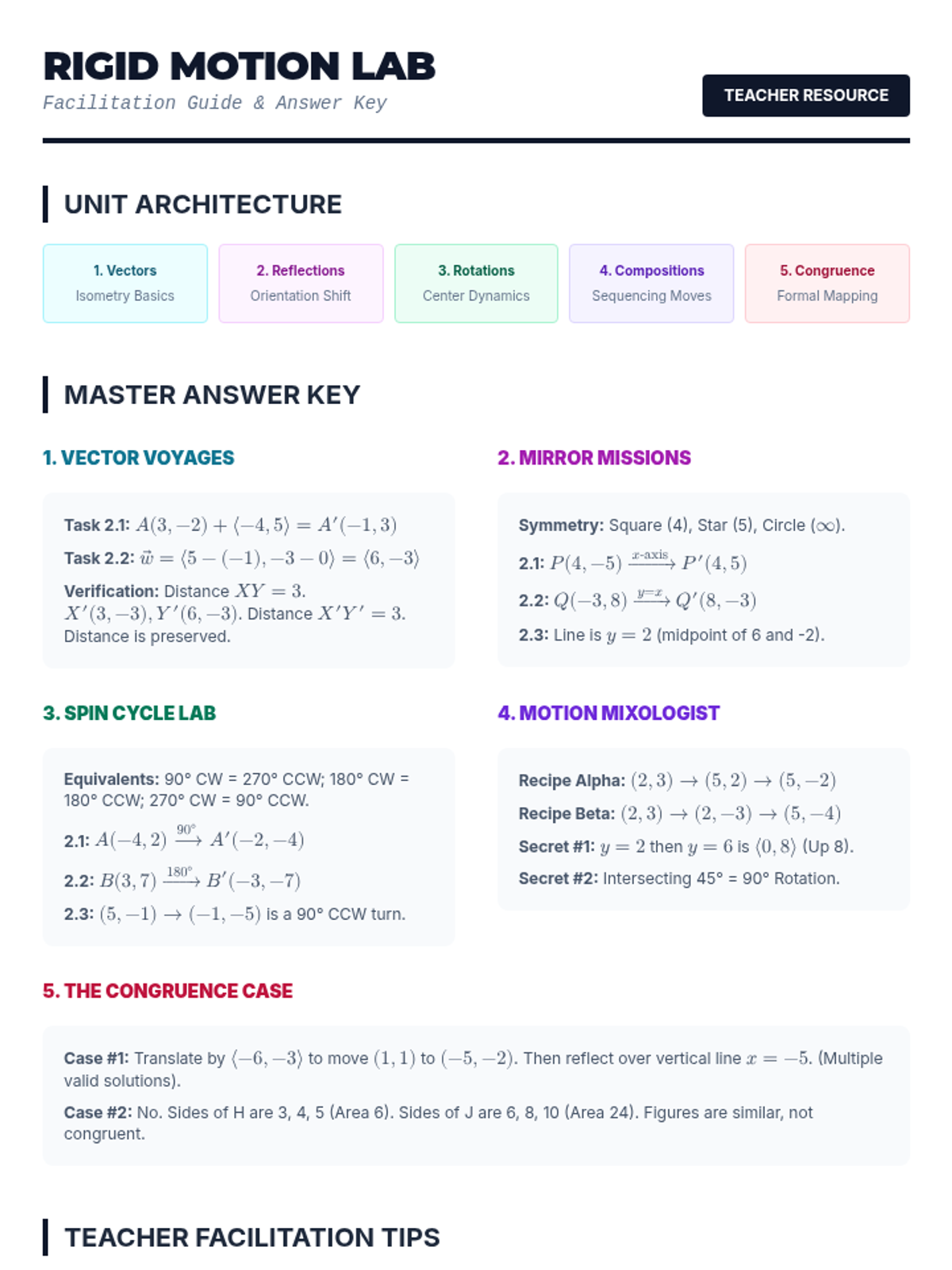 This sequence explores the fundamental principles of congruence through rigid transformations. Students investigate translations, reflections, and rotations to understand how figures move without changing size or shape, culminating in a formal definition of congruence as a mapping between figures.