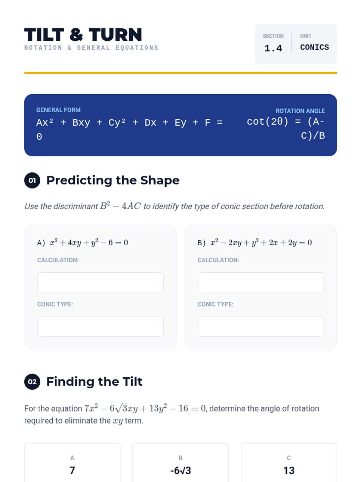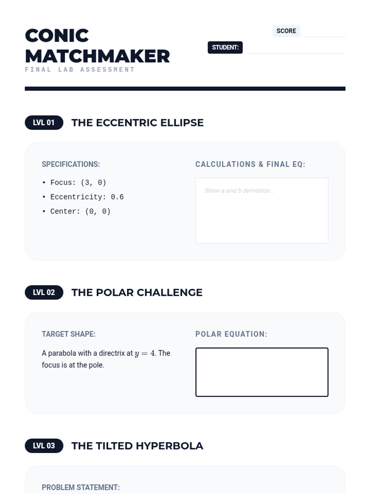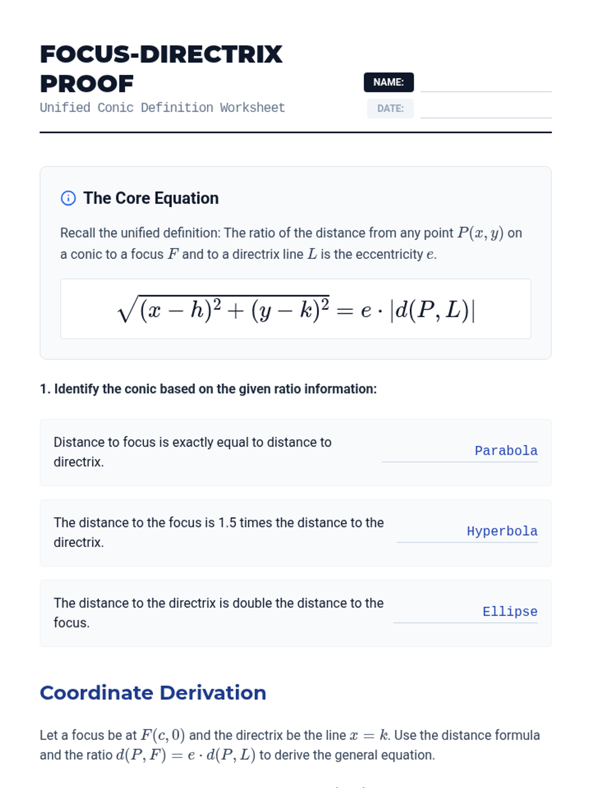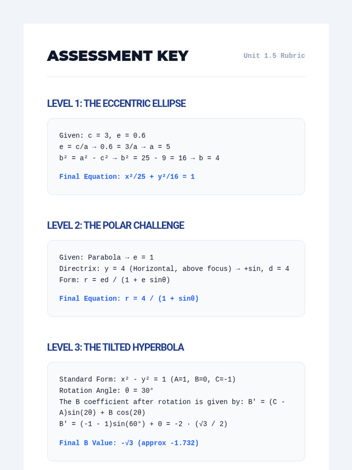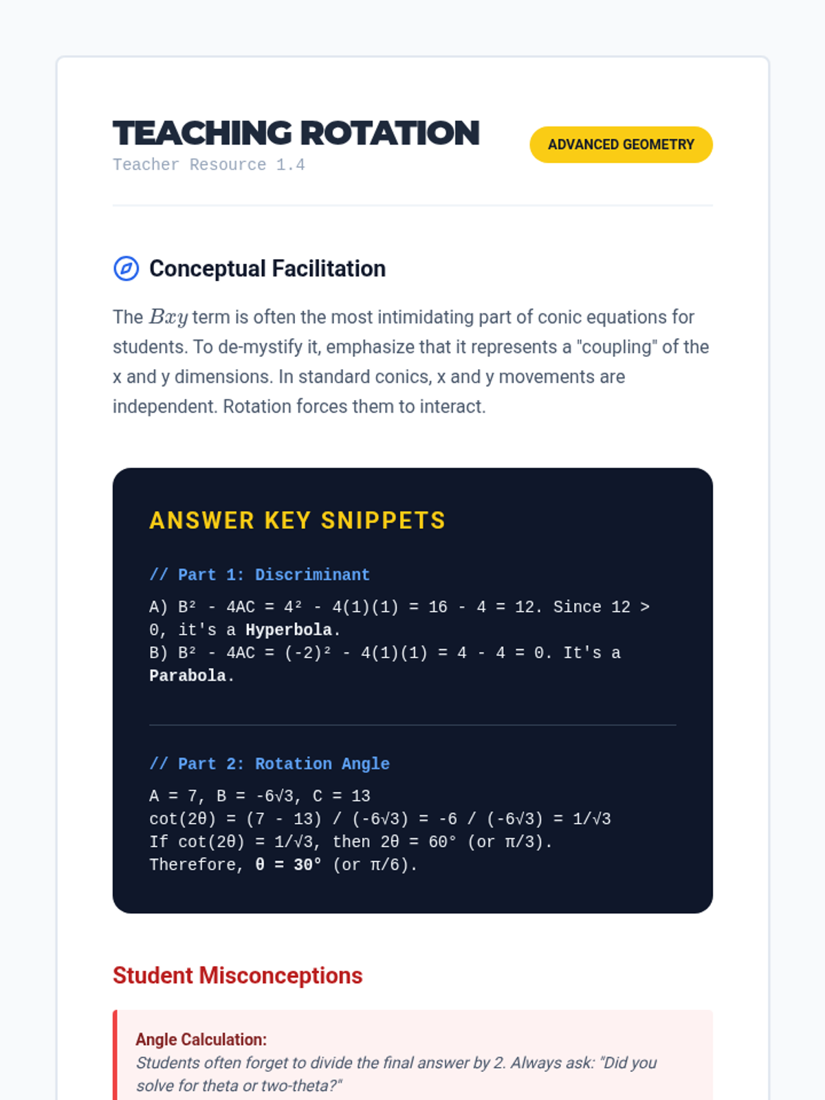 A 12th-grade advanced geometry sequence exploring the unified nature of conic sections through eccentricity, focus-directrix definitions, polar coordinates, and rotation. Students use dynamic software to visualize how algebraic parameters shift geometric reality.