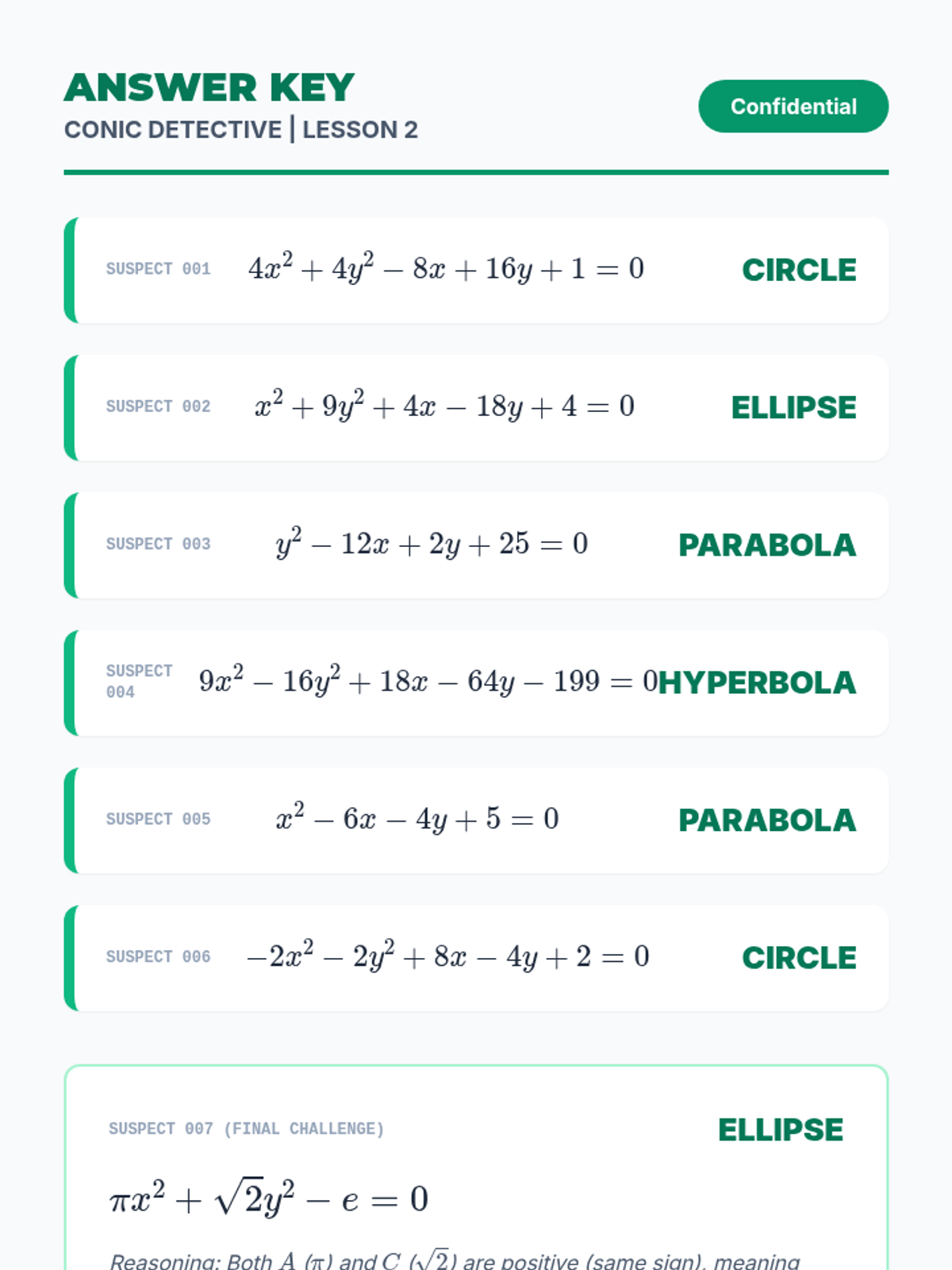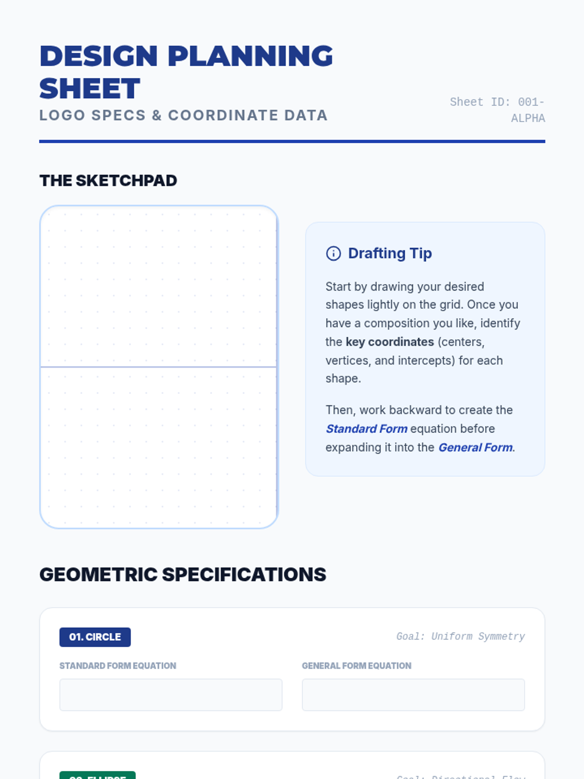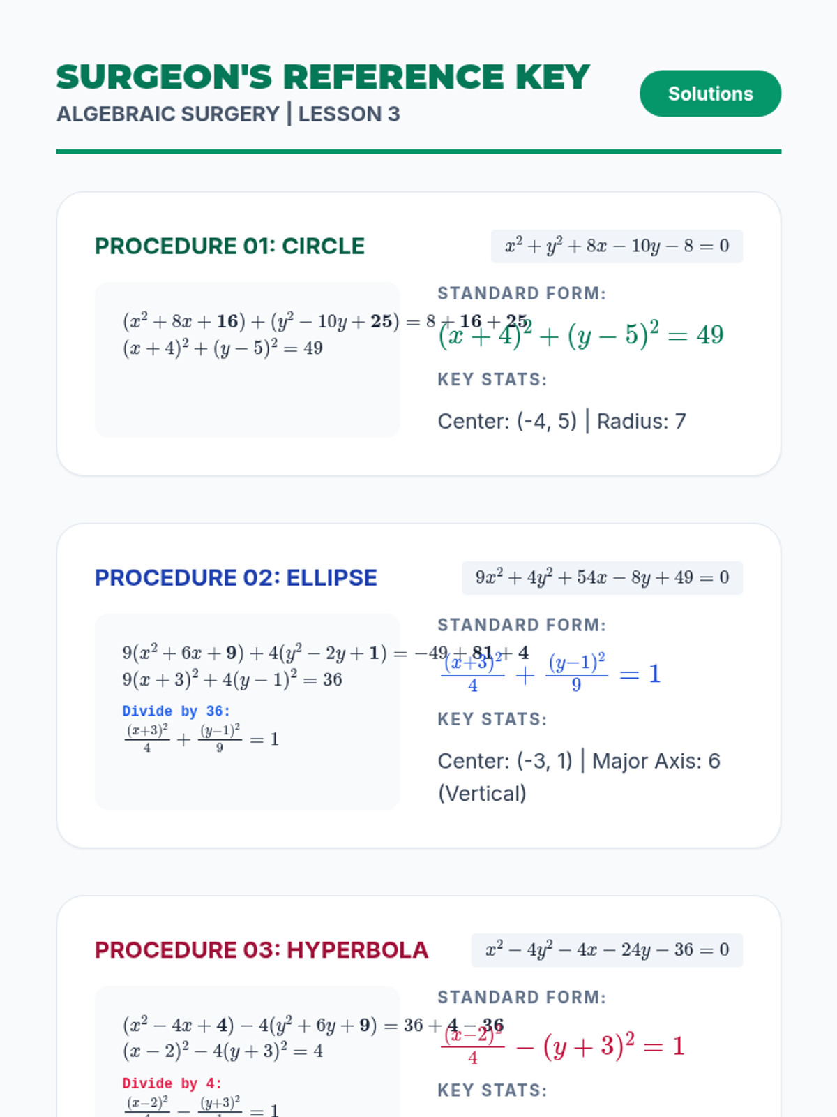 This mastery-based sequence focuses on the synthesis of all conic sections. Students learn to manipulate the General Second-Degree Equation to classify curves and transform them into standard forms.