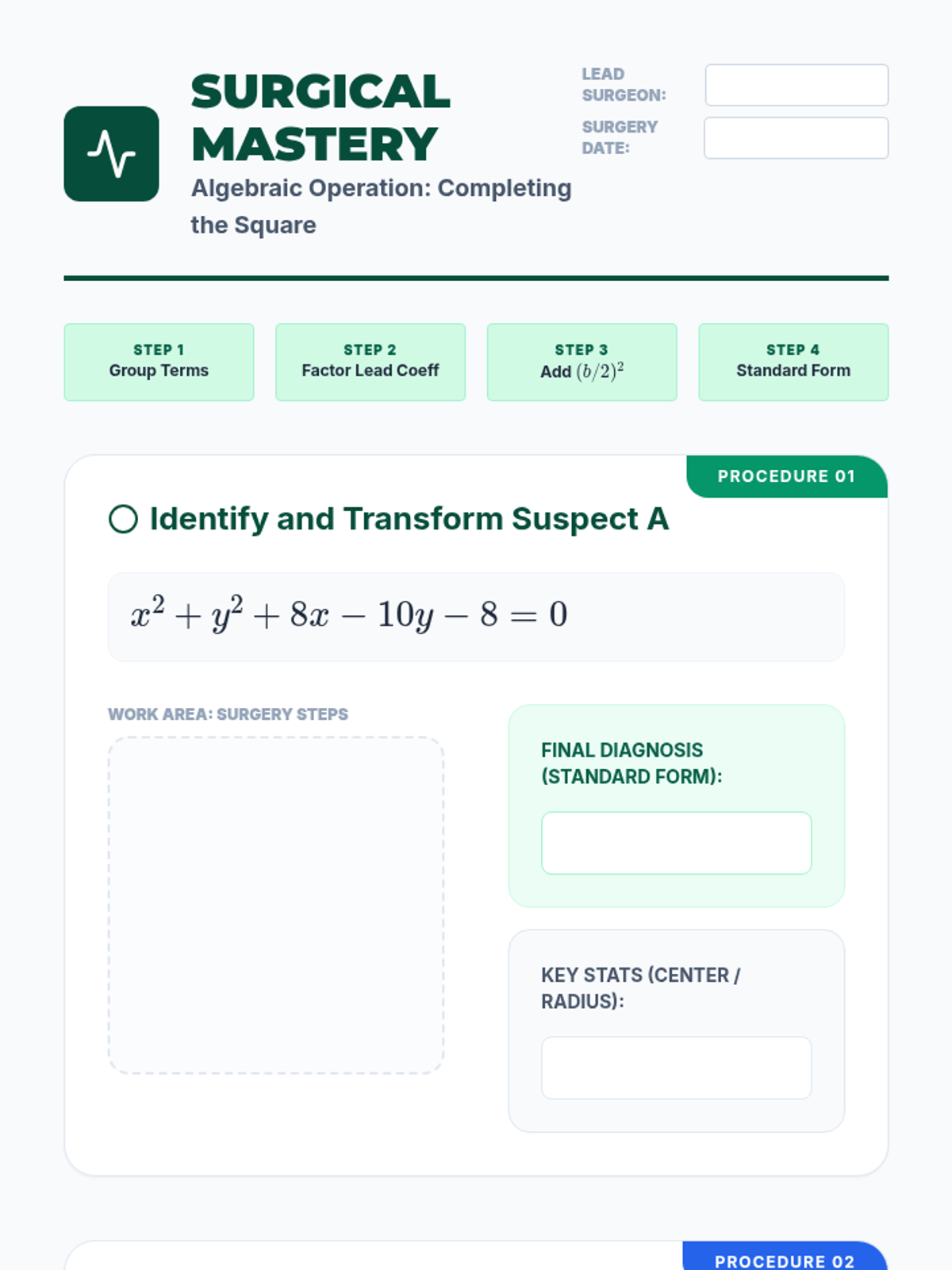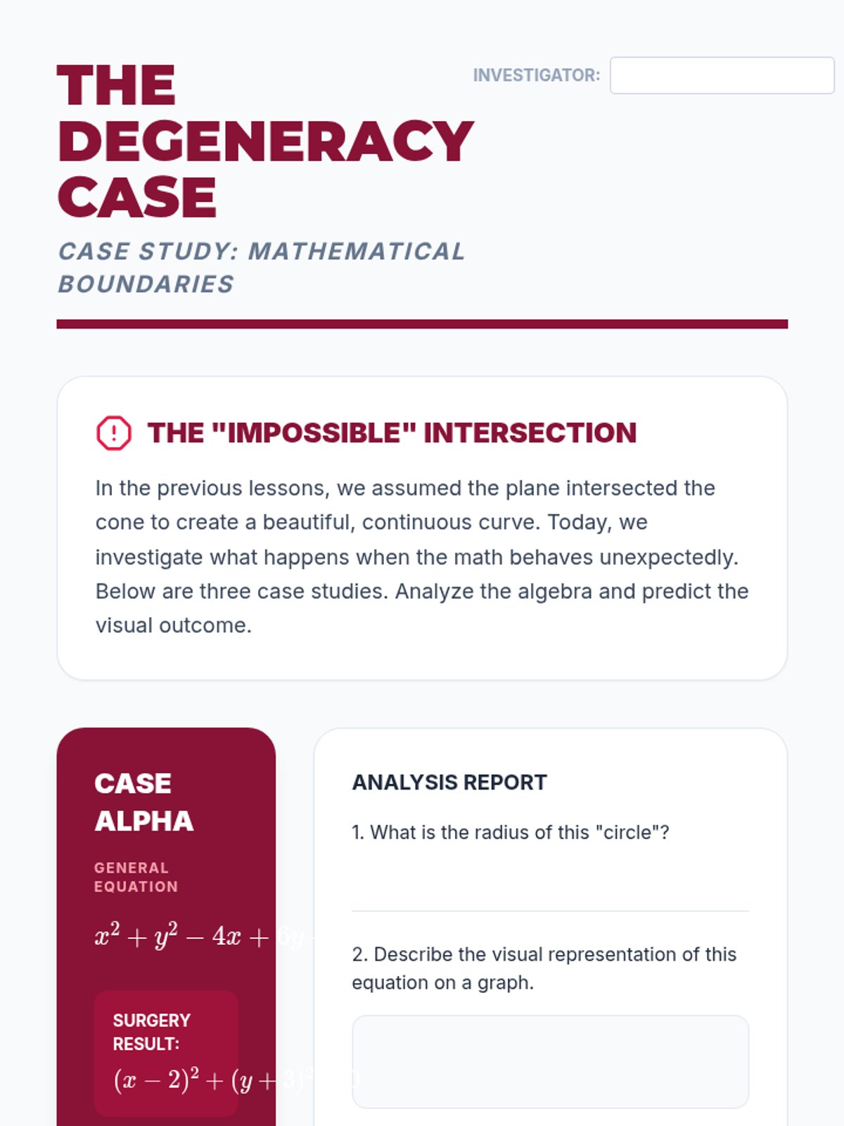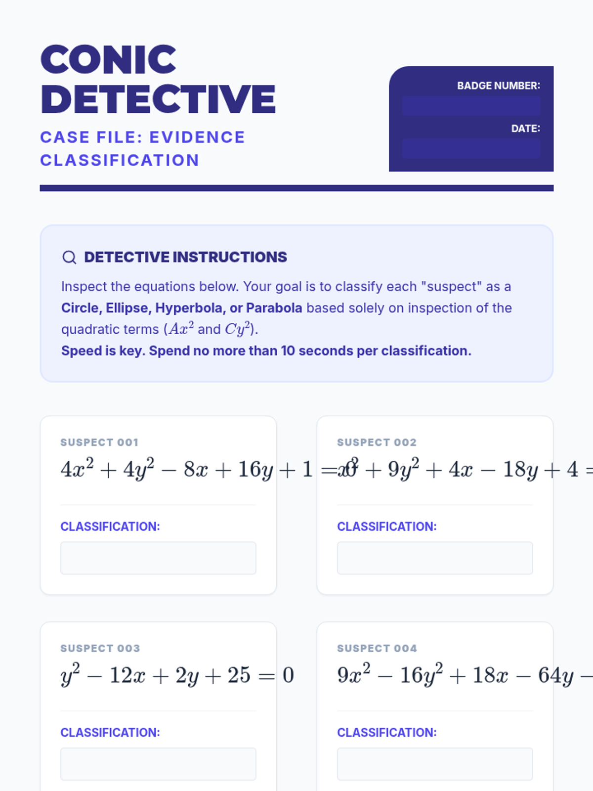 This mastery-based sequence focuses on the synthesis of all conic sections. Students learn to manipulate the General Second-Degree Equation to classify curves and transform them into standard forms.