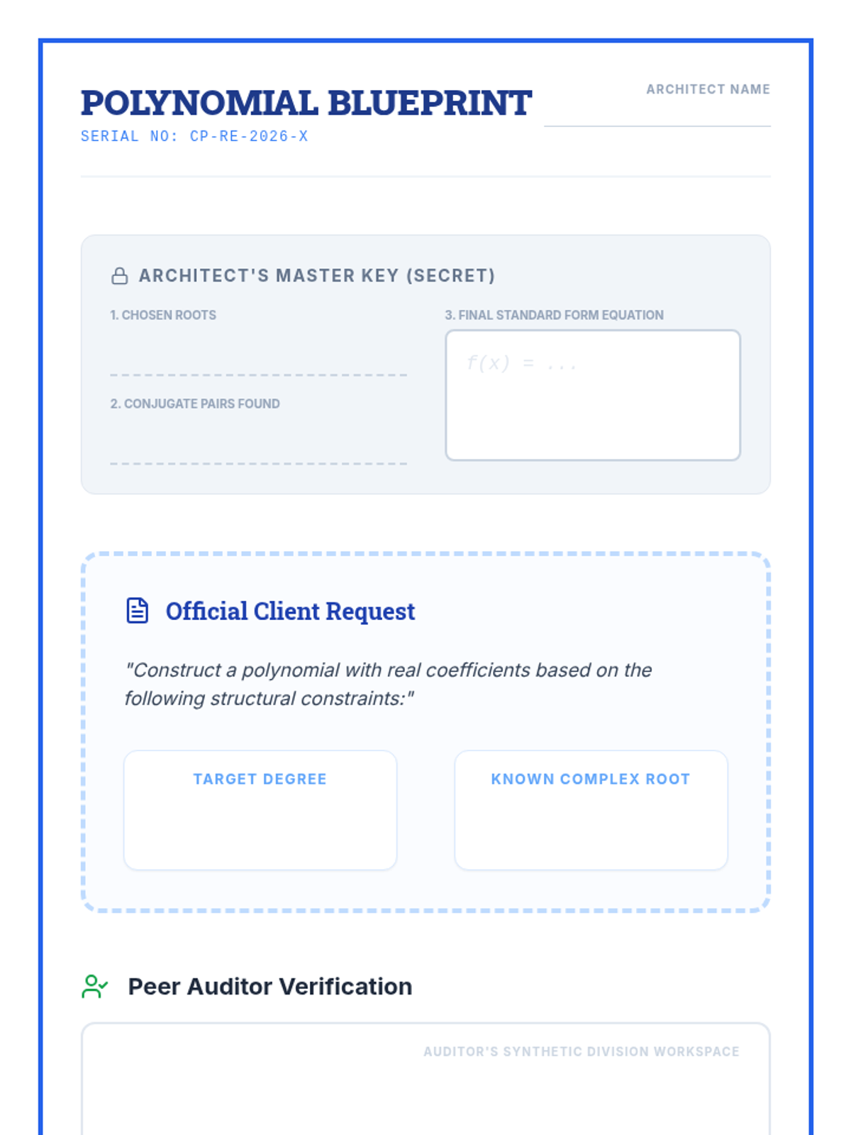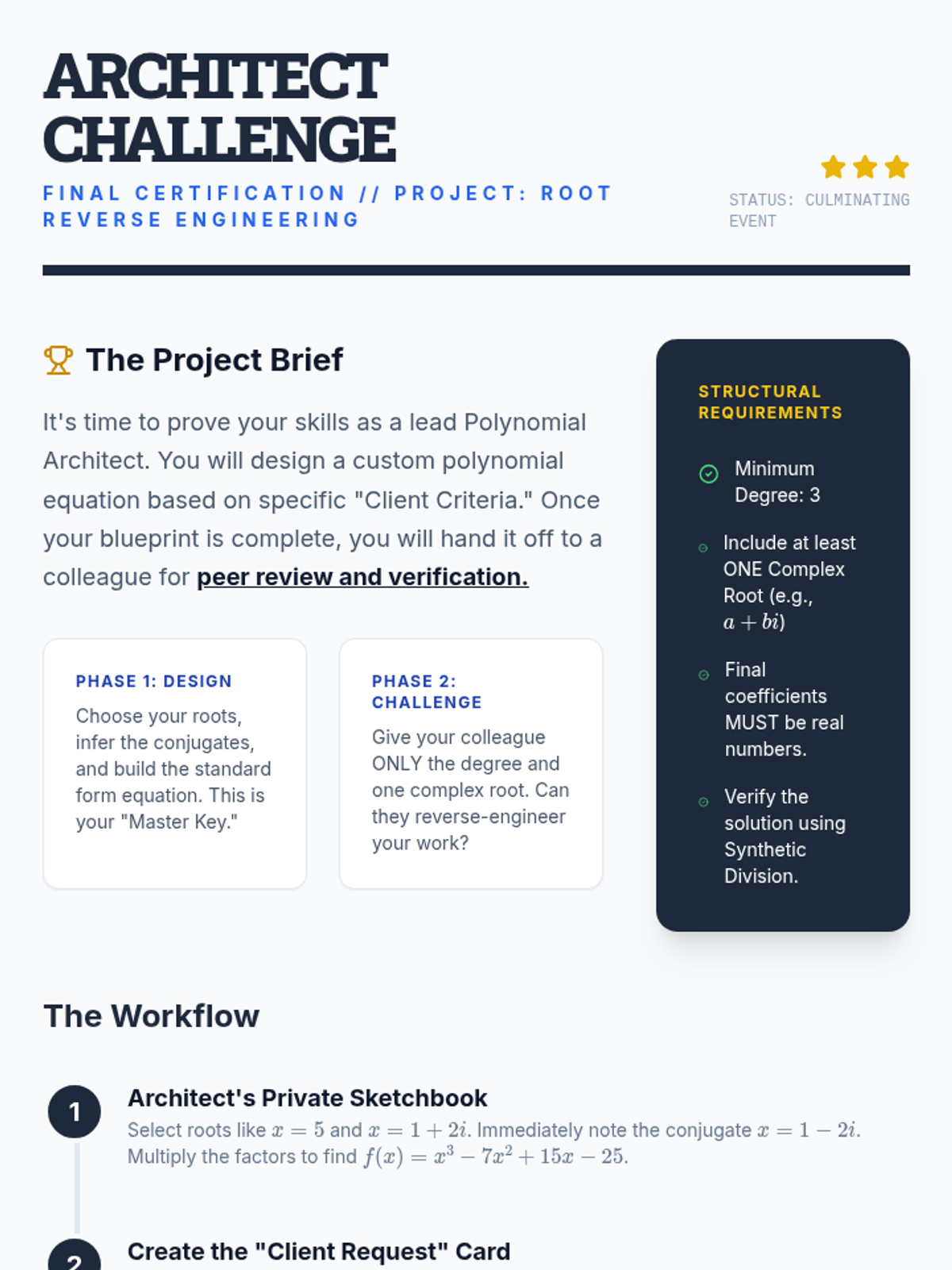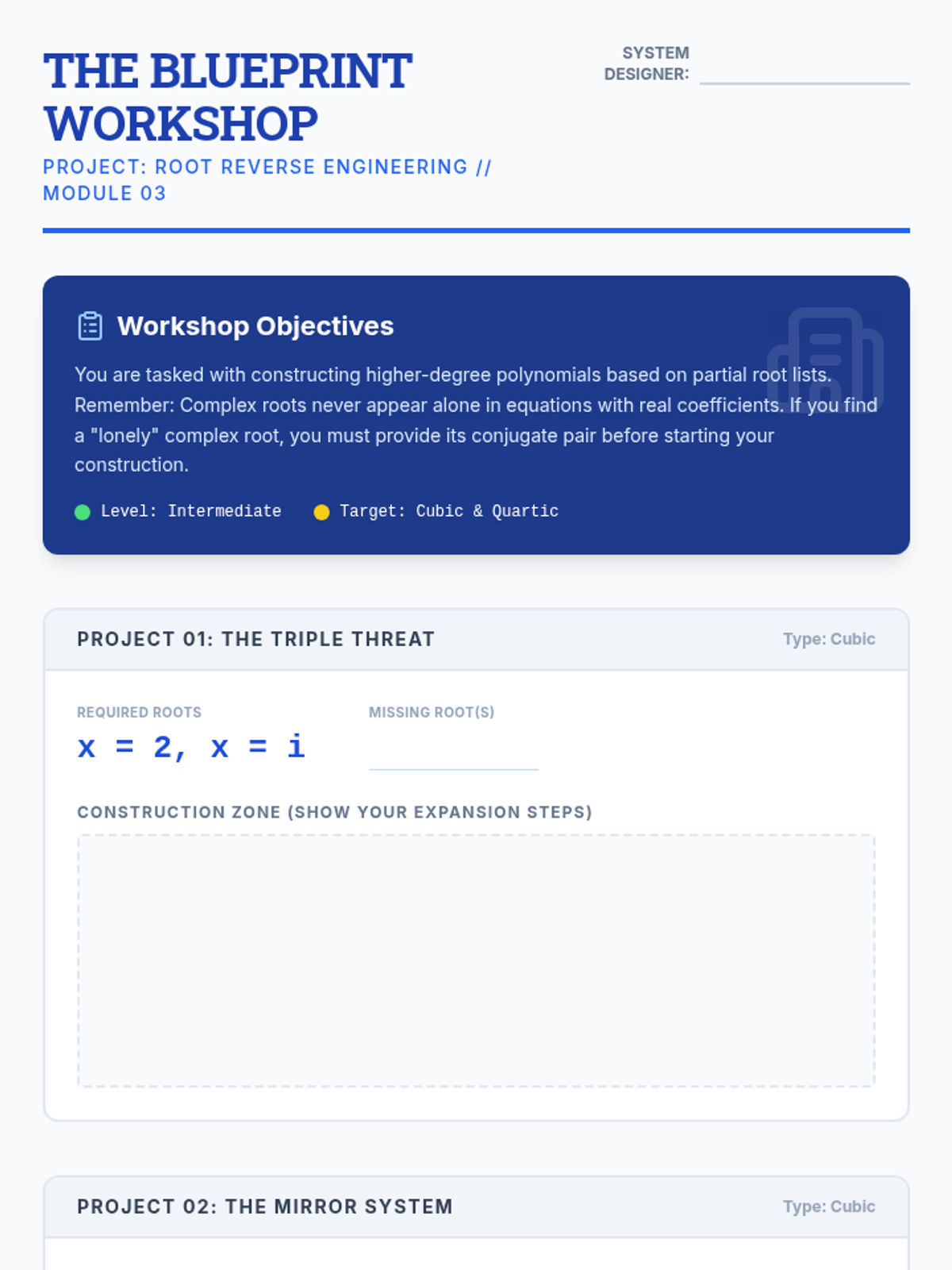 This sequence teaches students to reverse-engineer polynomials using the Complex Conjugate Root Theorem, moving from discovery to construction and verification of higher-degree equations.