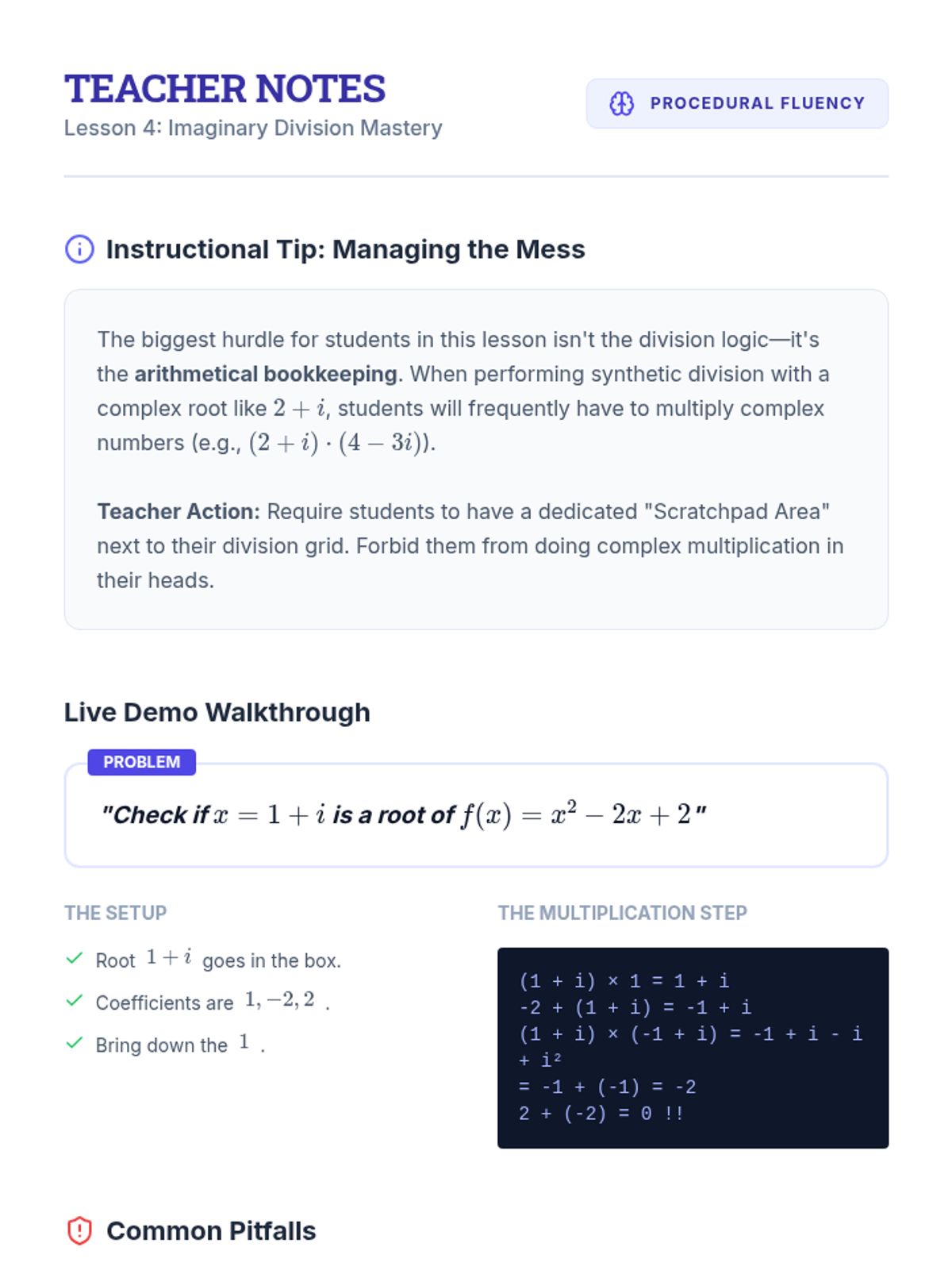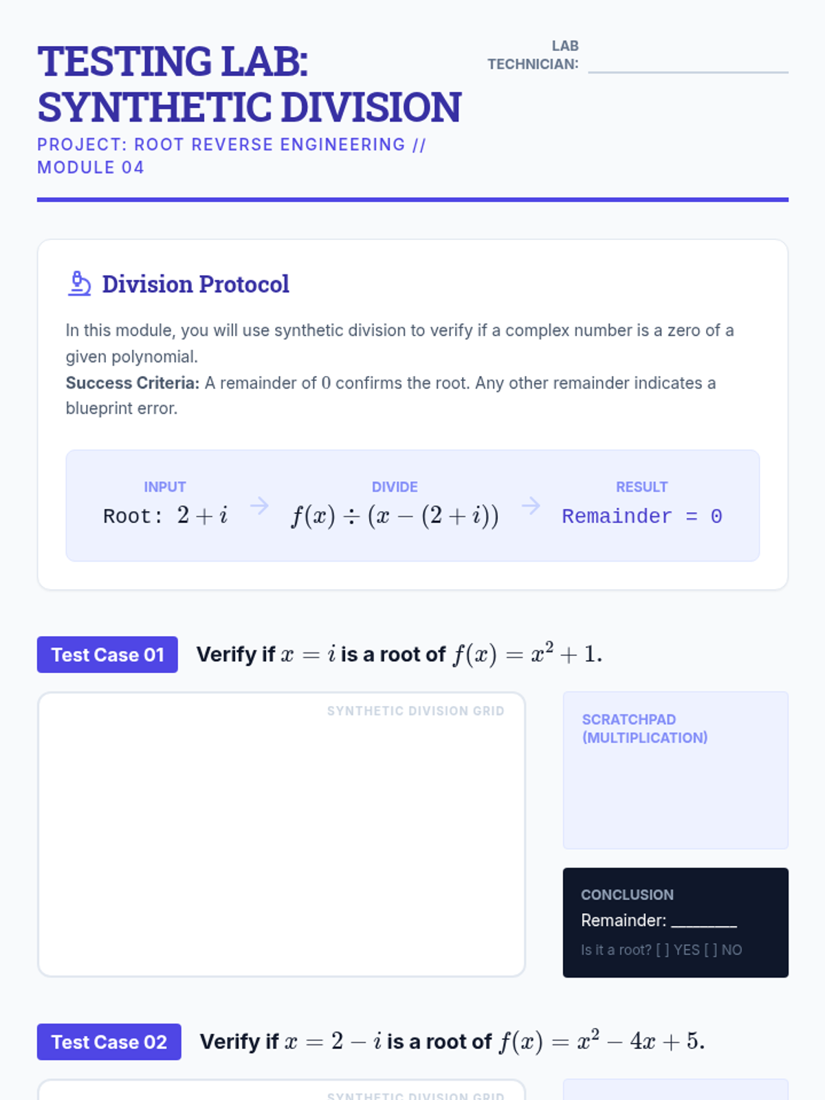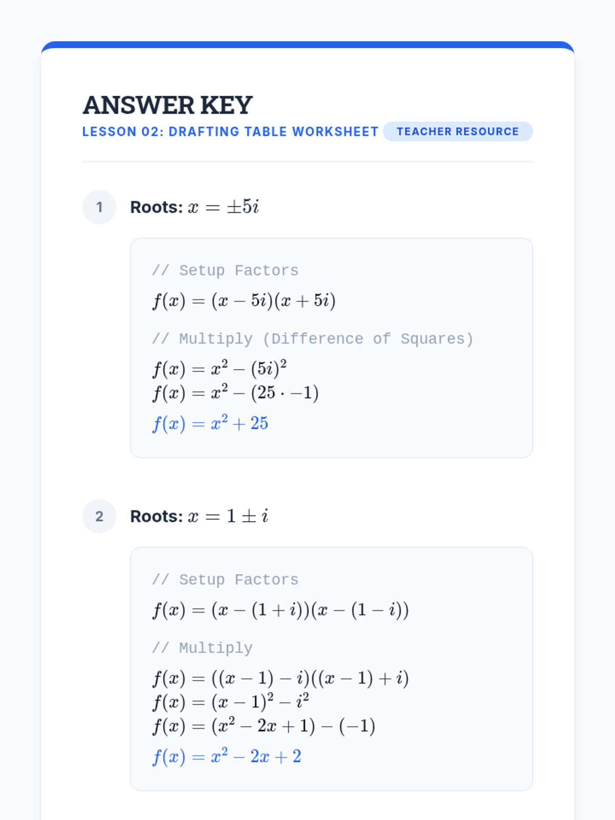 This sequence teaches students to reverse-engineer polynomials using the Complex Conjugate Root Theorem, moving from discovery to construction and verification of higher-degree equations.