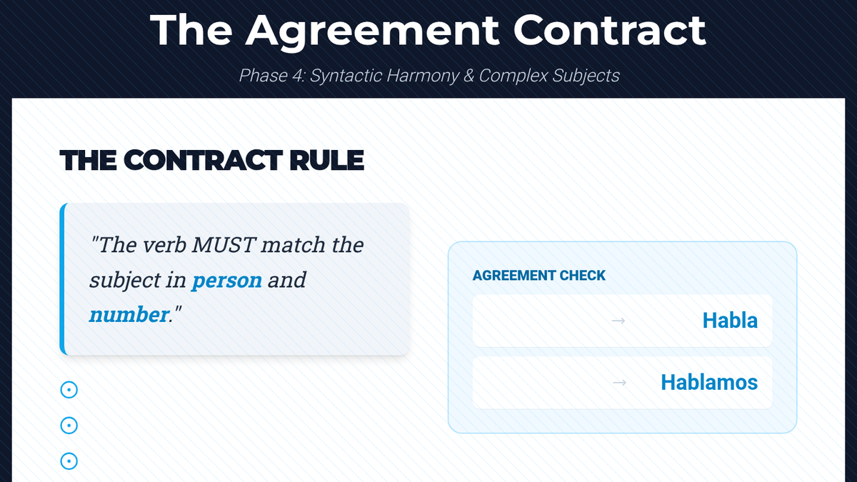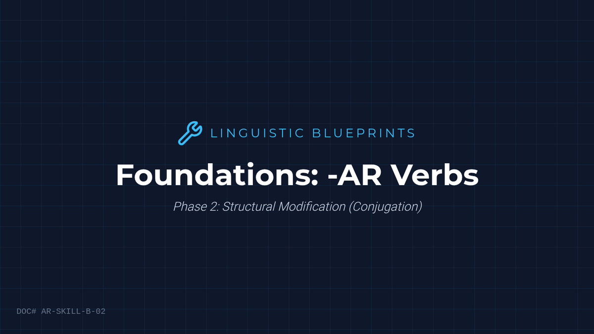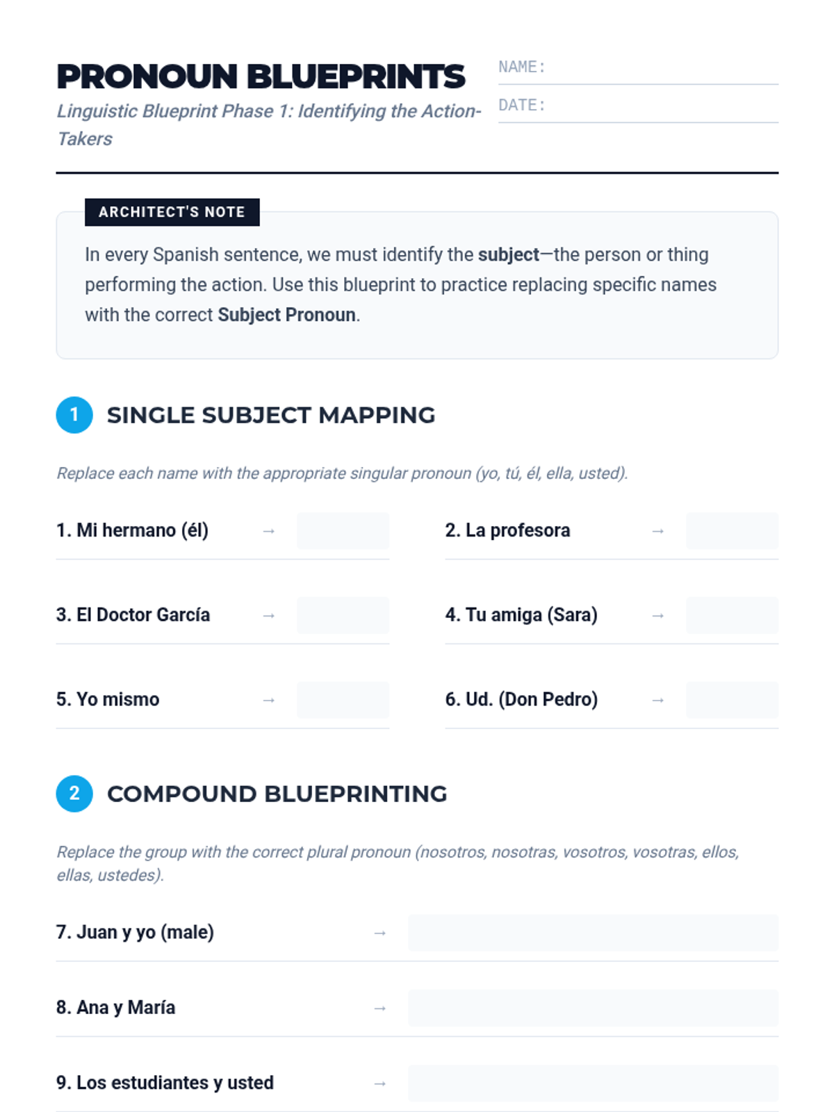 A comprehensive unit on Spanish present tense conjugation for 10th-grade students. This sequence covers subject pronouns, regular verb endings for -AR, -ER, and -IR verbs, and subject-verb agreement in complex sentences, using an architectural 'Linguistic Blueprint' theme.