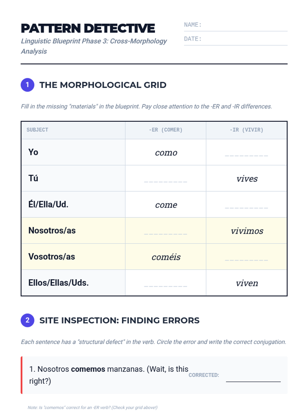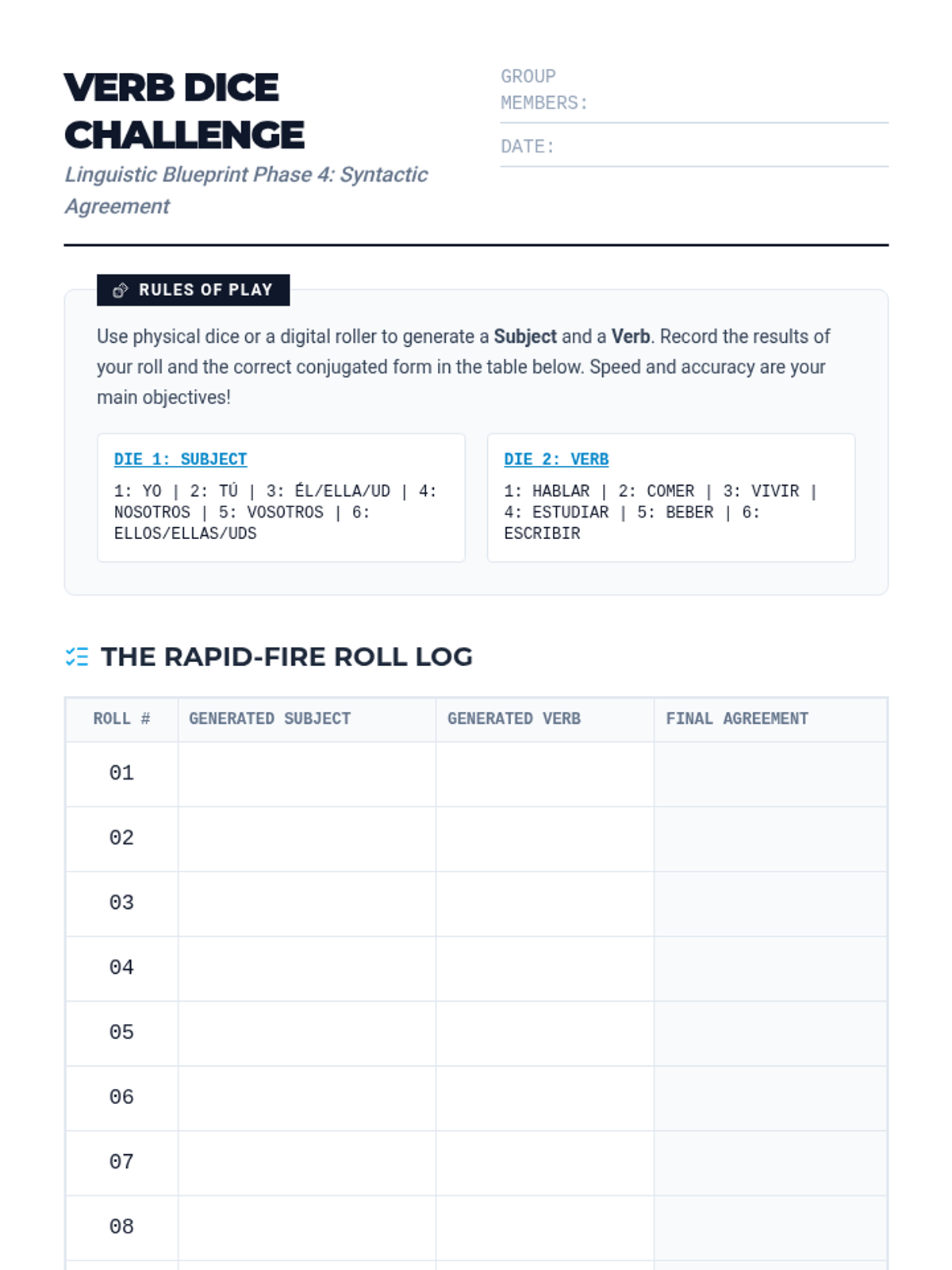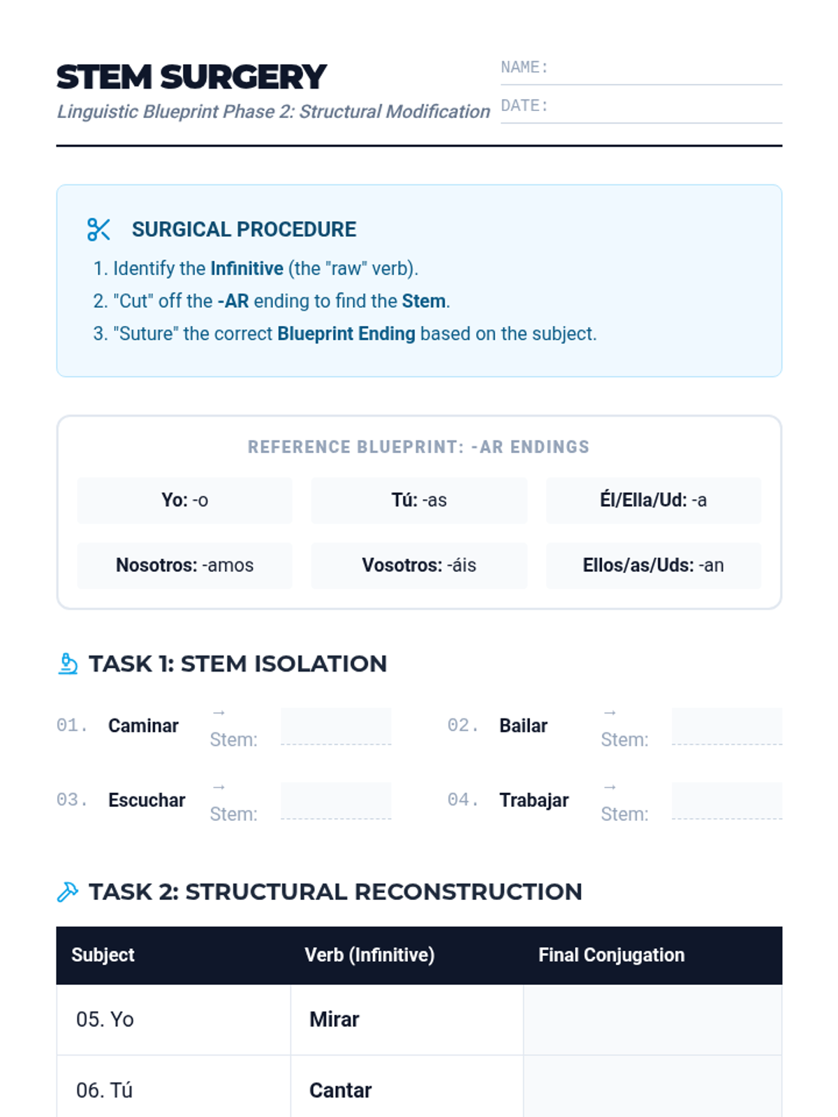 A comprehensive unit on Spanish present tense conjugation for 10th-grade students. This sequence covers subject pronouns, regular verb endings for -AR, -ER, and -IR verbs, and subject-verb agreement in complex sentences, using an architectural 'Linguistic Blueprint' theme.