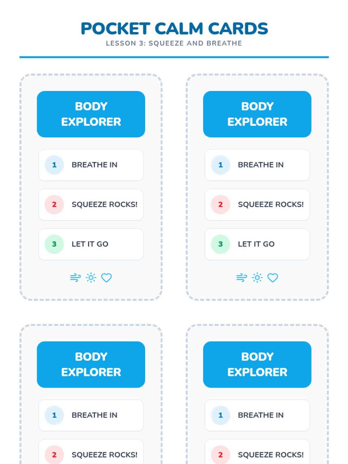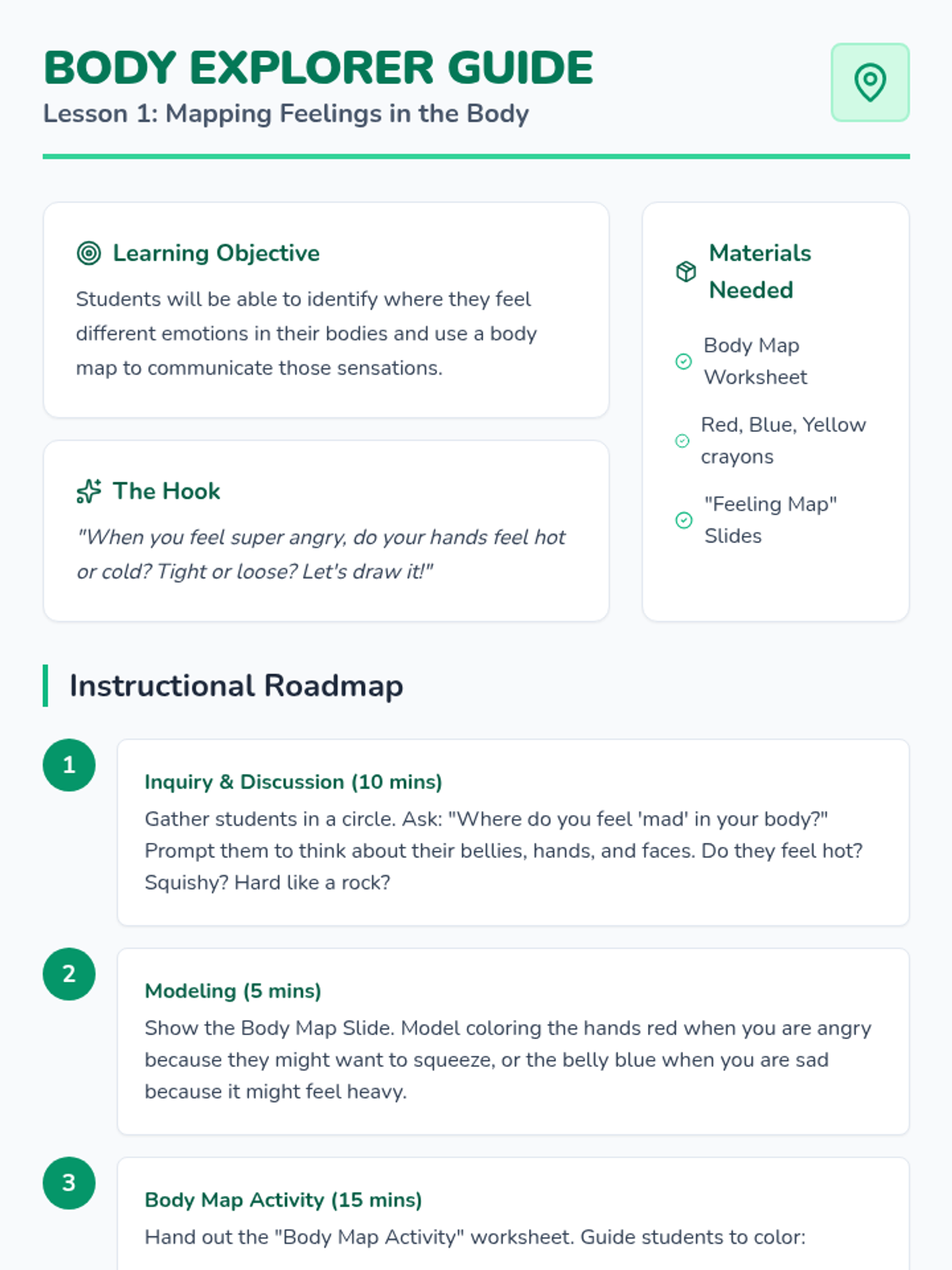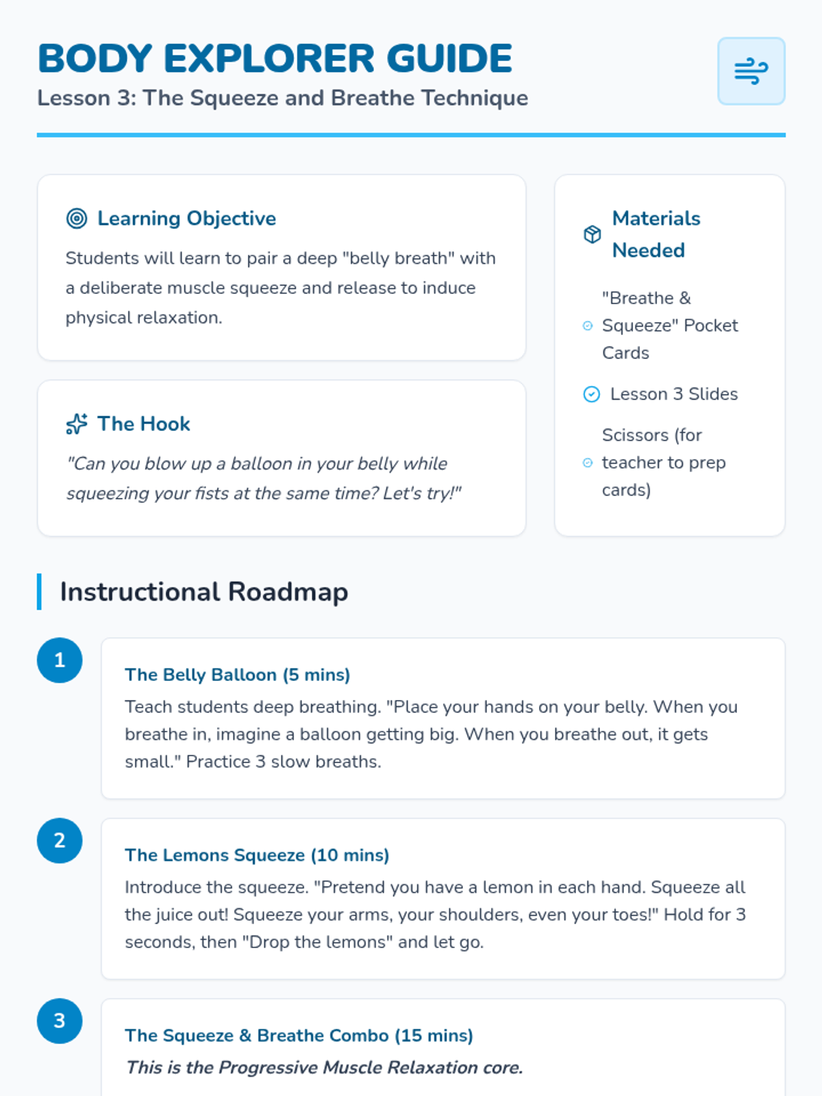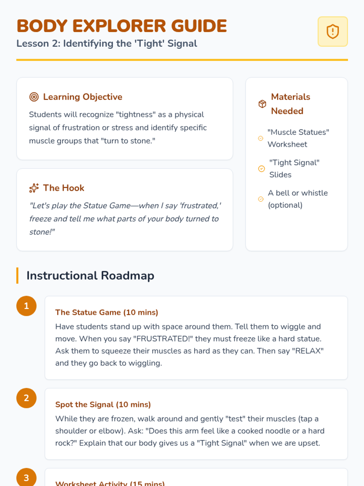This Kindergarten sequence helps students connect physical sensations to emotions. By learning to identify 'tight' signals and practicing Progressive Muscle Relaxation (PMR), students develop tools for emotional regulation and self-awareness.