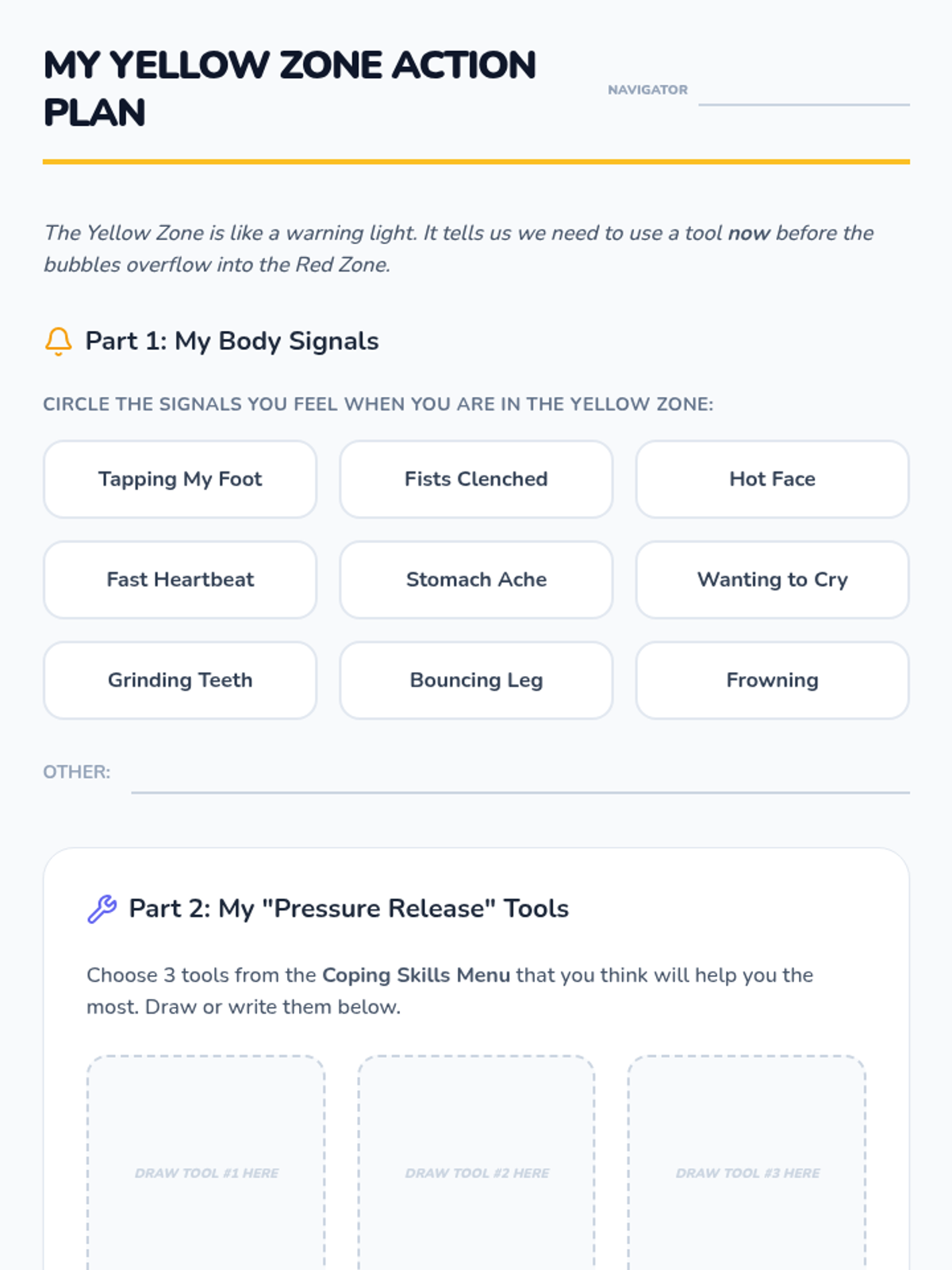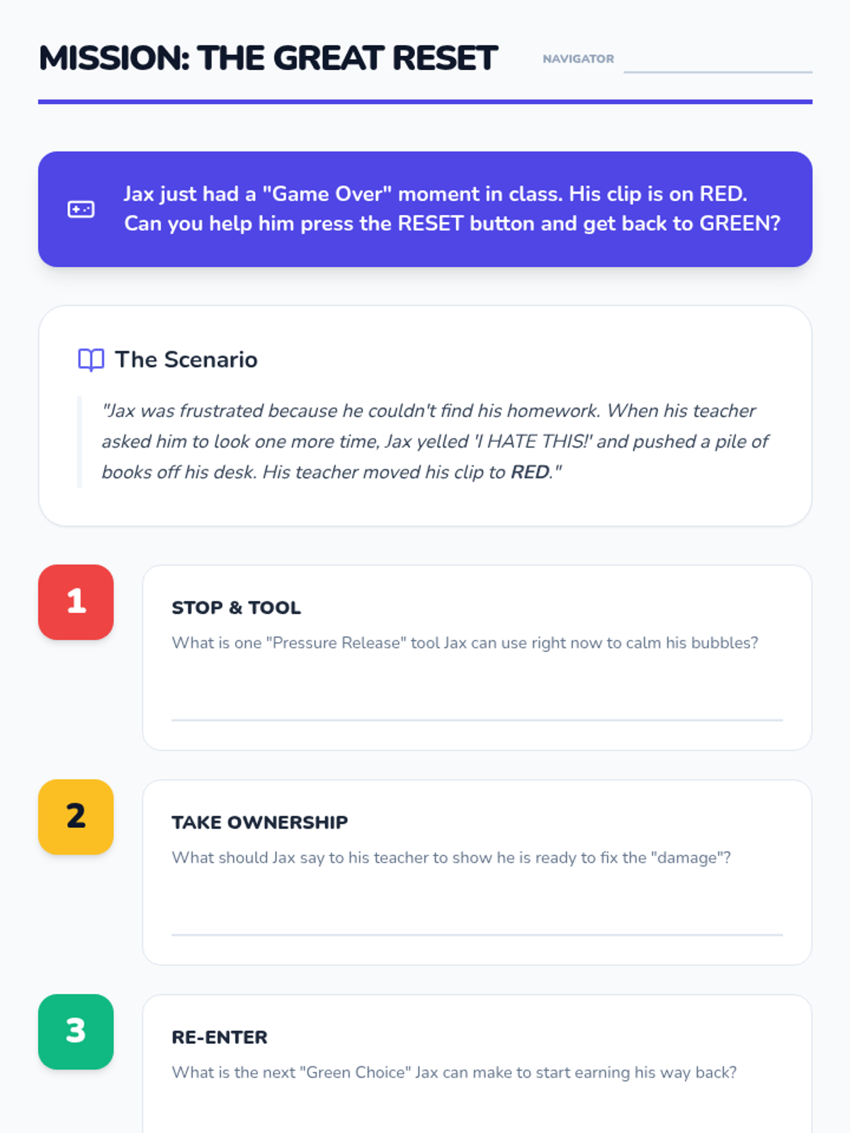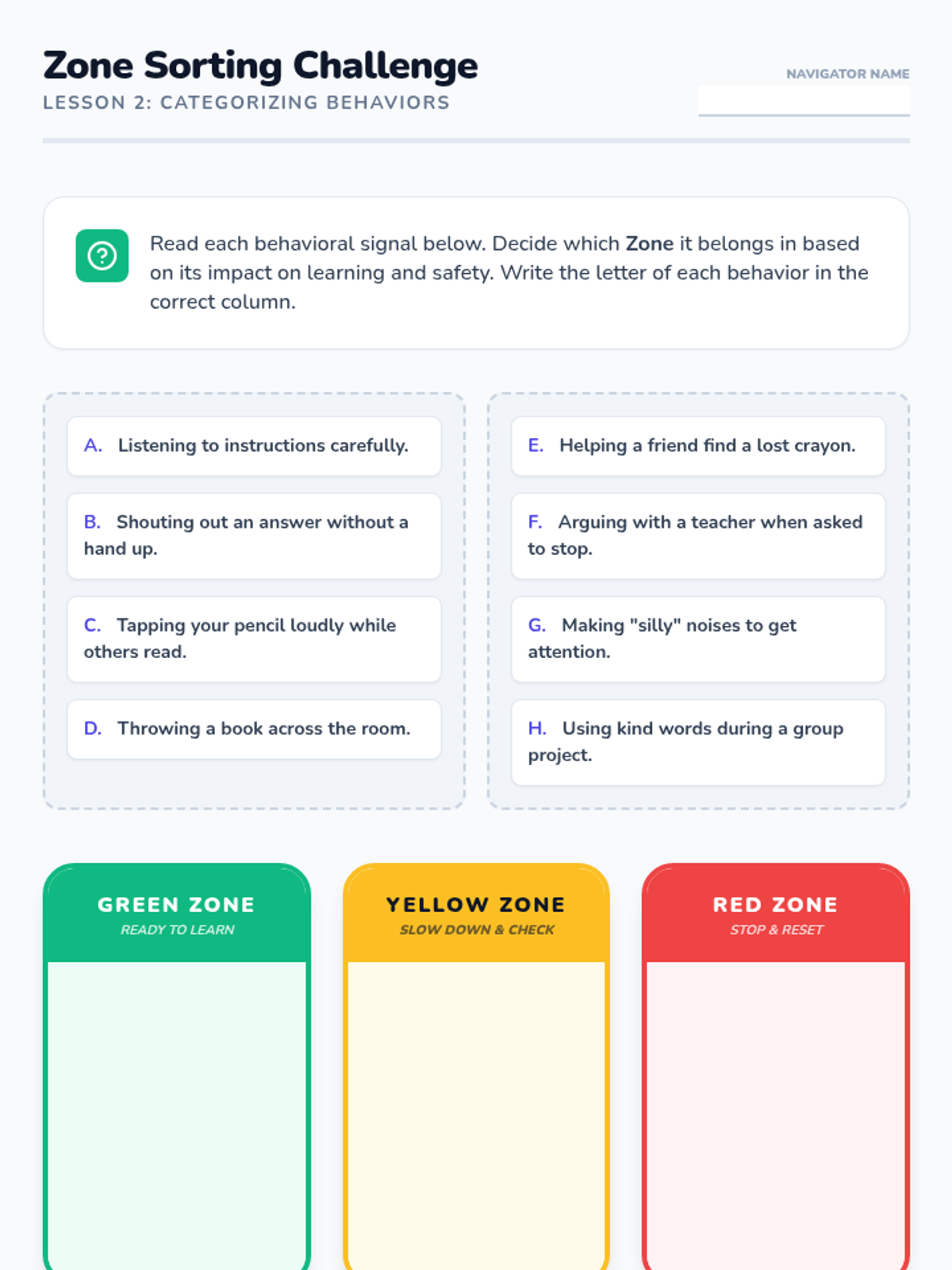 A 5-lesson unit for 3rd grade students focusing on the emotional regulation behind behavior tracking systems. Students learn to map internal feelings to external behaviors, categorize actions into color zones, develop 'Yellow Zone' coping strategies, and practice the mindset of a 'reset' for emotional growth.