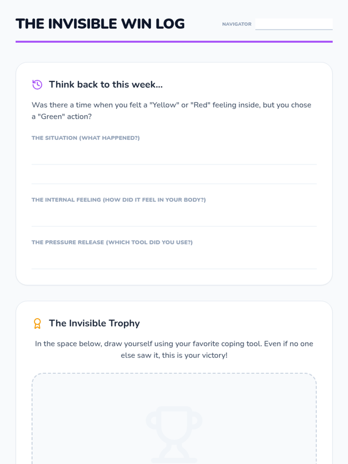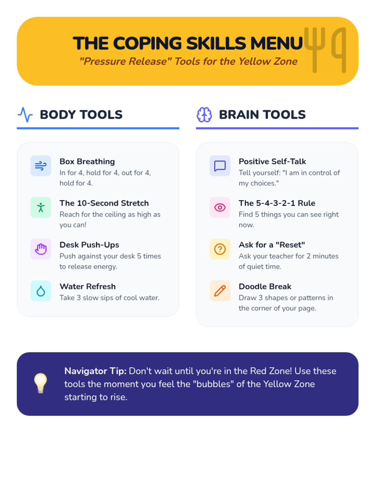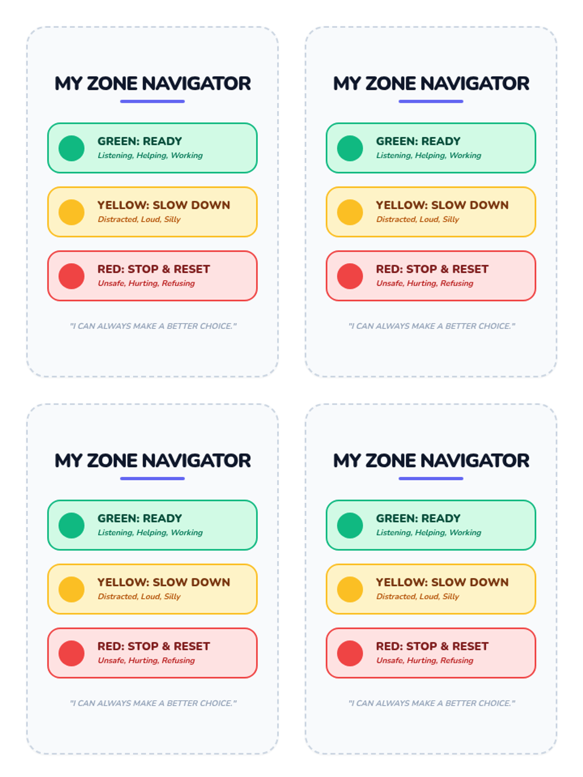 A 5-lesson unit for 3rd grade students focusing on the emotional regulation behind behavior tracking systems. Students learn to map internal feelings to external behaviors, categorize actions into color zones, develop 'Yellow Zone' coping strategies, and practice the mindset of a 'reset' for emotional growth.