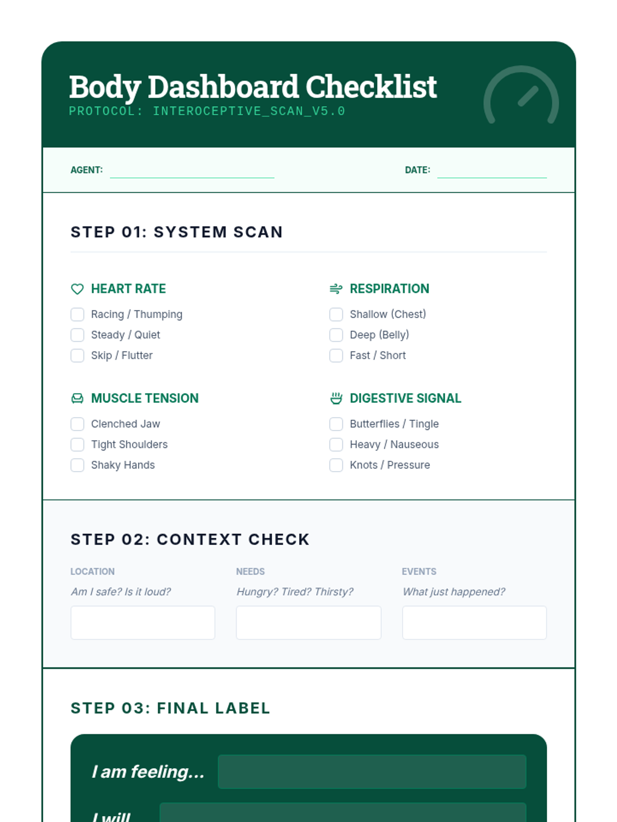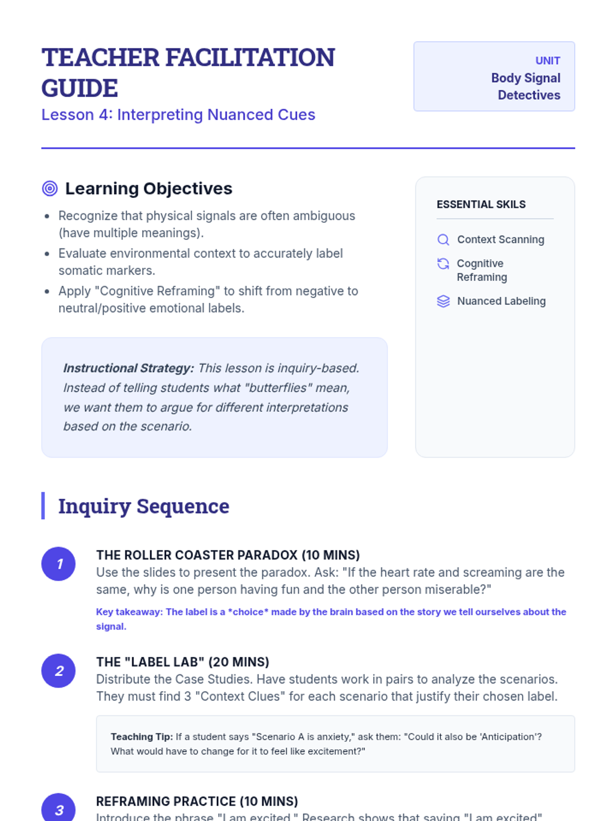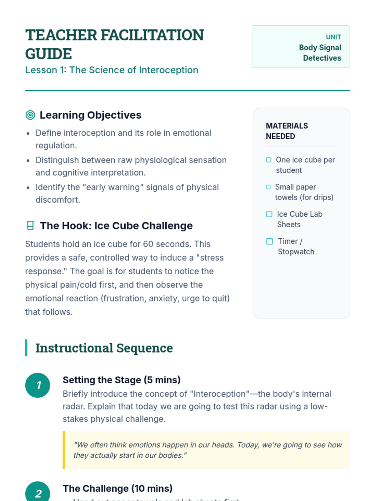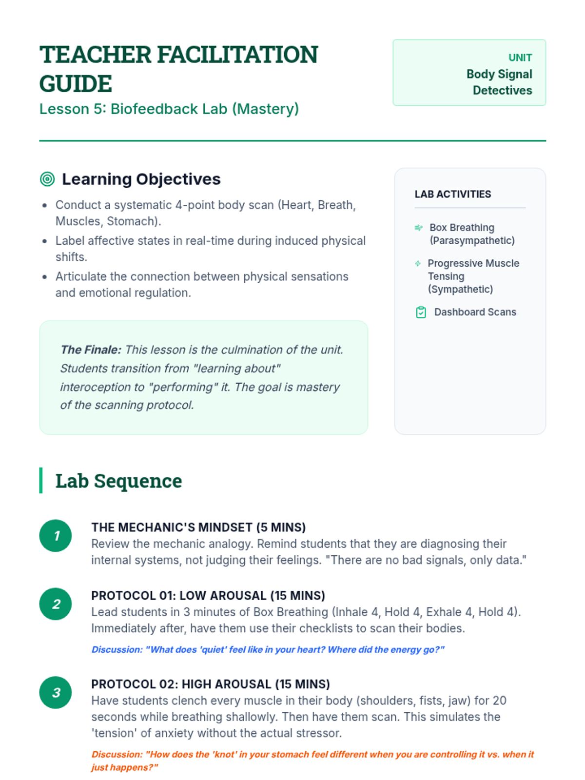 This sequence bridges the gap between biology and psychology by focusing on the somatic (physical) markers of emotion. Students investigate interoception to identify emotions before they become overwhelming through body mapping and physiological tracking.